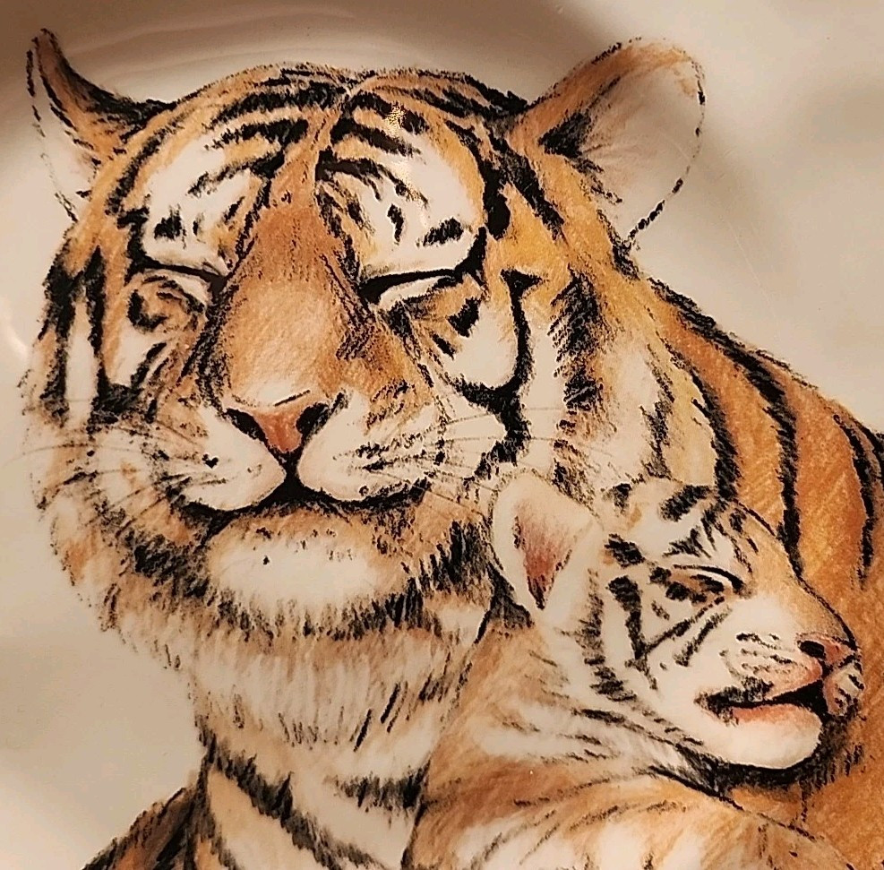 Add a touch of vintage charm to your dining experience with this Pier 1 Tigress & Tiger Cub plate. The round ironstone plate measures 8.75 inches and features a vibrant multicolor tiger pattern. It's perfect for all occasions, whether you're having a salad or a dessert. The plate is also dishwasher and microwave safe, making it a convenient addition to your collection. This plate has a glossy finish and weighs 15.4 oz. It's a great addition to any decor, with a printed backstamp and care instructions. Machine washable up to 100°F, this plate is a must-have for any Pier 1 collector or animal print enthusiast.