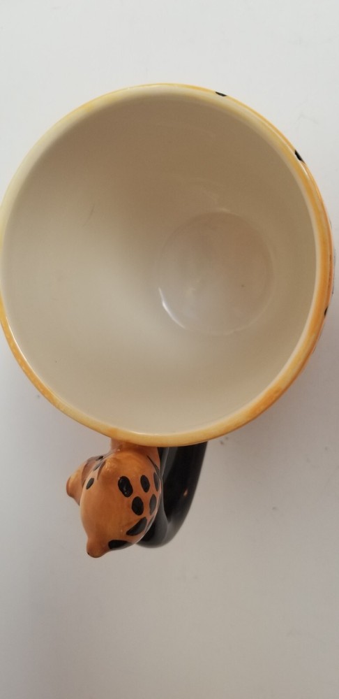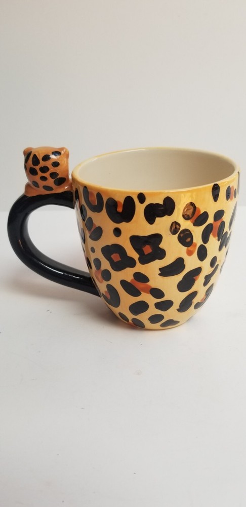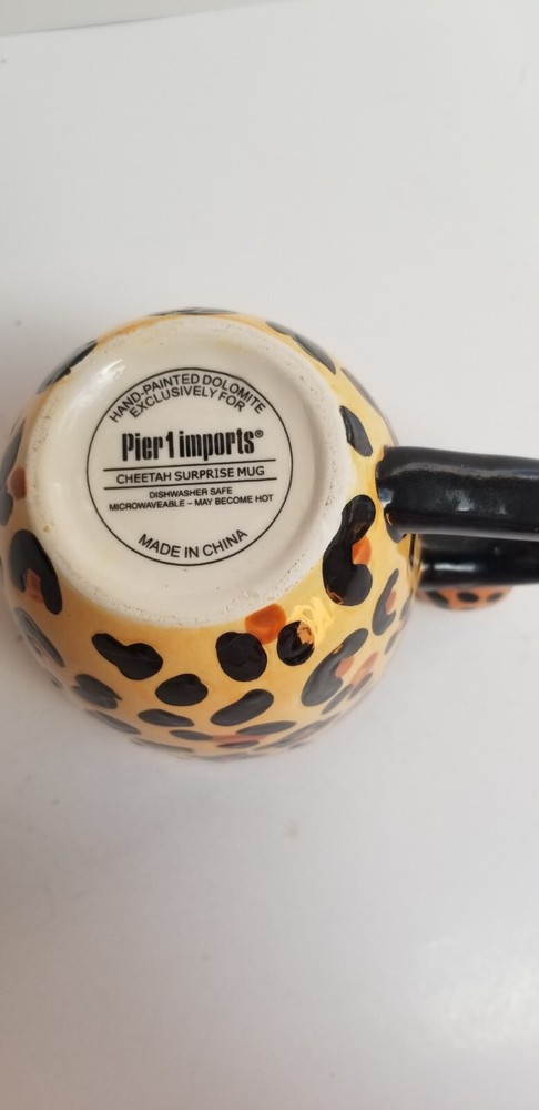 This is a vintage Pier 1 Imports cheetah coffee mug with an animal print design. It is a small 8 oz mug featuring a modern style, suitable for hot or cold beverages. The mug is a collector's item, with a small chip. This licensed reproduction item is from China, showcasing a multicolor cheetah pattern, making it a unique and stylish addition to any collection.