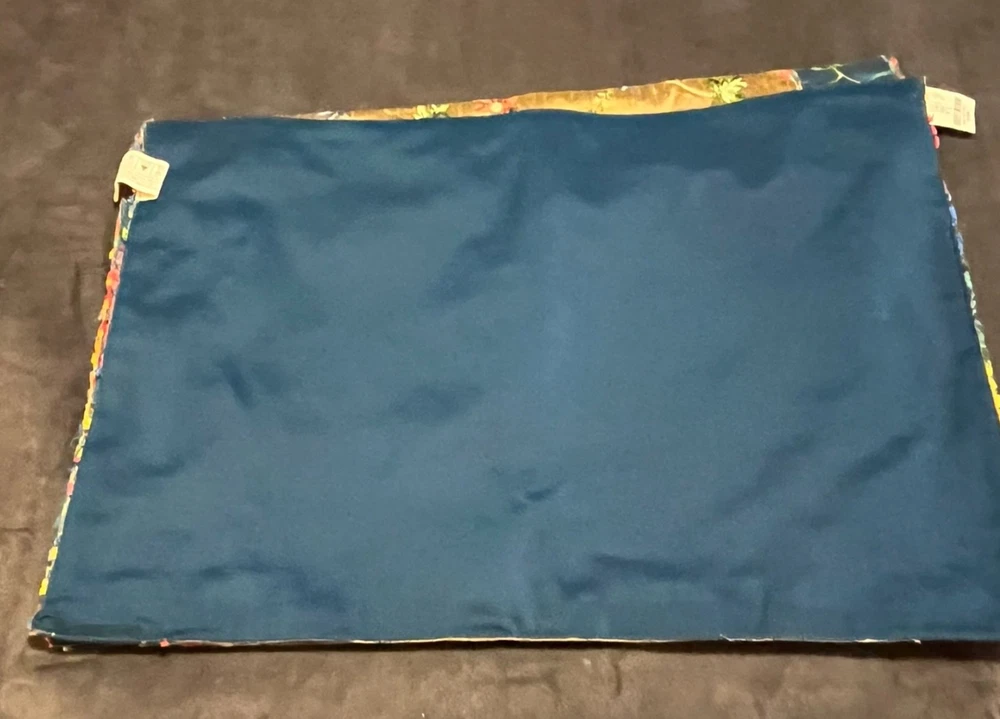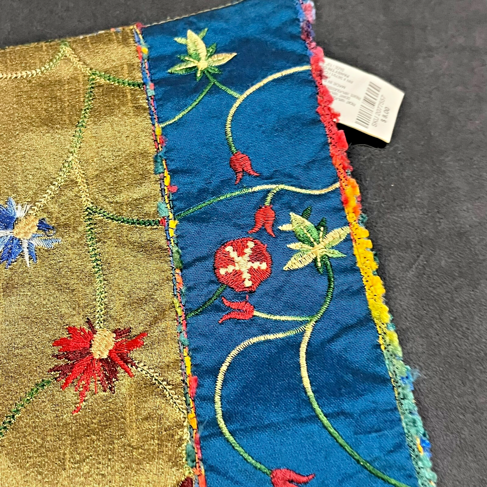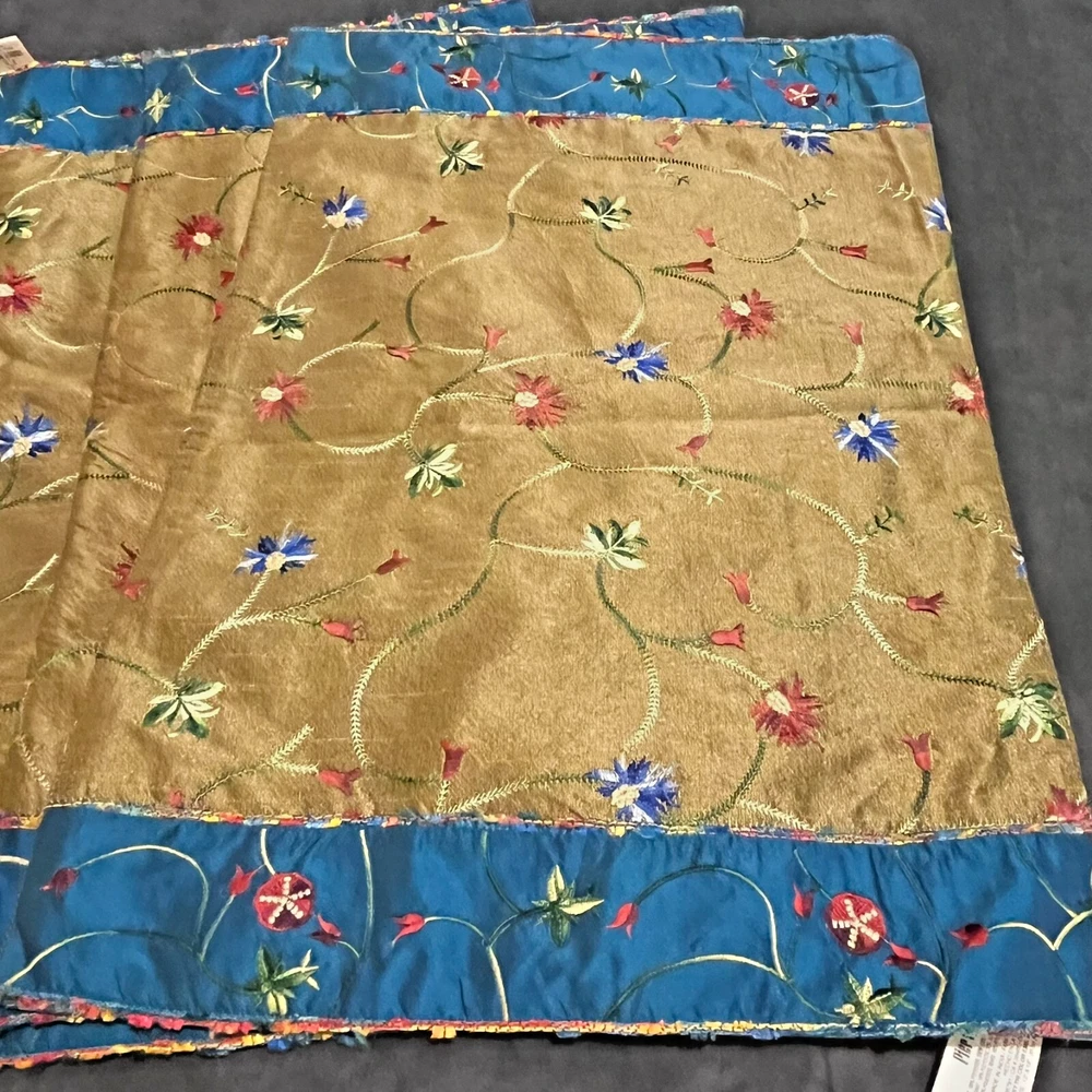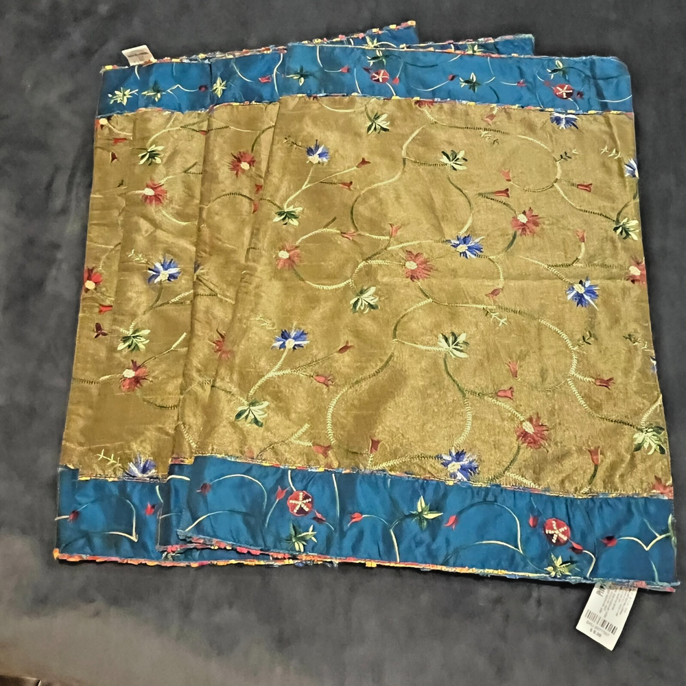 Vintage Pier One placemats Set of 4 Measure 19" x 13" 100% polyester Gold/blue Beautiful flower embroidery Blue backing Hand wash only Colorful edging "Pansy Tri Color" pattern Bright vibrant colors! Some natural variations in woven cloth Good used condition. No rips, tears or stains. A few loose threads. See photos! Color representation may slightly differ due to variations in lighting conditions. Thanks for supporting my small business!