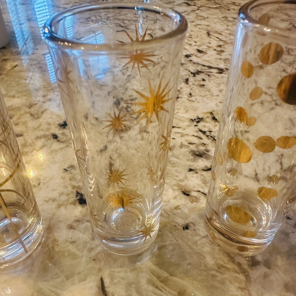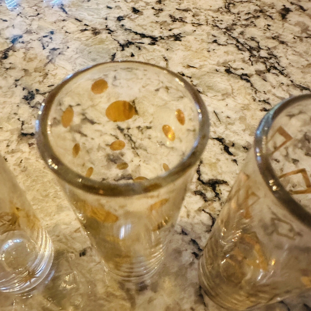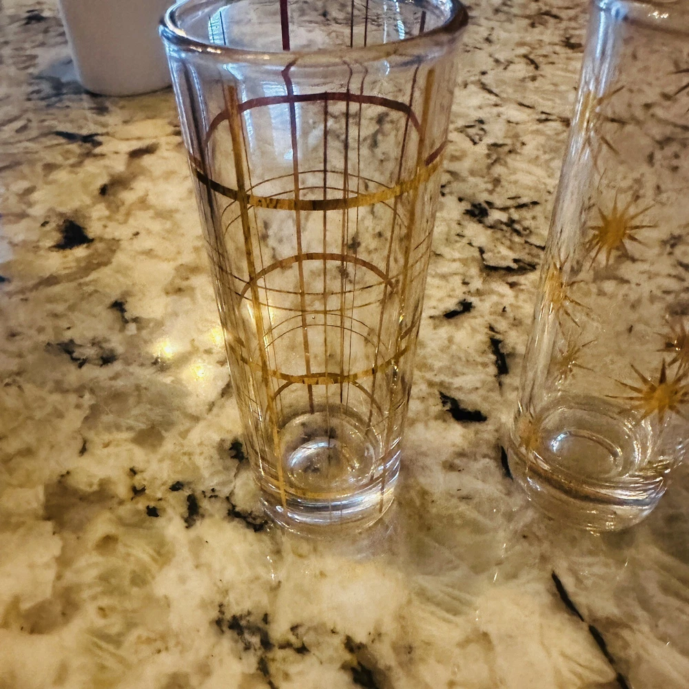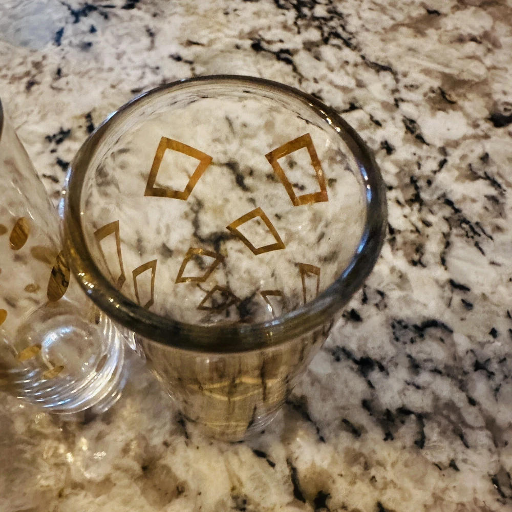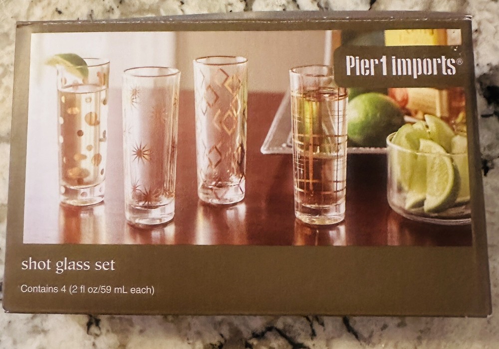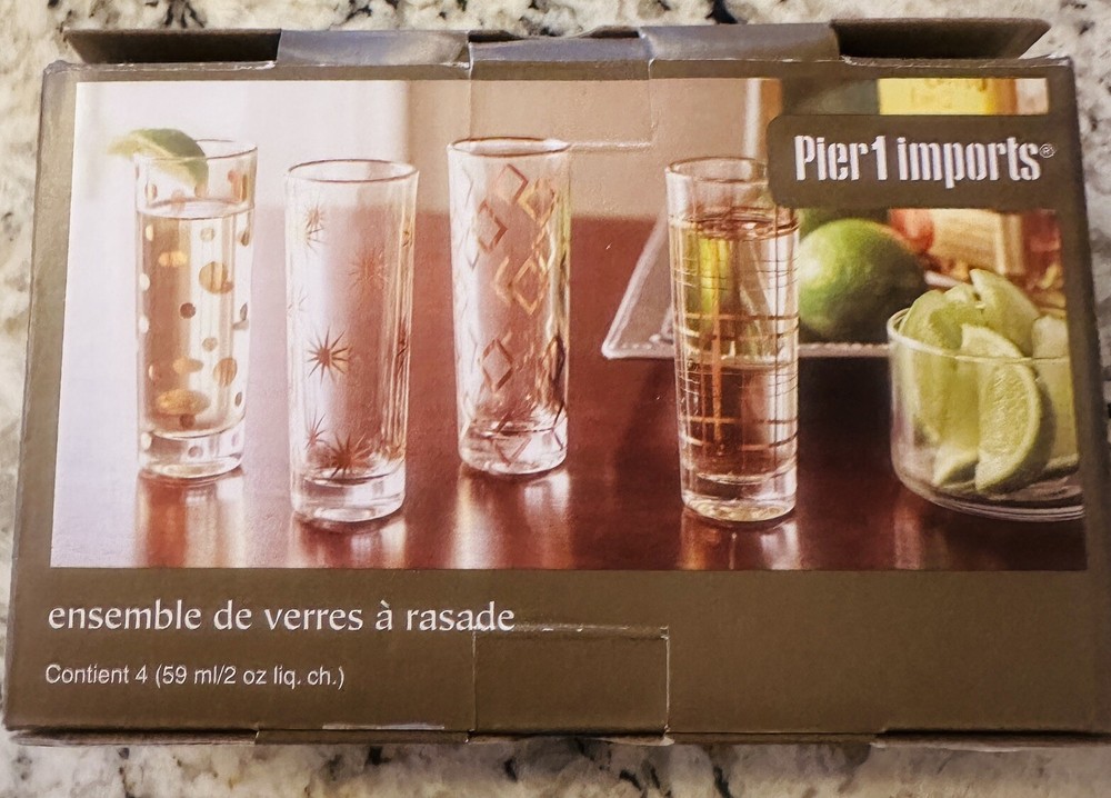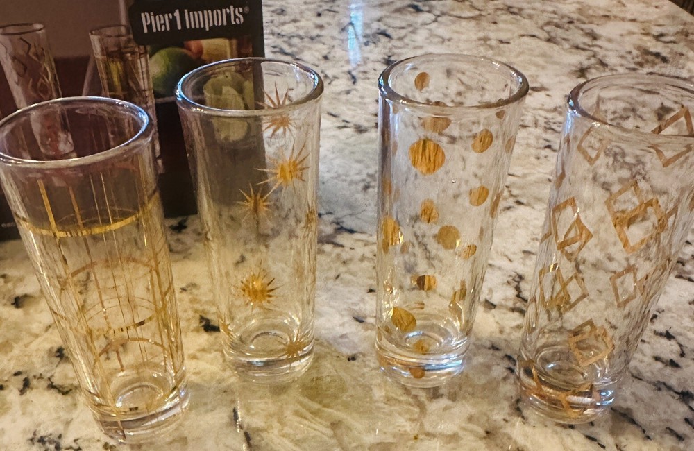 Elevate your barware collection with this set of four vintage Pier One shot glasses. Each glass features a unique gold design on clear glass, perfect for any occasion. Crafted with high-quality glass material, these shot glasses are perfect for serving your favorite cold beverages. The set includes four shot glasses, making it an ideal choice for entertaining family and friends. The glasses are also perfect for collectors who appreciate vintage barware. Add a touch of sophistication to your home bar with these stylish shot glasses. New in box Only opened box To take Photos Box appears to be numbered on bottom 450/4506