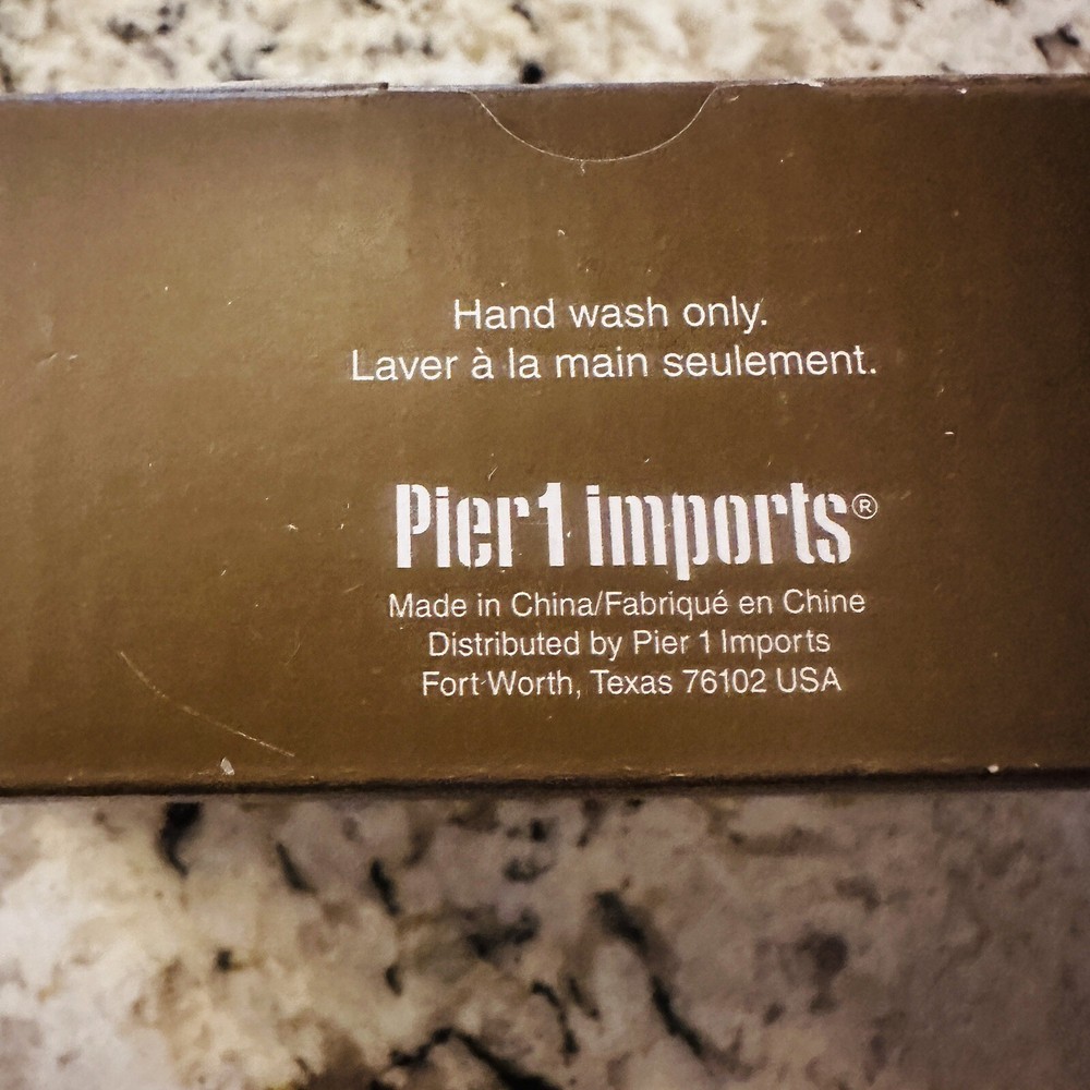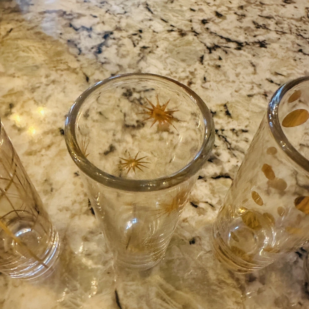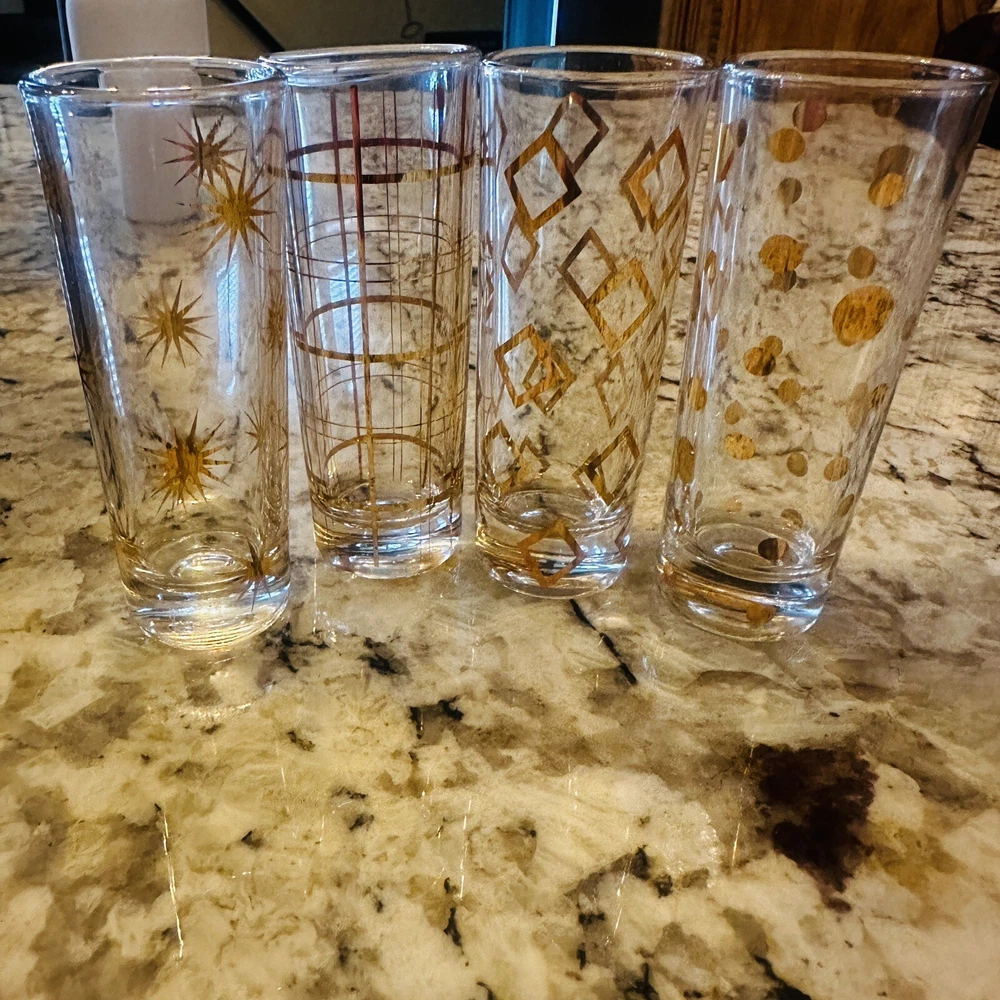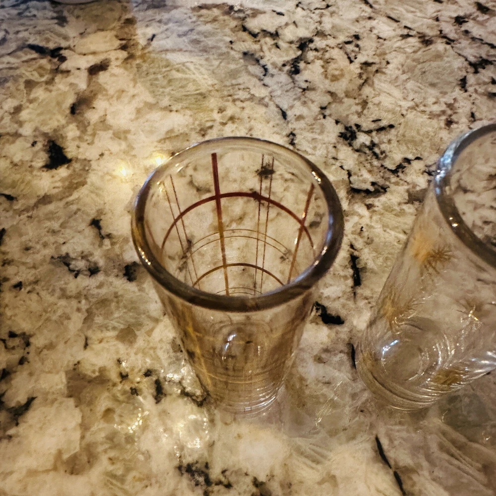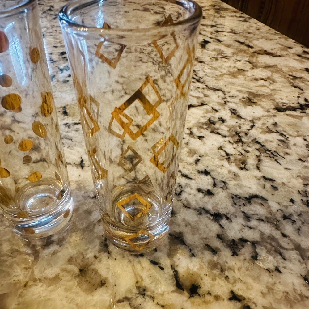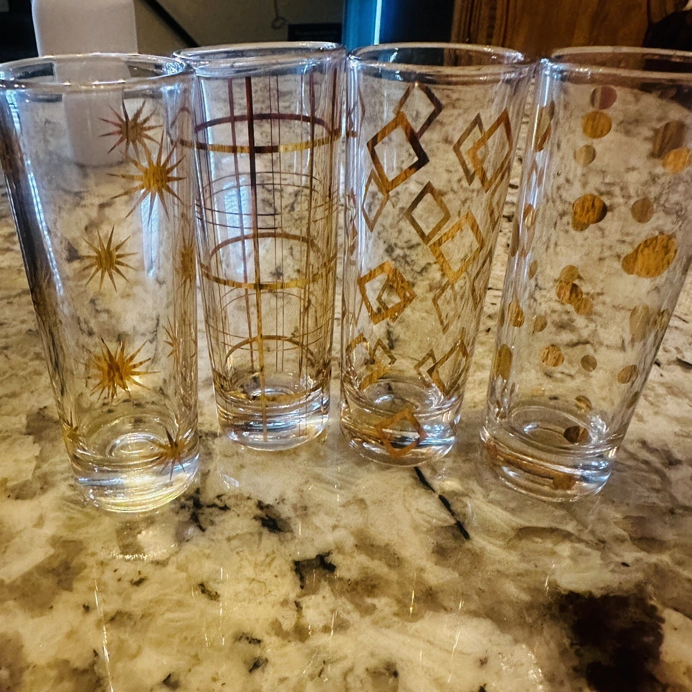 Elevate your barware collection with this set of four vintage Pier One shot glasses. Each glass features a unique gold design on clear glass, perfect for any occasion. Crafted with high-quality glass material, these shot glasses are perfect for serving your favorite cold beverages. The set includes four shot glasses, making it an ideal choice for entertaining family and friends. The glasses are also perfect for collectors who appreciate vintage barware. Add a touch of sophistication to your home bar with these stylish shot glasses. New in box Only opened box To take Photos Box appears to be numbered on bottom 450/4506