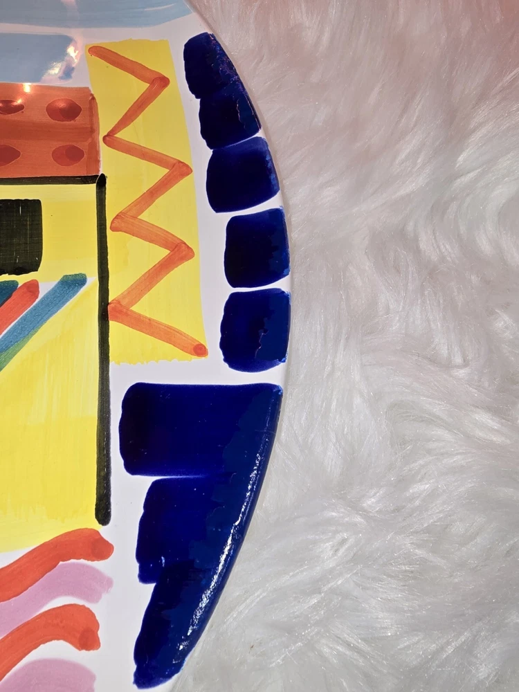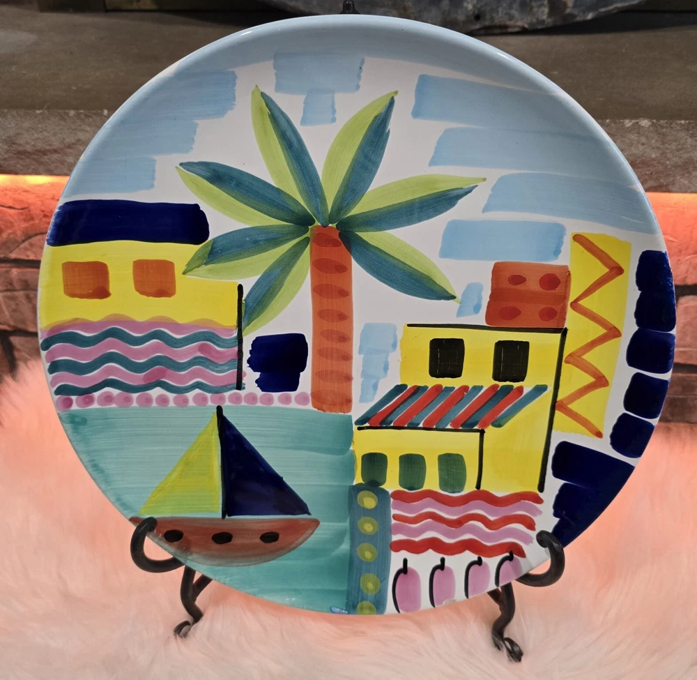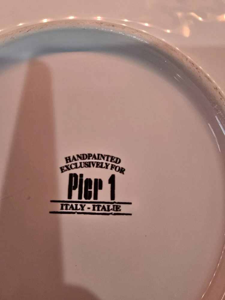 Platter has a couple of small chips on edge as well as some re-done blue touch-ups as shown in pictures. Overall, it's very beautiful and looks lovely on display. This vintage Pier 1 platter is a beautiful addition to any collection. Hand painted in Italy, it features a unique pattern that is sure to impress your guests. Measuring at 14 inches, it's the perfect size for serving your favorite dishes. The platter is made in Italy and features intricate hand-painted details. It's a great example of high-quality craftsmanship and attention to detail. Perfect for those who appreciate the beauty and artistry of vintage decor.