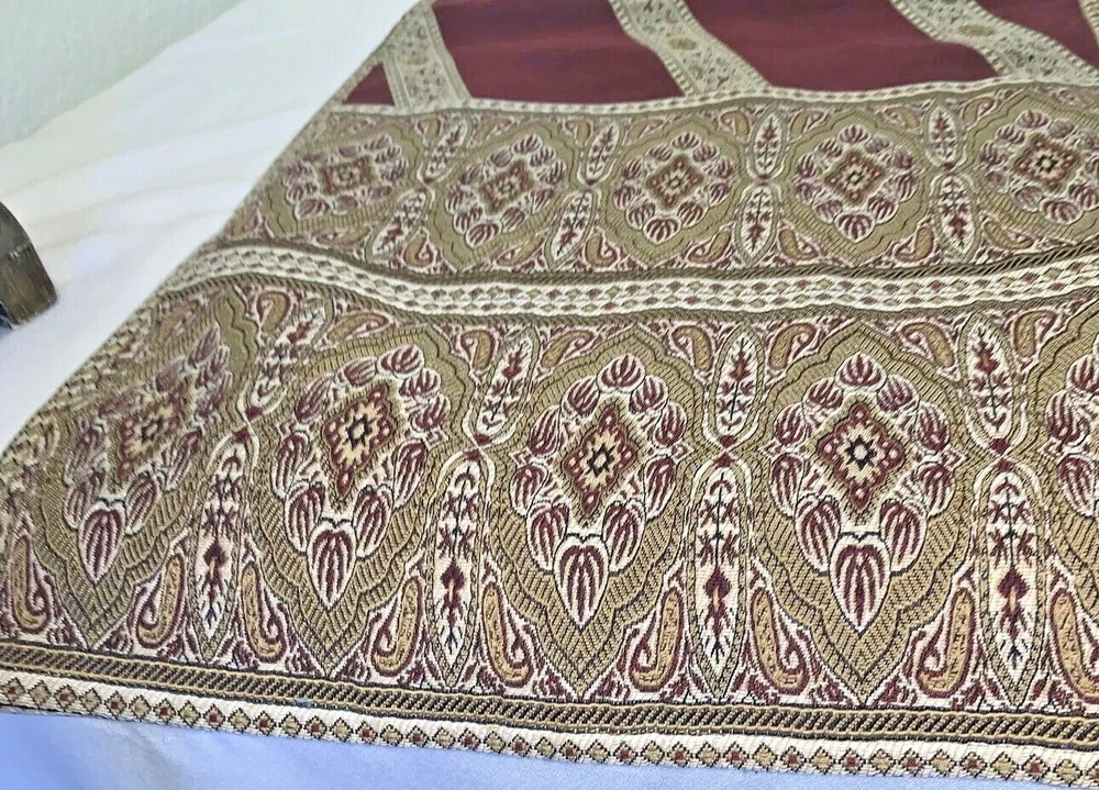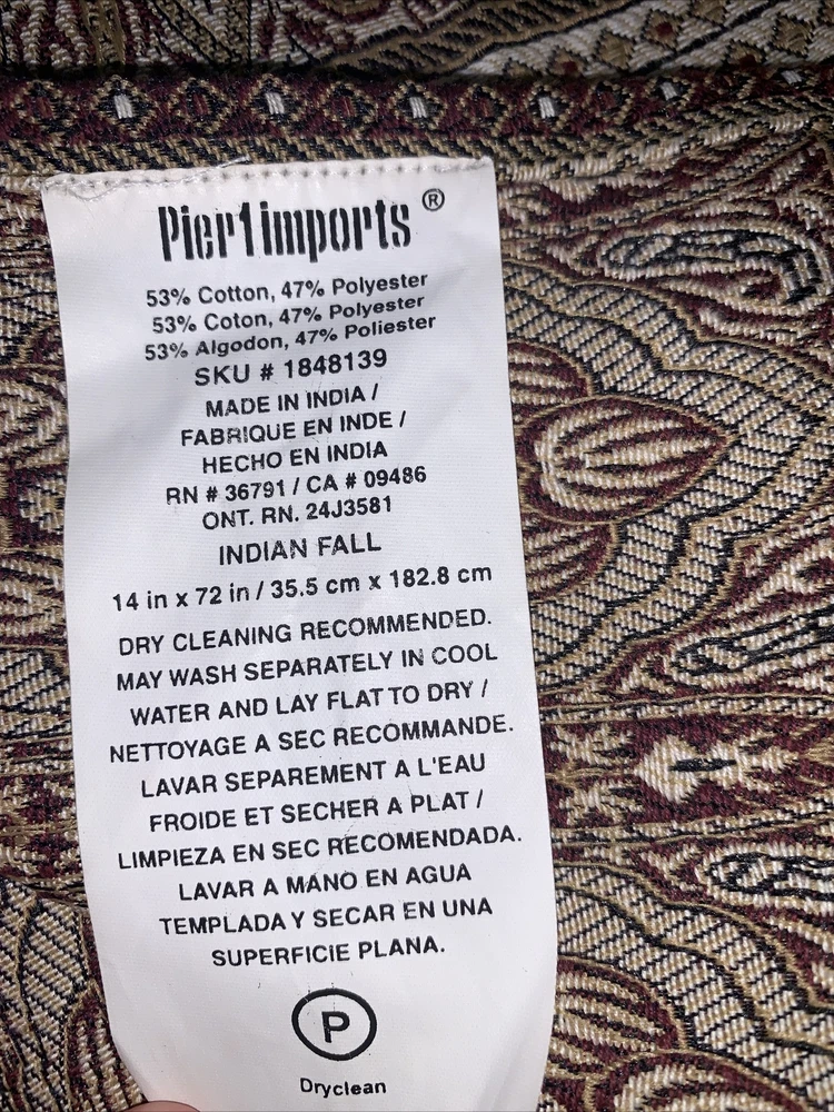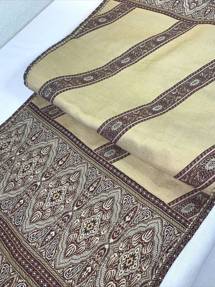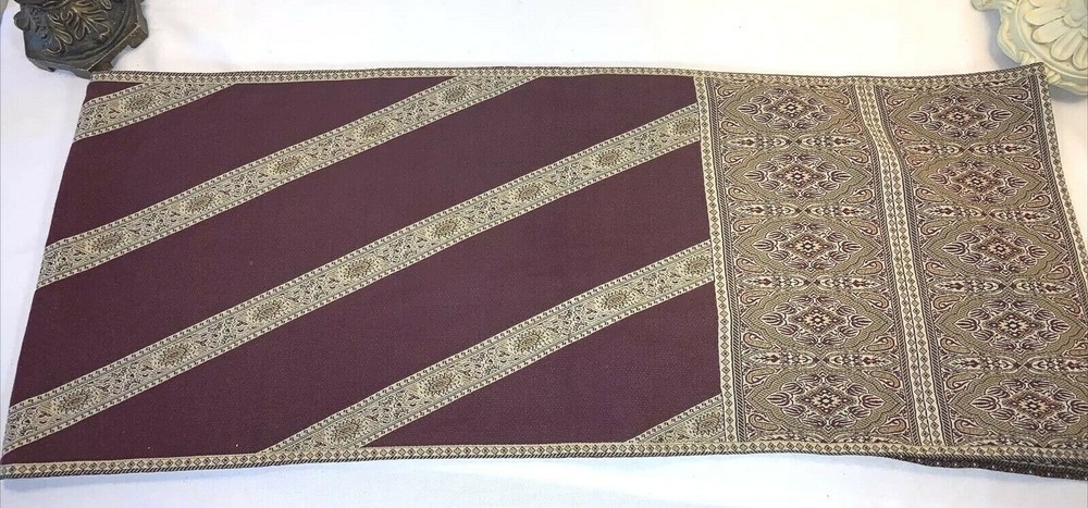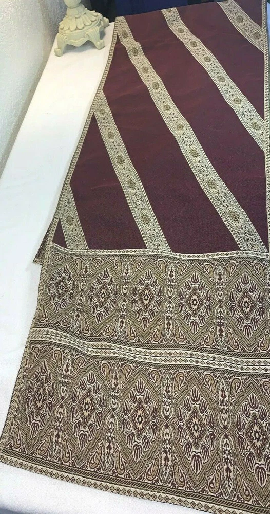The table runner is so gently used it looks new-- deep and brightly colored in gold and red tones. It is in wonderful condition! It is 72 inches long. It is a retired design, and it looks very new! There is no evidence of rips, tears, breaks in the fabric or stitchery. The original tag is on it as well. Please see the photos for more details. 14" X 72" inches