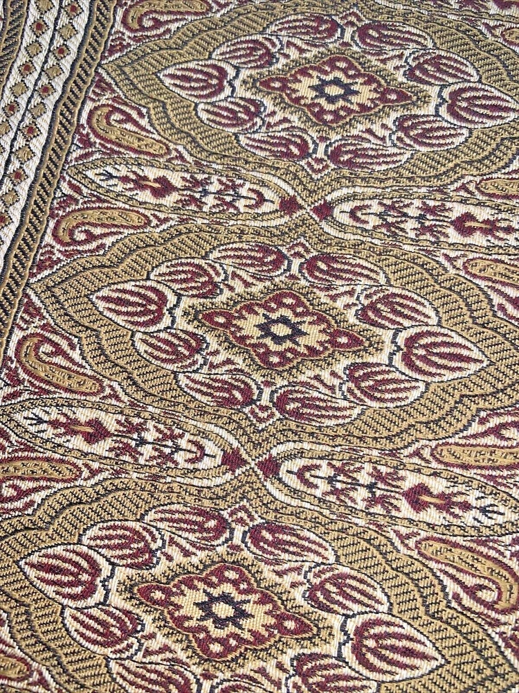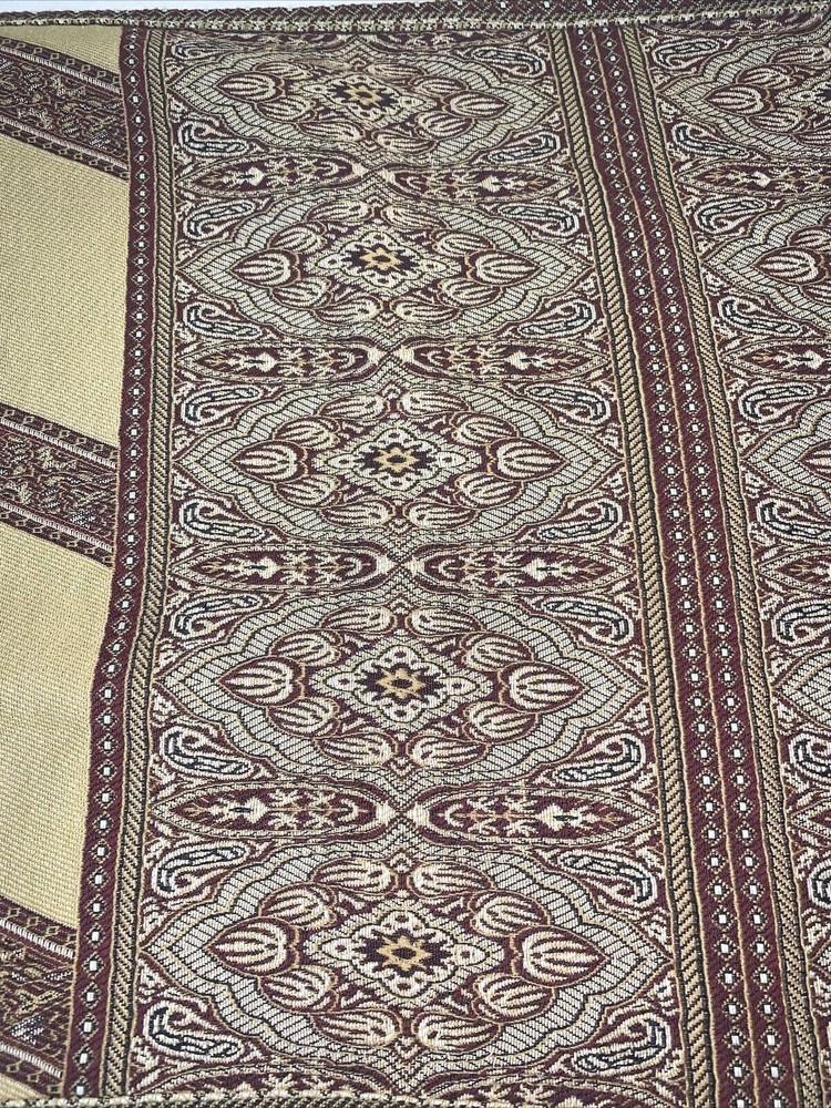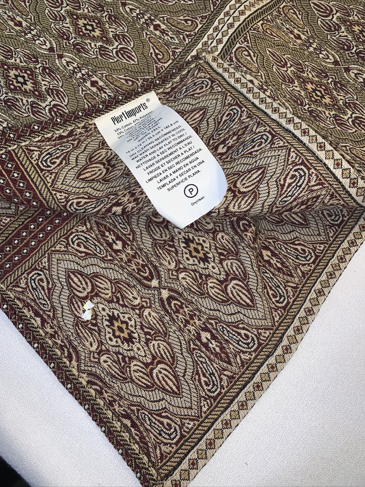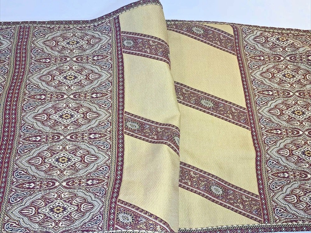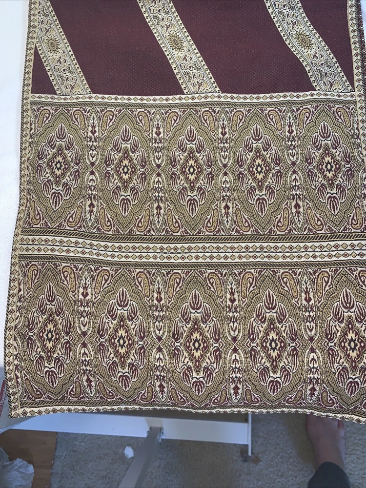 The table runner is so gently used it looks new-- deep and brightly colored in gold and red tones. It is in wonderful condition! It is 72 inches long. It is a retired design, and it looks very new! There is no evidence of rips, tears, breaks in the fabric or stitchery. The original tag is on it as well. Please see the photos for more details. 14" X 72" inches