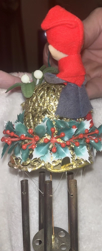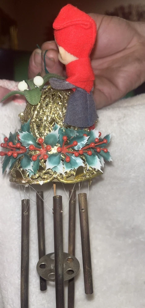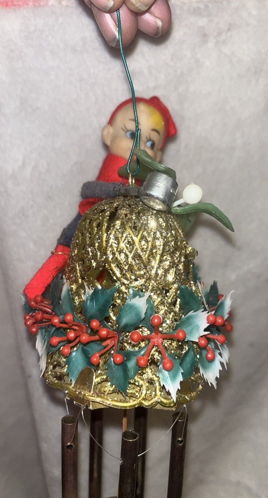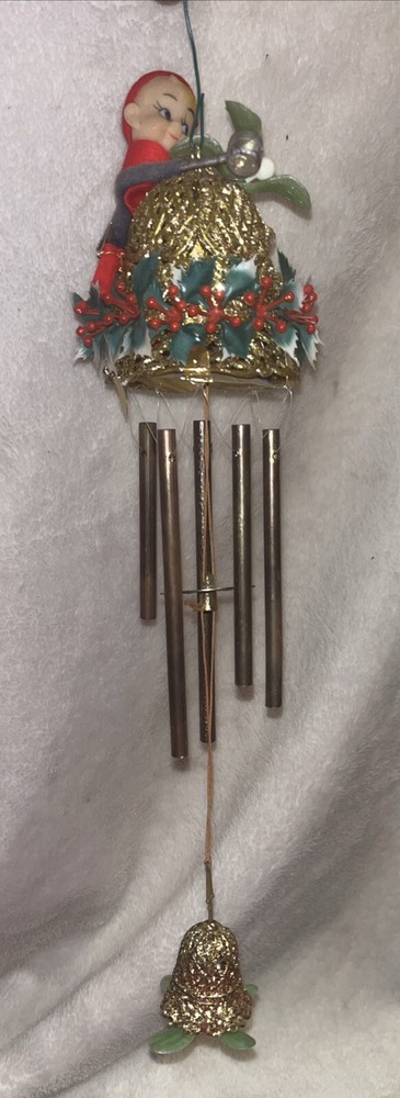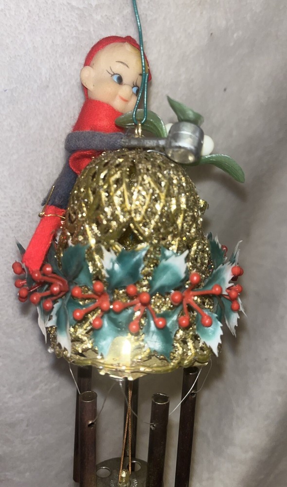 This unique wind chime features a charming design of a Knee Hugger Elf with a Mallet and Glitter, perfect for adding a touch of magic to your Christmas decorations. Crafted from a combination of brass, felt, plastic, metal, and rubber materials, this medium-sized chime measures 12 inches in length and is powered by wind. With a vibrant red, green, and gold color scheme, this vintage piece is a true collector's item from the mid-20th century. The elf is depicted with intricate details and a whimsical expression, embodying the spirit of Christmas and fantasy. Whether you're a collector or just looking for a unique decoration, this knee hugger elf wind chime is sure to bring a touch of magic to your home. This is in very nice vintage condition, see all pictures for details.