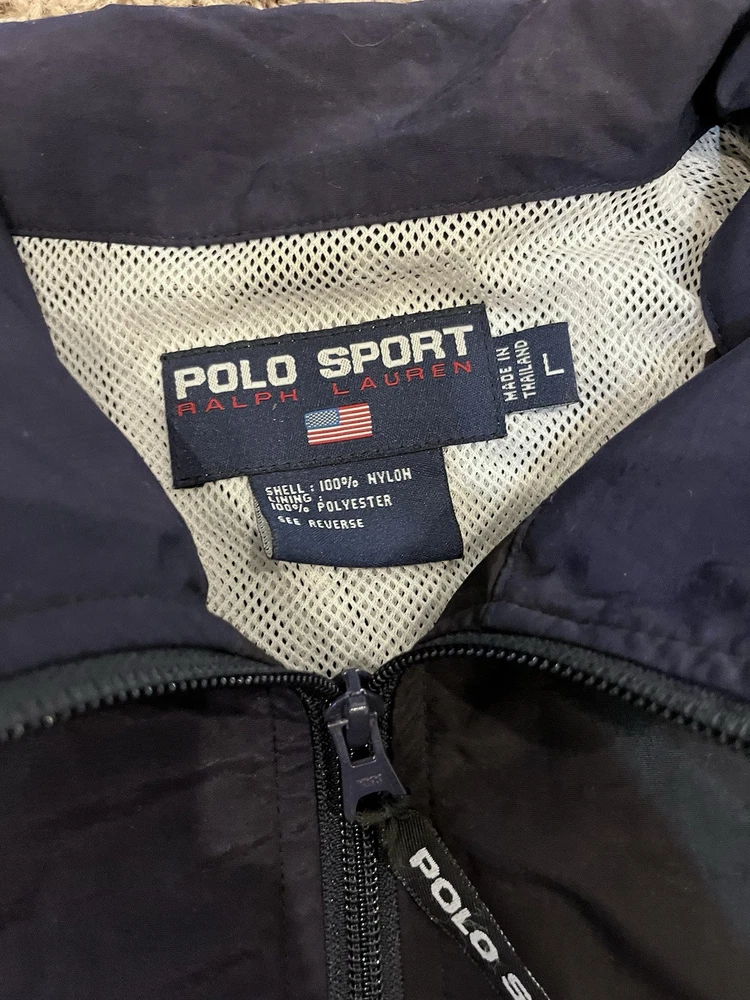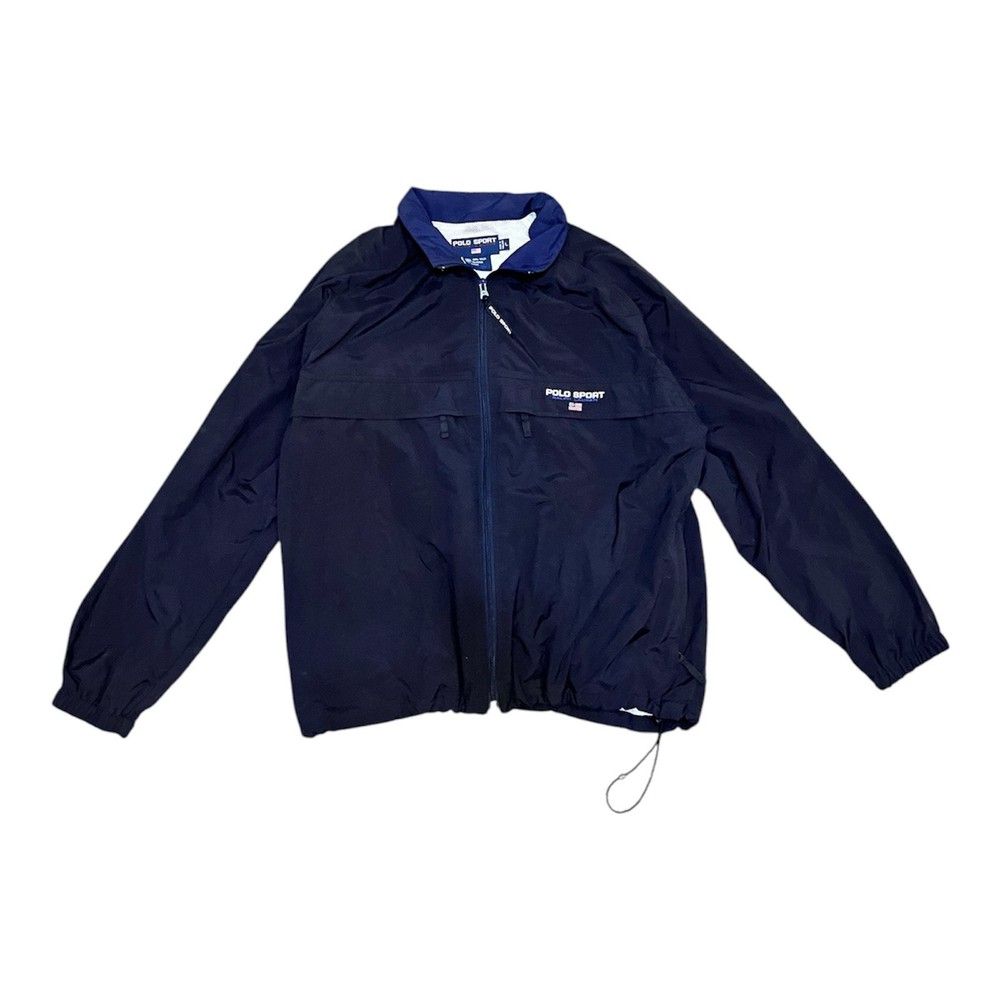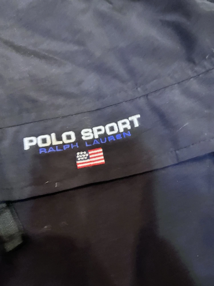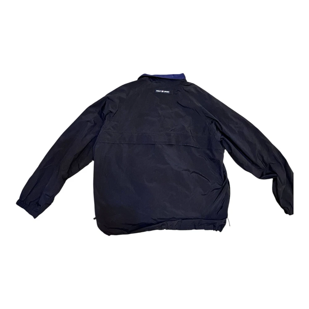 This vintage Polo Sport Ralph Lauren windbreaker jacket in navy is a mid-length jacket for men in size L. Made of softshell nylon fabric with polyester lining, it features a zip and cinch closure, embroidered logo accents, and a hood. The jacket is lightweight, water-resistant, and wind-resistant, suitable for various occasions like travel, casual wear, or work. It has a retro 90s style with a college preppy vibe.