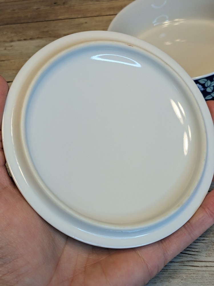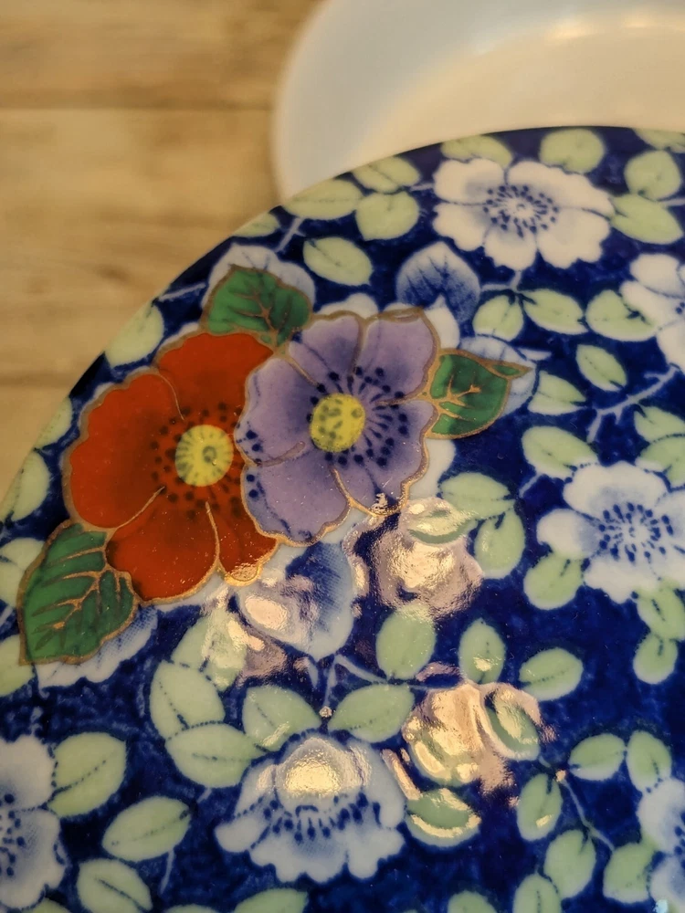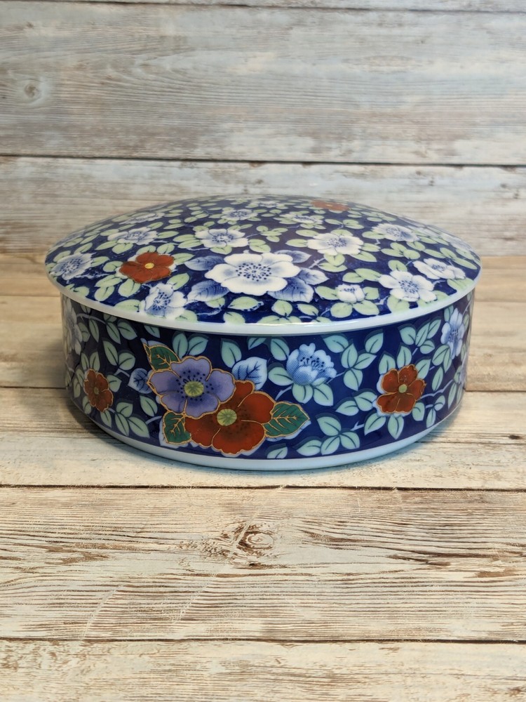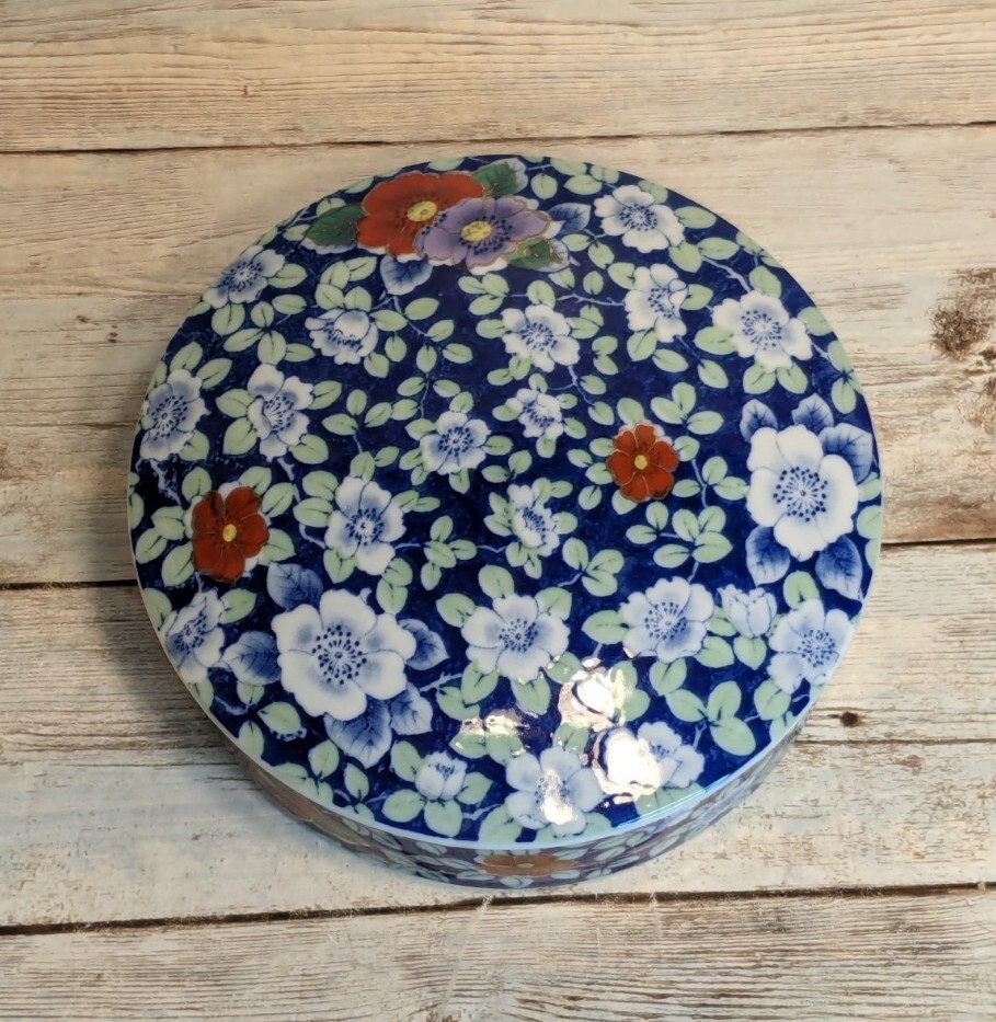 Vintage Pier One, lidded trinket box, blue floral pattern, with orange and purple flowers. Excellent condition, no chips or cracks. Measures approximately 4.5" diameter 1.5" tall