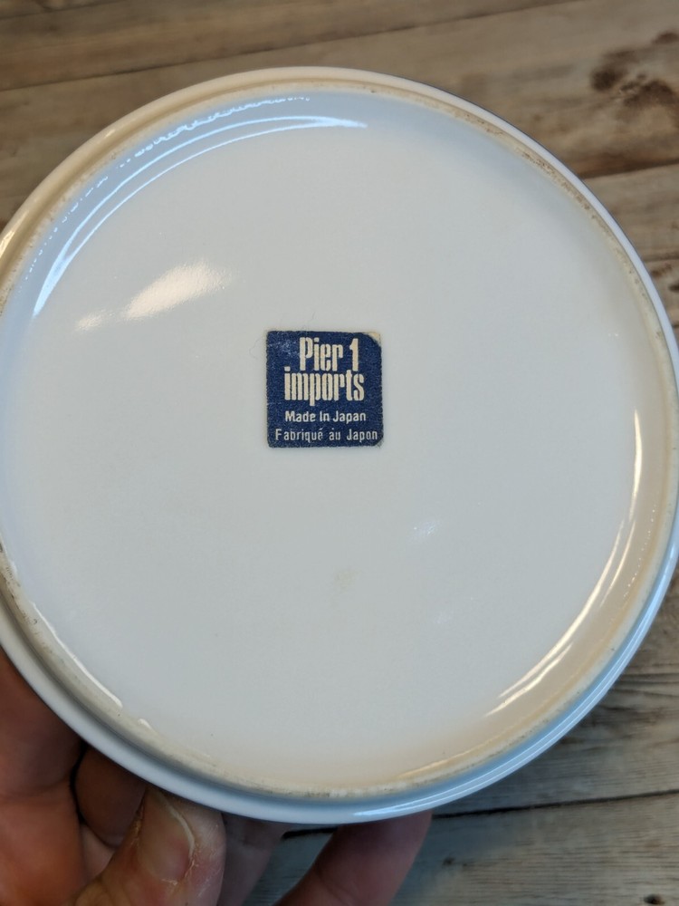 Vintage Pier One, lidded trinket box, blue floral pattern, with orange and purple flowers. Excellent condition, no chips or cracks. Measures approximately 4.5" diameter 1.5" tall...