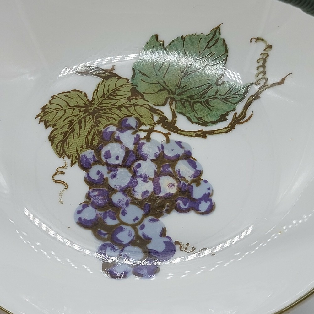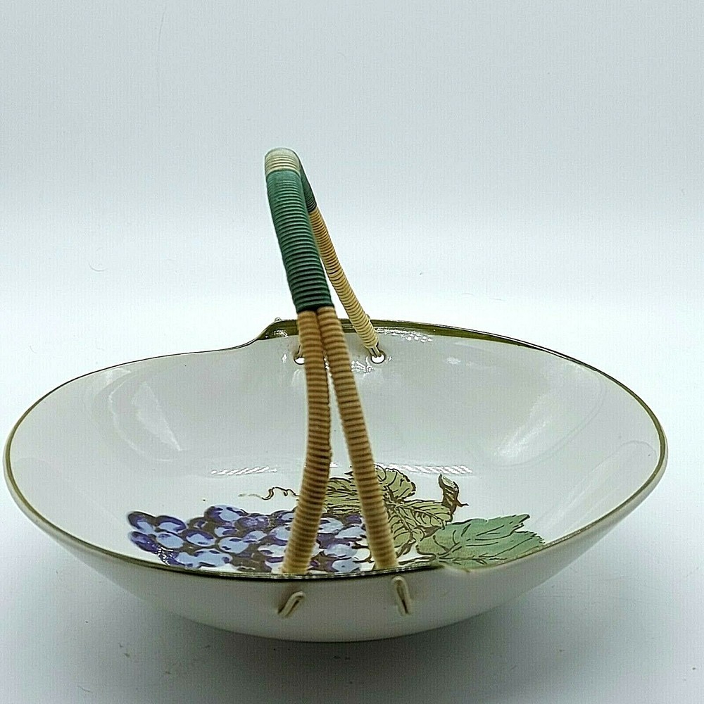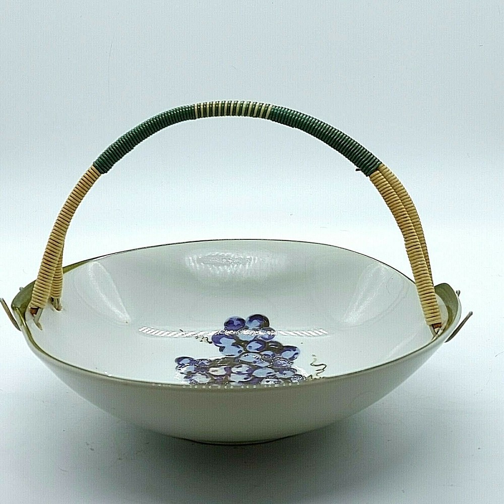 Vintage Porcelain Topline Imports Inc White with Ships with USPS Priority Mail. Grape & Leaves Design Serving Bowl. Green & Taupe Reed Wrapped Handle. Made in Japan. Measures 8-1/8"x 8-3/8"x 2-1/4". Preowned and in great condition. See photo's for more details or message me with any questions. Disclaimer: Many items sold are Vintage/Used. These objects may or may not be in perfect condition. They may contain cracks, chips, discolorations or stains from the aging process or even storage or shipping. We examine each object before processing for sale, however, we could very easily miss an imperfection. We try to list Vintage/Used products as near as perfect as we can. Please know we will mention any imperfections in the description box as we find them and will also have a photo made so you can review the situation. We are not art experts or professionals. Thus we spend hours researching these objects so as to best describe them. At times we may not call an object by any Brand or Manufacturer name because we cannot determine what it is. Also, t his store buys from many, different sources and cannot guarantee pet free, allergen free or odor/smoke free items. Some plastics, tape and storage containers give off odors that may be offensive to some. Thus any product purchased by a customer is done so with this knowledge. If there are any questions or concerns please contact us before making a purchase. In regards to shipping and handling costs. We have absolutely nothing to do with shipping costs. All we do is enter dimension values and the weight of the item into the appropriate blanks. In accordance with the United States Postal Service, eBay then tabulates the cost for shipping and relays those totals to us and then us to the consumer. Hope this helps.