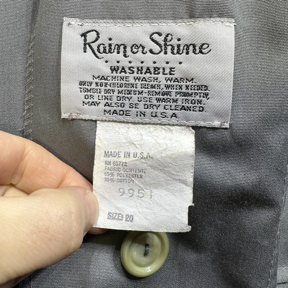 Vintage “Rain or Shine” Jacket Size 20 Plus Size Windbreaker Made In USA Gray. Good condition! Check out the photos for measurements! ****COMBINE SHIPPING AVAILABLE **** ~~~ Yes, I DO COMBINE SHIPPING, I have other shorts, pants, shirts, sweaters, etc! If you’re having trouble buying multiple items from my store, ask! I’ll will write you back and guide you through it! The easiest thing is to do is just buy the items and if you over pay for shipping, I will send you a refund within a day, called a “shipping discount.” P.S. make sure you look at items from the “Home Sweet Home Clothing” Store, because I can not combine shipping on items you buy from me and other sellers! I can only combine shipping on the items you buy from me! Thanks!