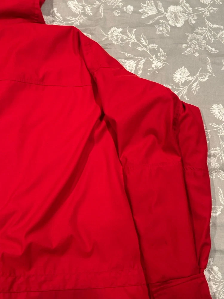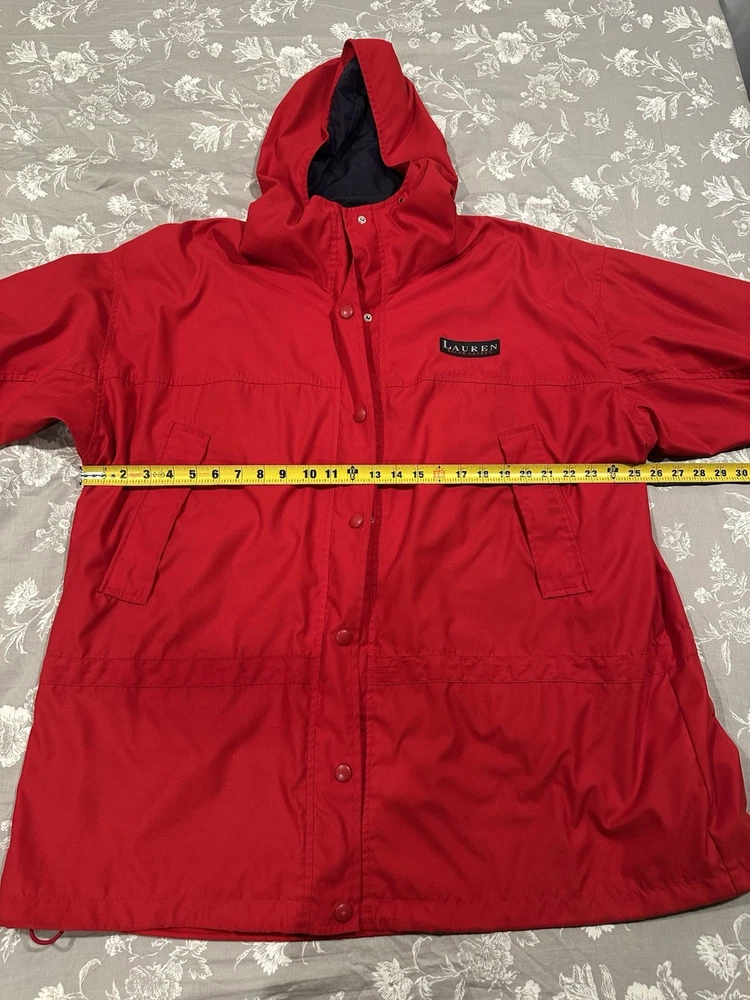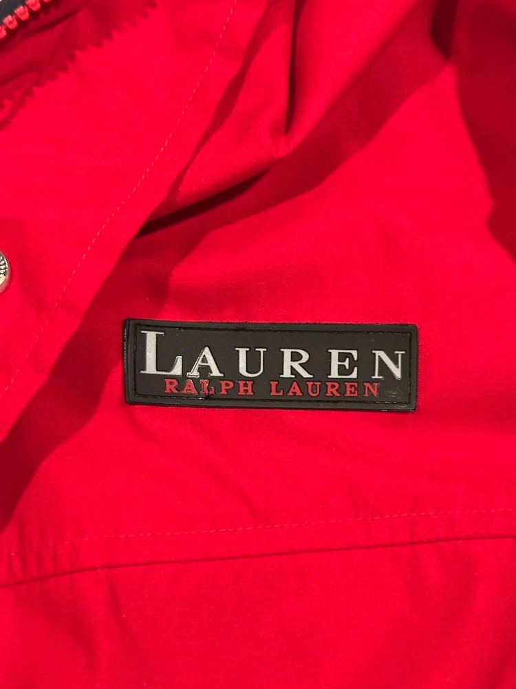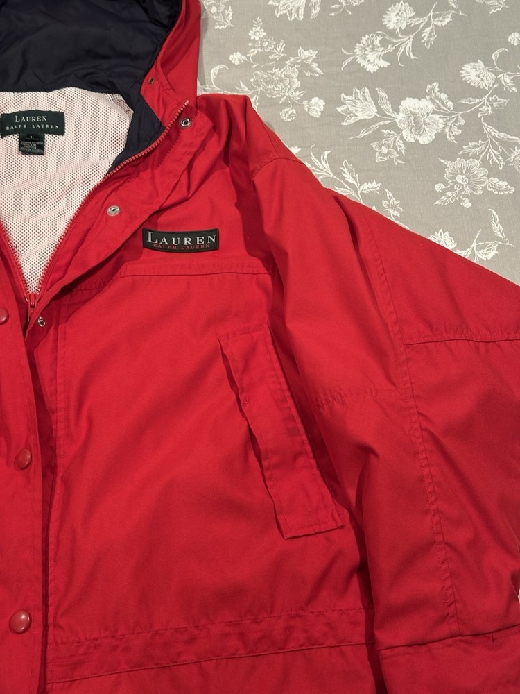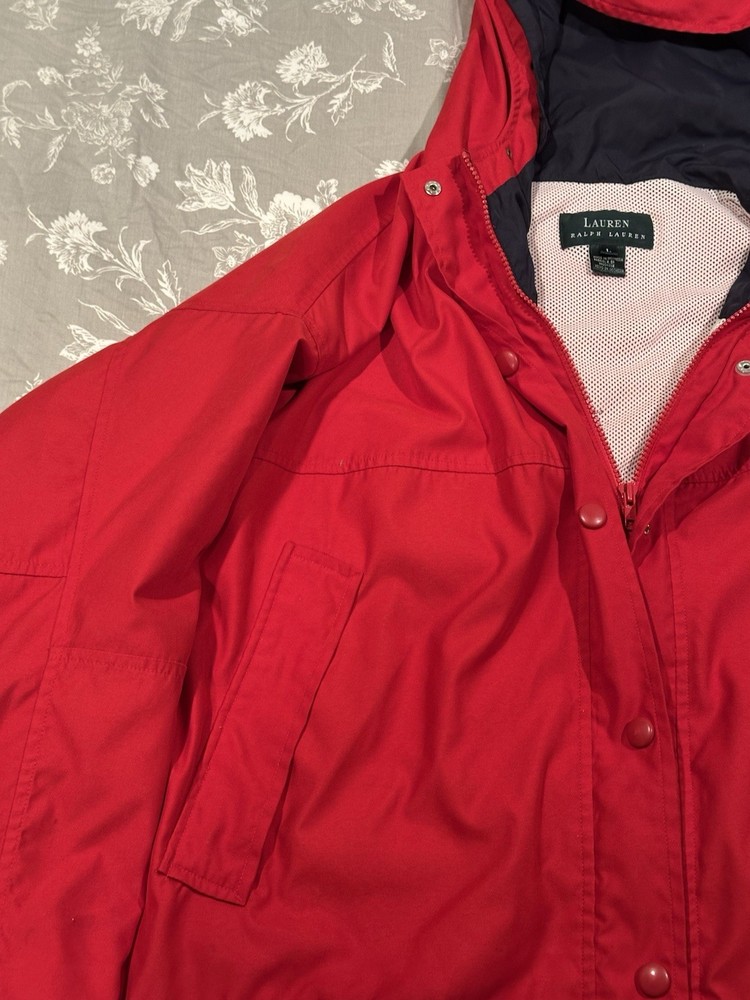 Red Lauren Ralph Lauren jacket in great condition. Features pockets inside and out, hood, snap and zip closure.