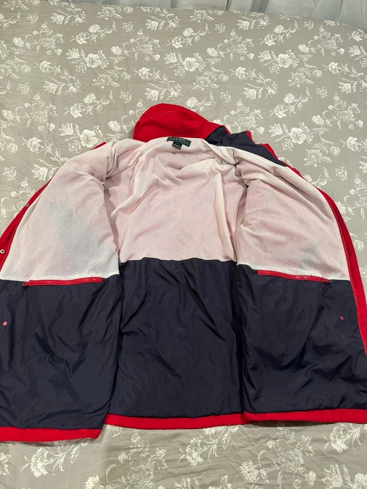 Red Lauren Ralph Lauren jacket in great condition. Features pockets inside and out, hood, snap and zip closure....