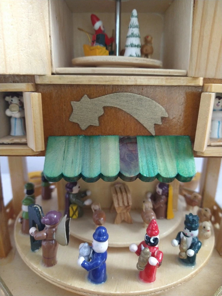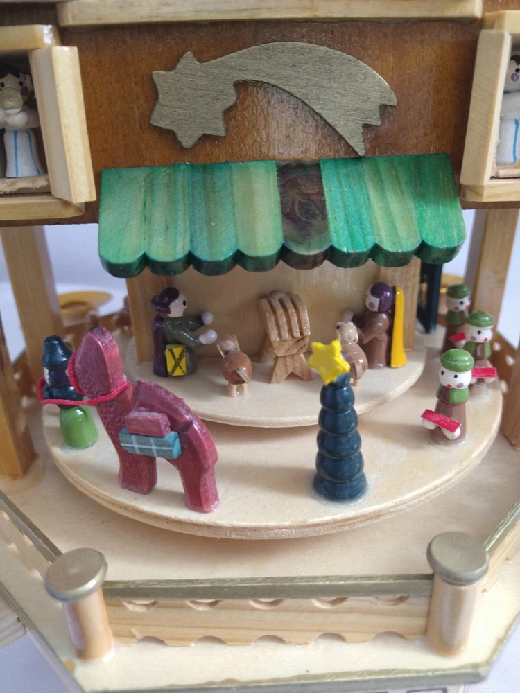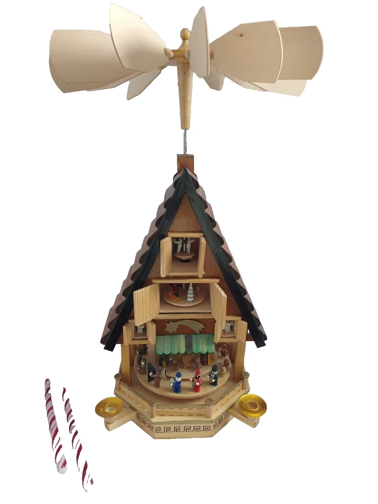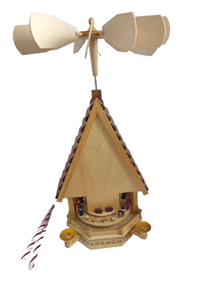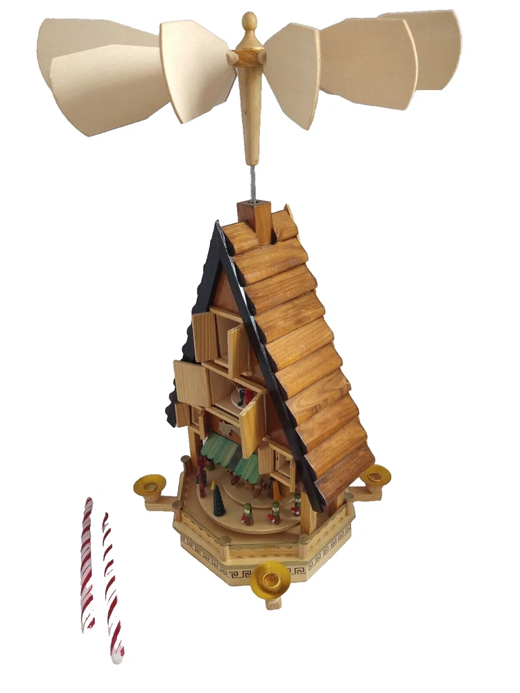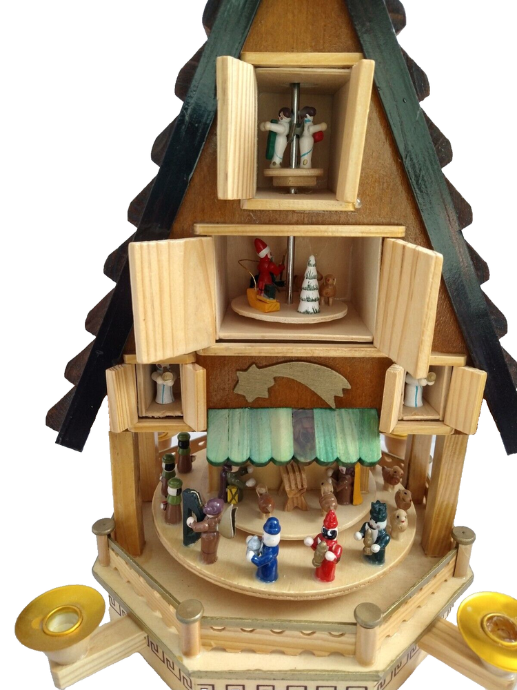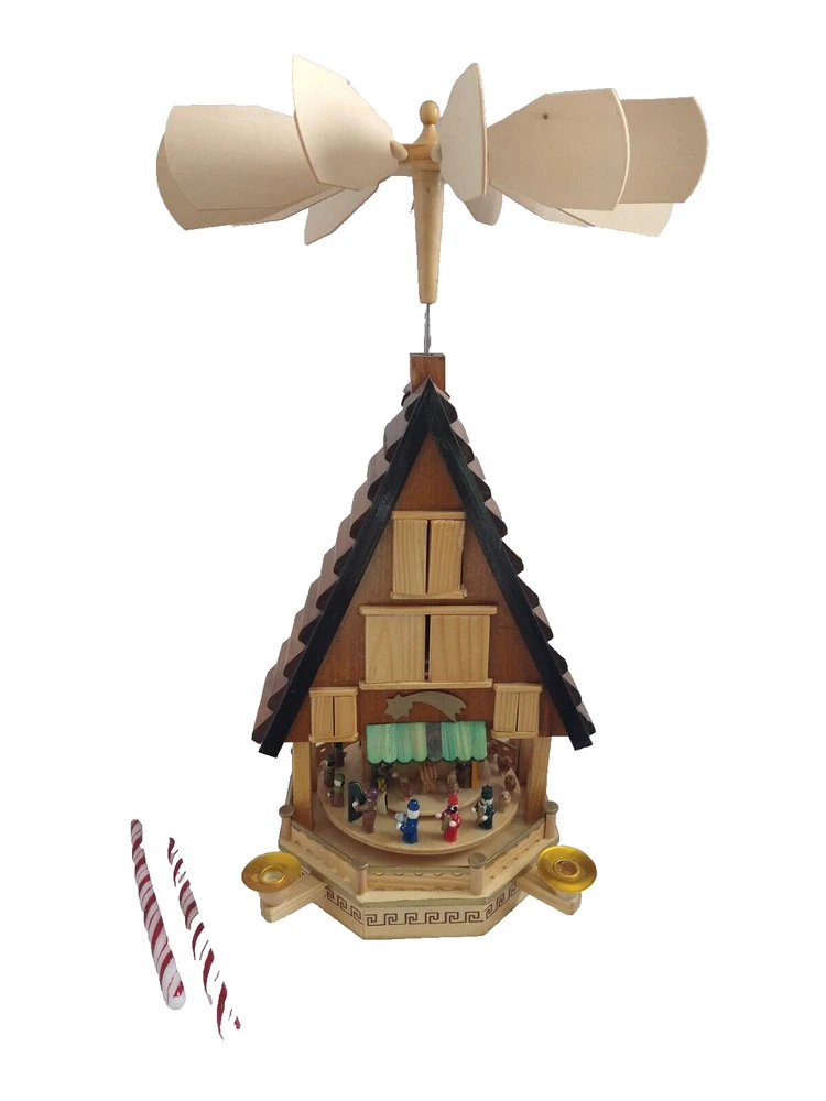 Vintage Rare BRUBAKER 4 Tier, 17" Christmas Pyramid Windmill Carousel Nativity Beautiful German Design Collectible Advent Depiction, decorated with miniature Nativity, Angels, Santa scene on 2nd tier, 3 Kings, Camel, Sheep, Harp, Christmas tree. *PLEASE NOTE, VIEW PICTURE OF RIGHT SIDE DOOR ON 1ST TIER, WAS GLUED ON EDGES, STILL OPENS AND CLOSES WITH CARE. THIS IS ONLY FLAW. Requires 4 candles, only 2 candles included. Does not come with original box. Thanks for Looking!