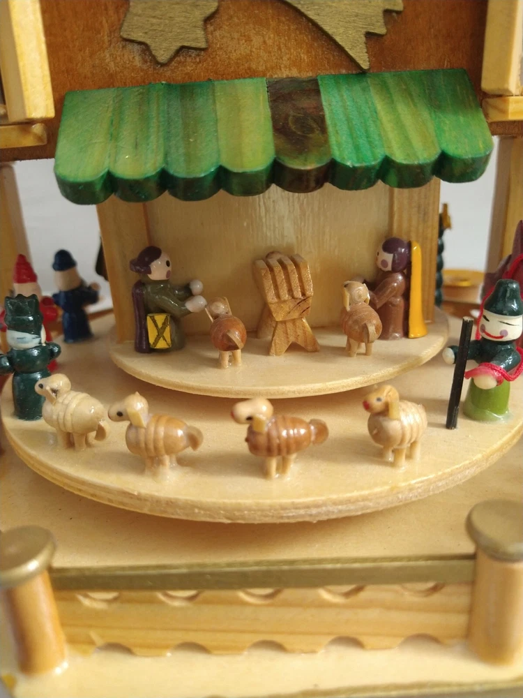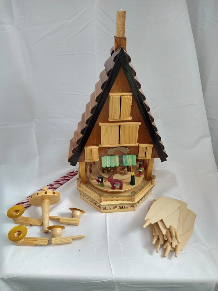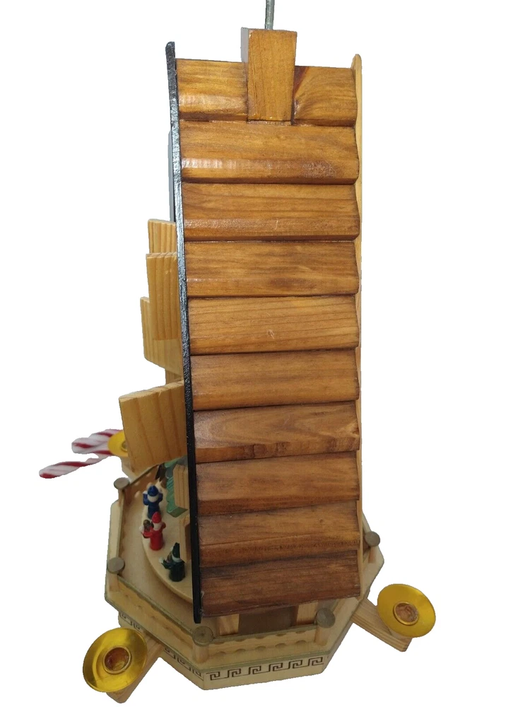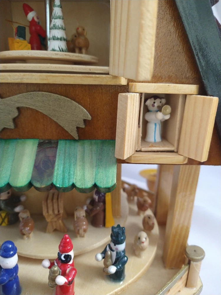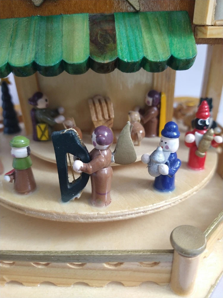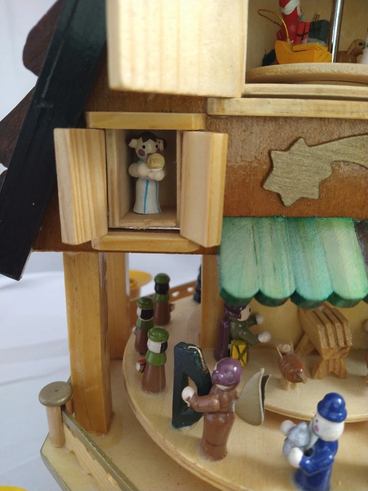 Vintage Rare BRUBAKER 4 Tier, 17" Christmas Pyramid Windmill Carousel Nativity Beautiful German Design Collectible Advent Depiction, decorated with miniature Nativity, Angels, Santa scene on 2nd tier, 3 Kings, Camel, Sheep, Harp, Christmas tree. *PLEASE NOTE, VIEW PICTURE OF RIGHT SIDE DOOR ON 1ST TIER, WAS GLUED ON EDGES, STILL OPENS AND CLOSES WITH CARE. THIS IS ONLY FLAW. Requires 4 candles, only 2 candles included. Does not come with original box. Thanks for Looking!