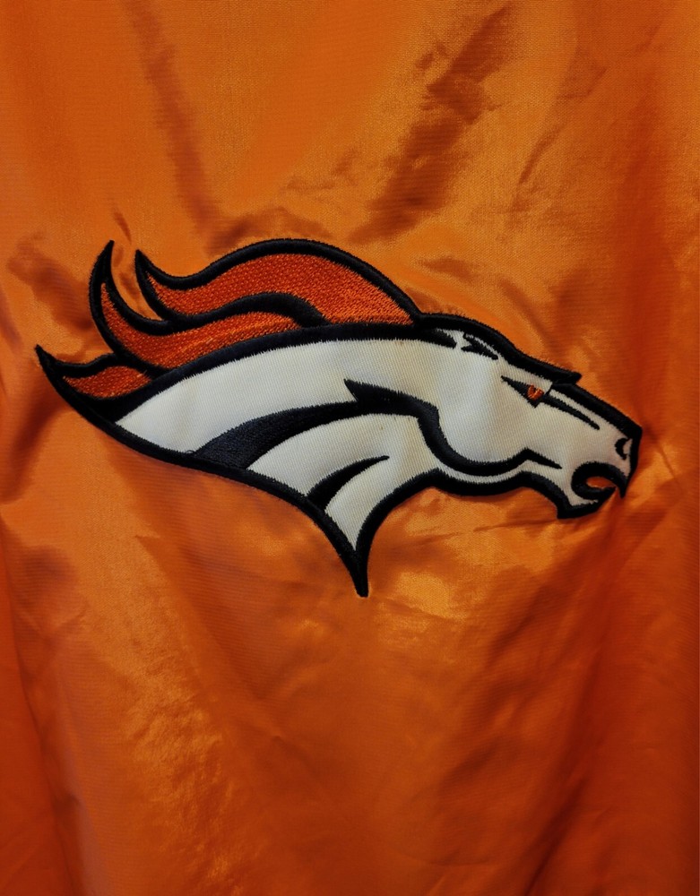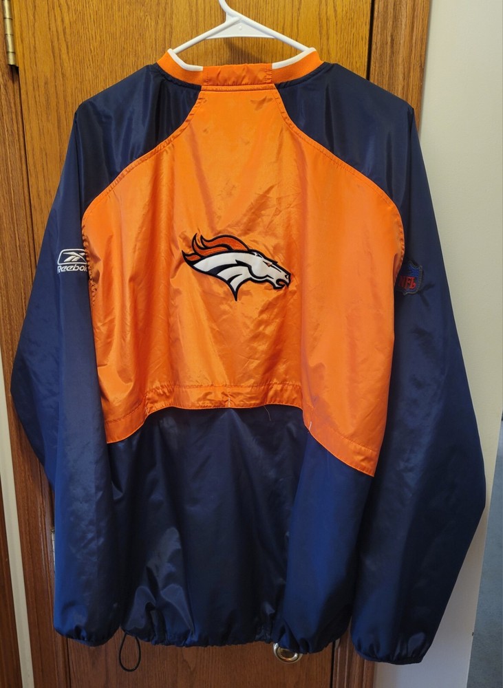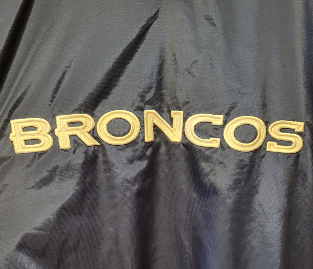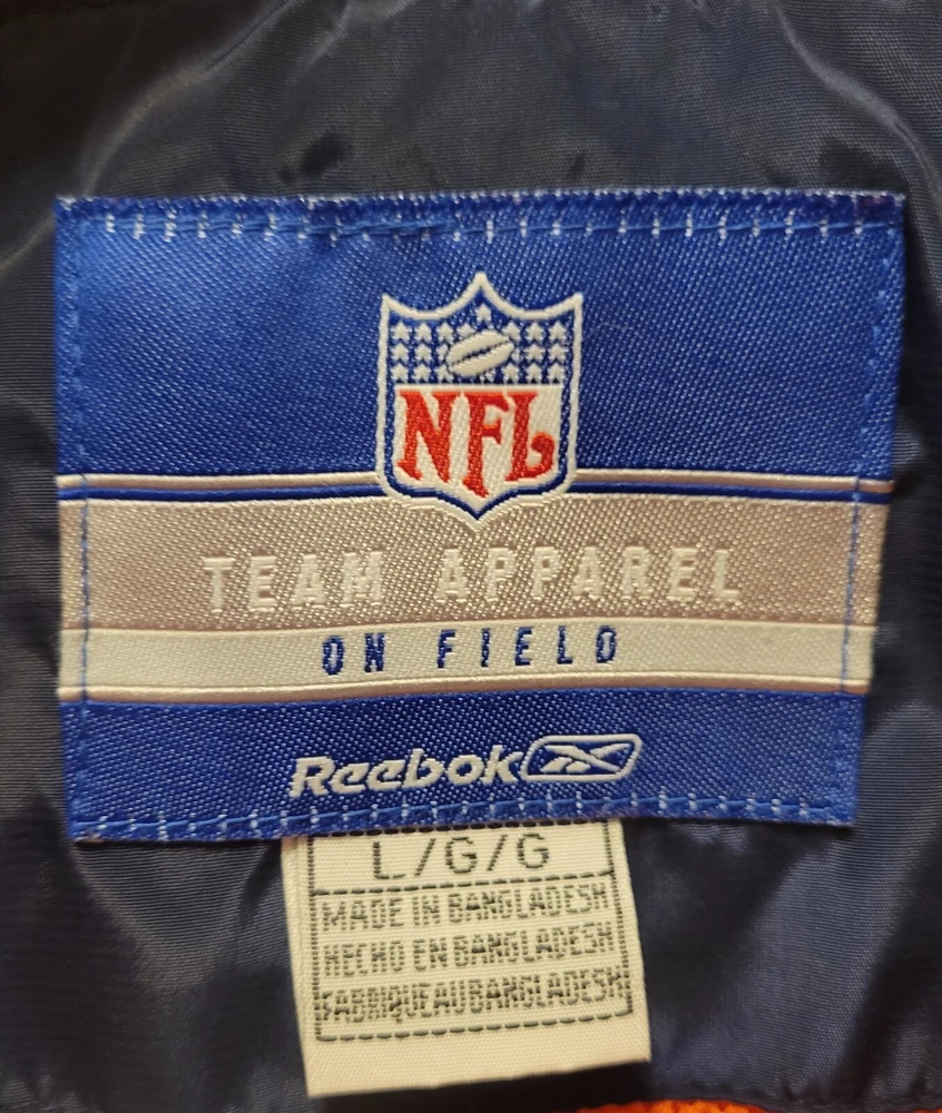 Show your support for the Denver Broncos with this vintage Reebok NFL windbreaker jacket. Made with high-quality materials in Bangladesh, this jacket is perfect for any fan of the team. It features the team's official logo and colors, making it a great addition to any fan's wardrobe. This jacket is officially licensed by the National Football League (NFL) and is perfect for regular season games. The size is a men's large and it is designed specifically for football fans. Don't miss out on the chance to show your team spirit and support the Denver Broncos with this stylish and comfortable windbreaker jacket.