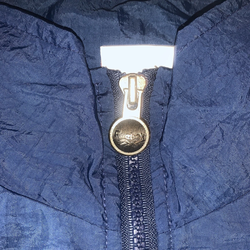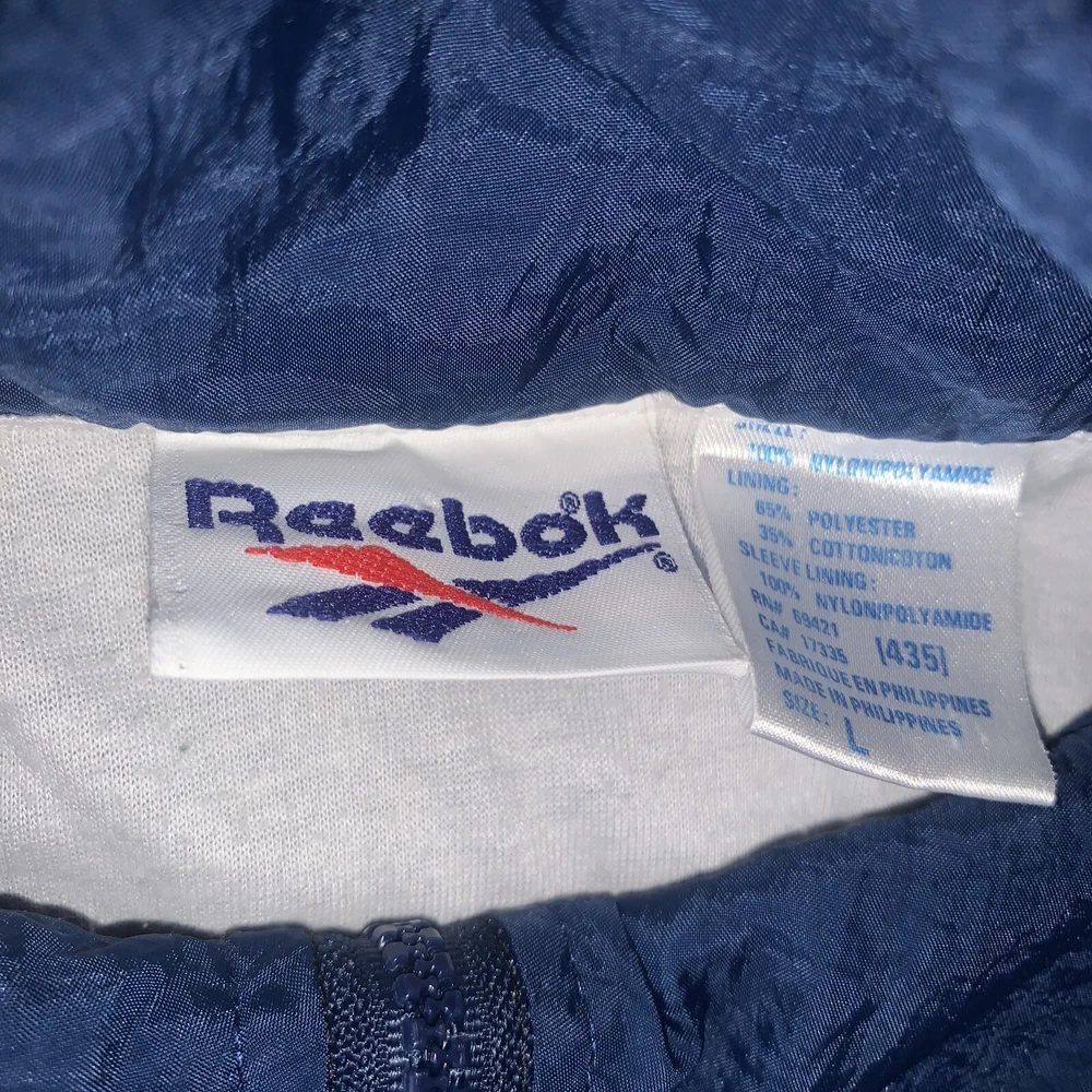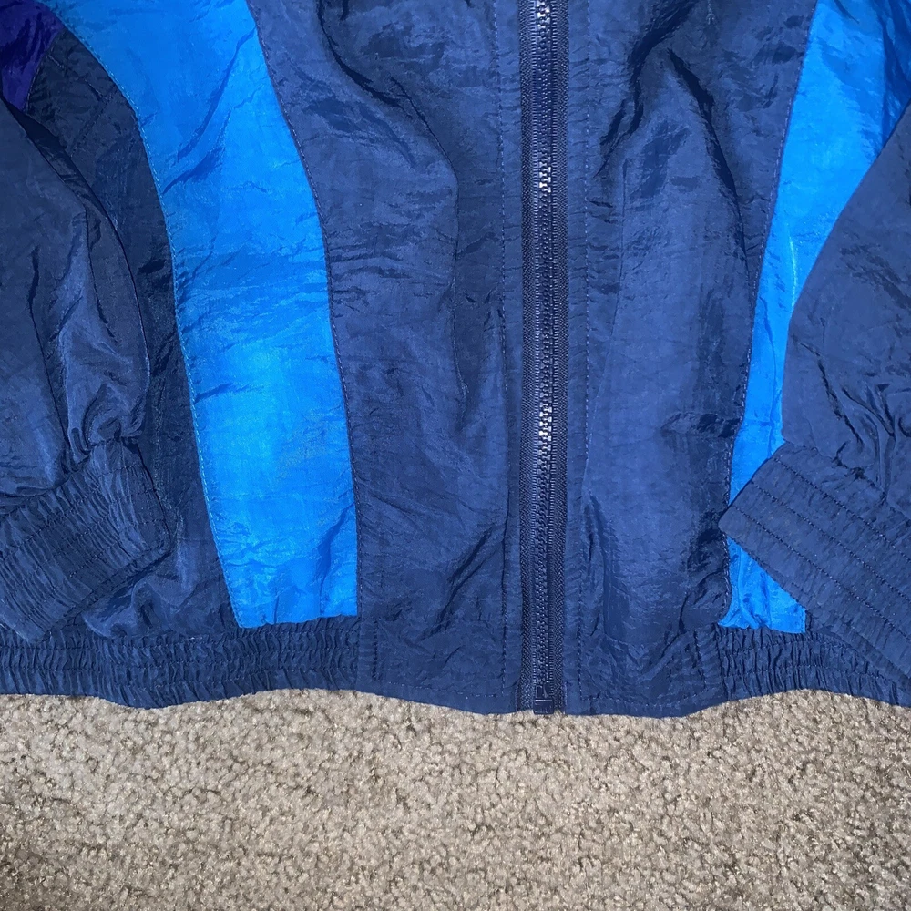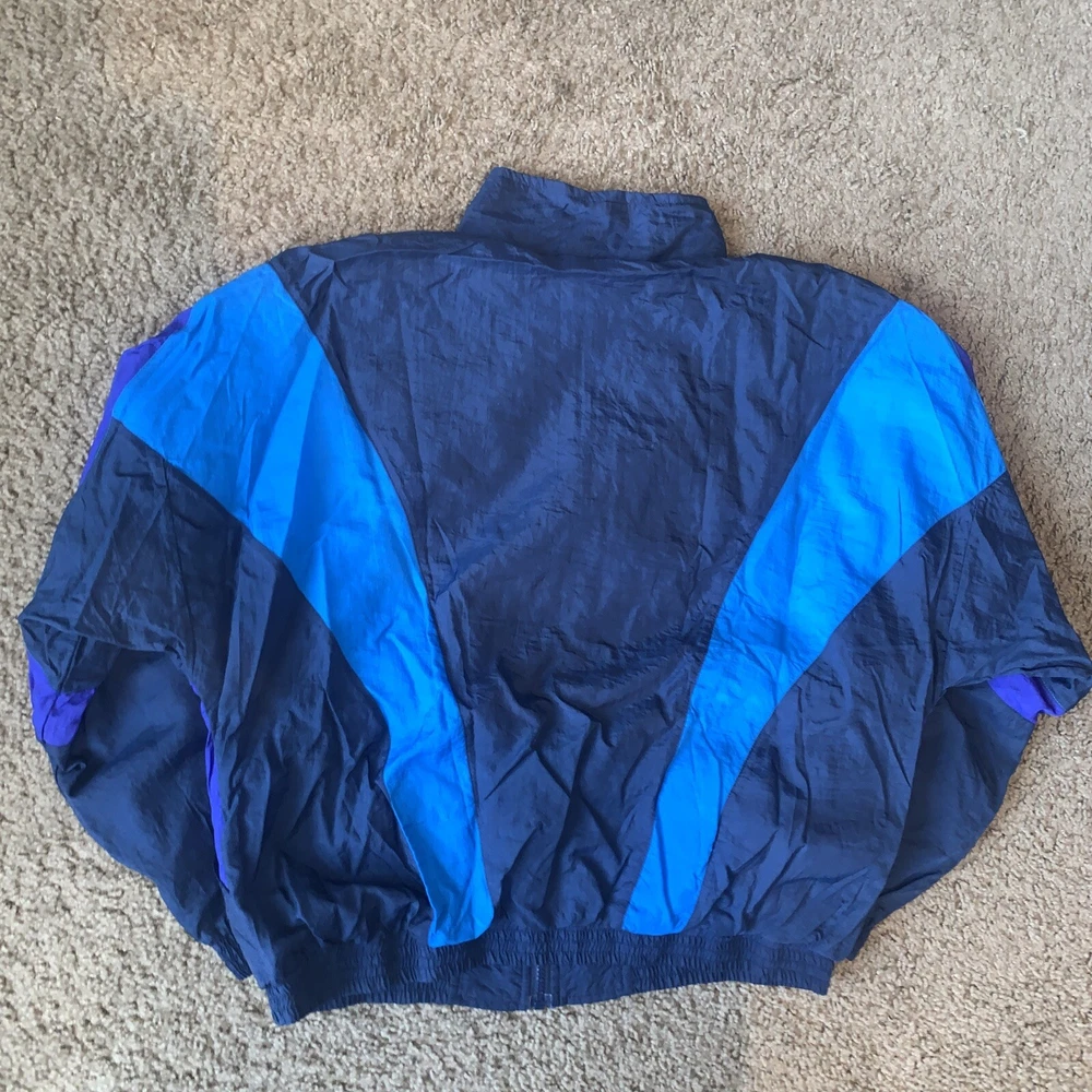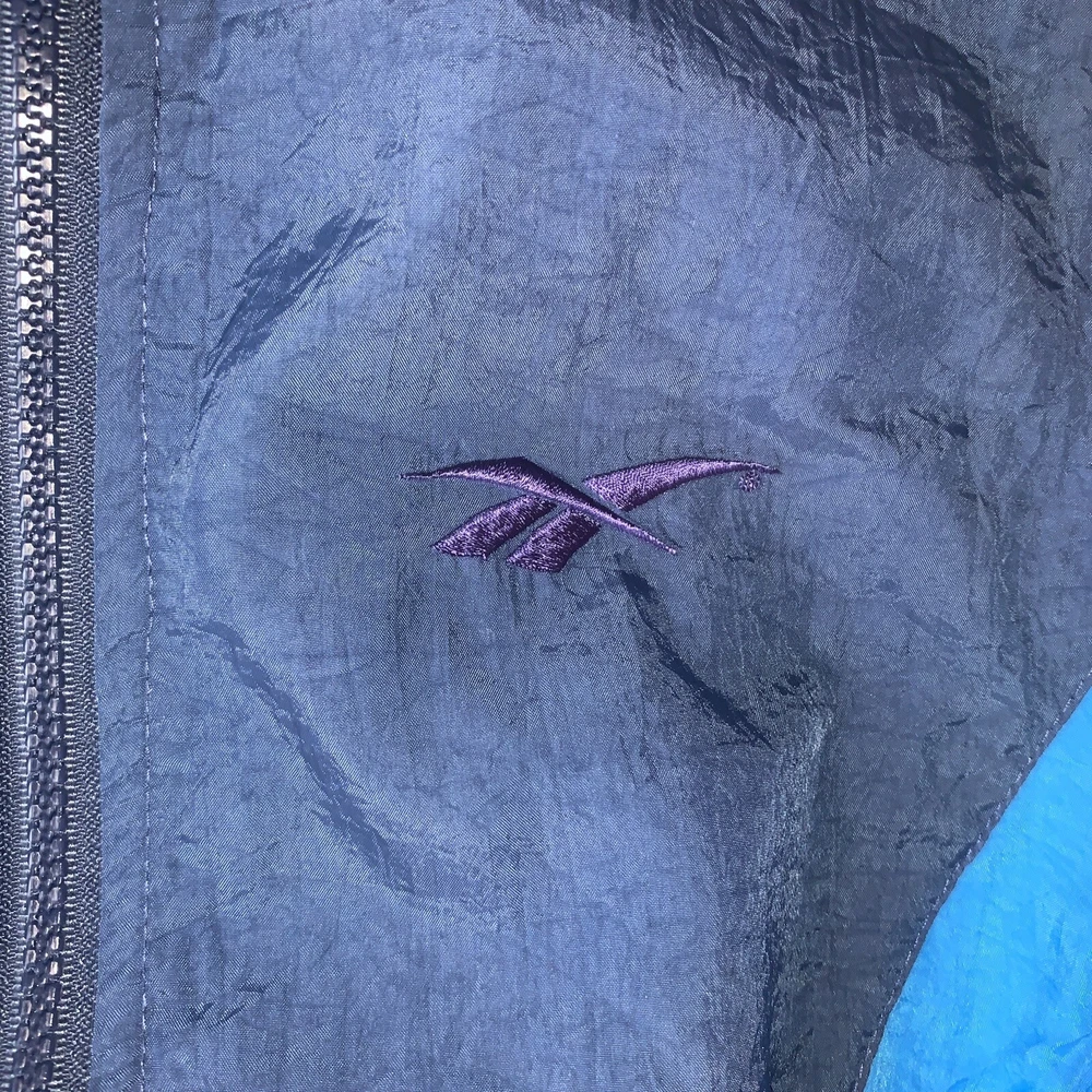 This vintage Reebok windbreaker is a must-have for any fashion-forward individual. With a softshell fabric type, this jacket is wind-resistant and water-resistant, making it perfect for any season and occasion. The zip closure and adjustable waist make for a comfortable and easy fit. This jacket features a colorblock pattern of light blue, navy, and purple, with accents of embroidered logos and zippers. It comes in a size L and is pre-owned but has been well taken care of. The jacket is part of a set that includes activewear and a track jacket. Don't miss out on this 90s-themed piece that is suitable for gym and training, walking, lounge wear, basketball, and running and jogging.