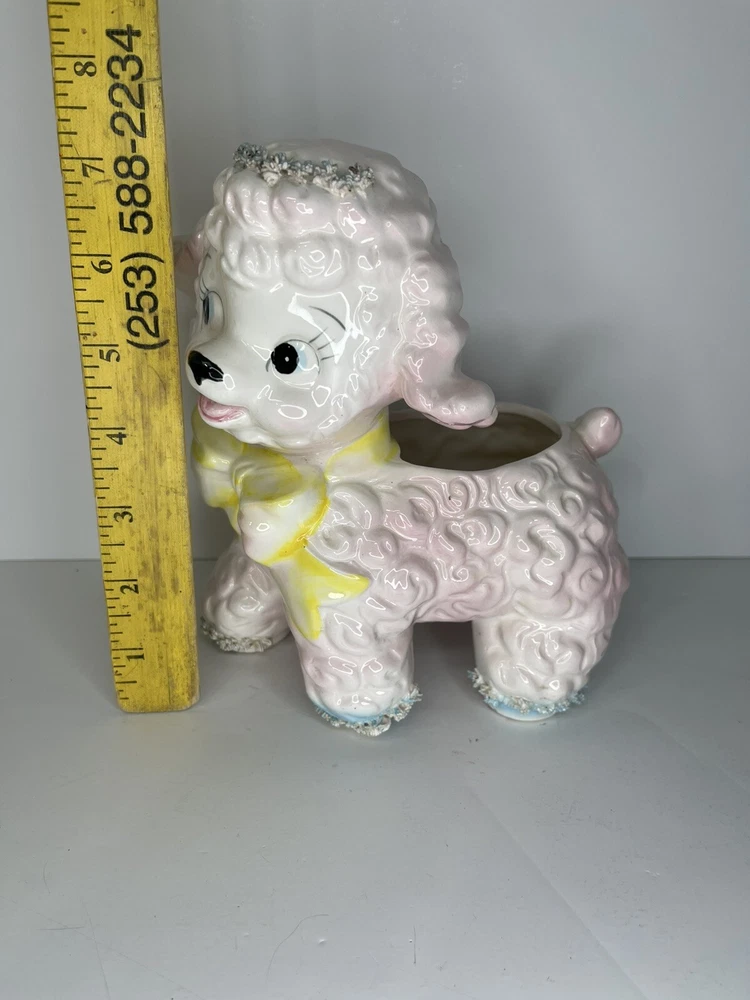 Absolutely charming! This vintage pink ceramic lamb planter has such a sweet and nostalgic feel. The adorable, slightly worn look adds character—perfect for displaying tiny succulents or just as a cute desk decoration. The retro spaghetti-style details make it a unique find for collectors or anyone who loves quirky vintage pieces. So happy with it!