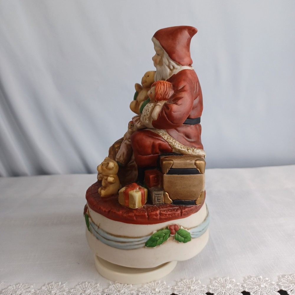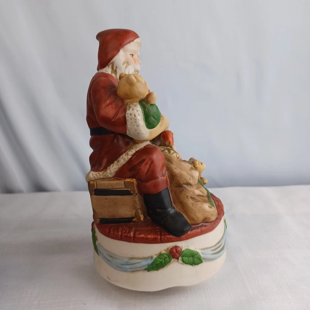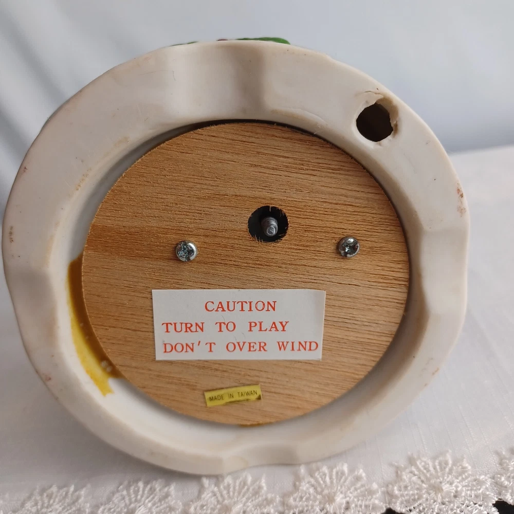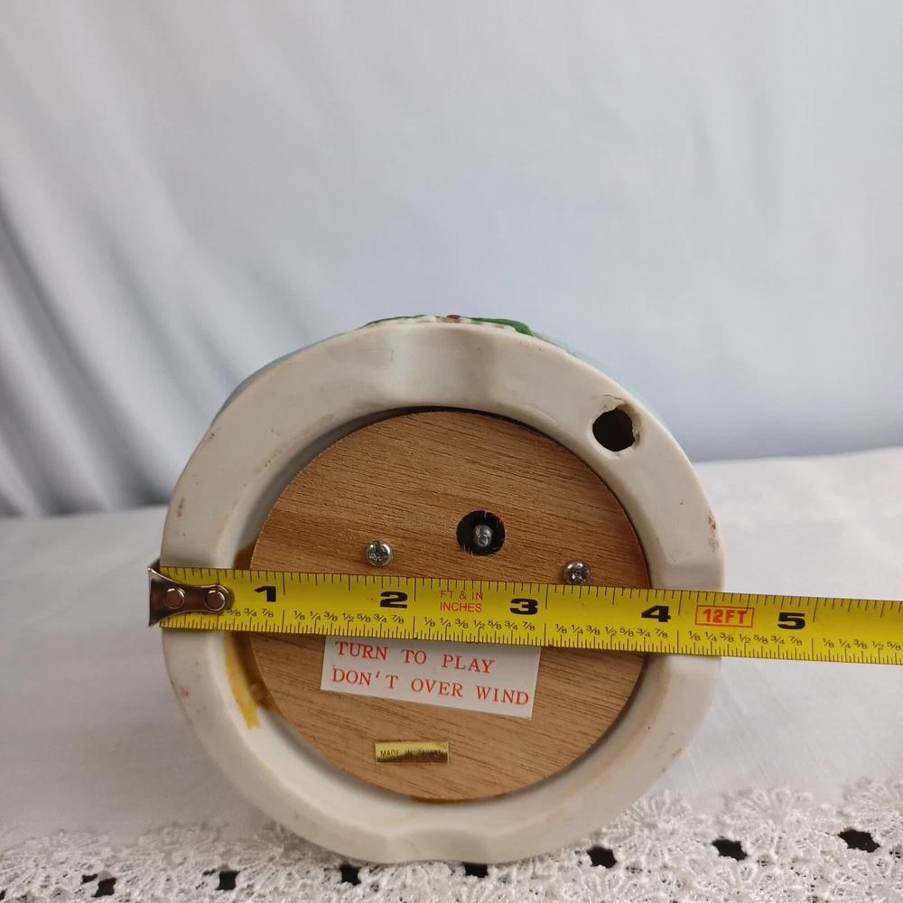 This is in excellent working order with no chips or flea bites. There is a round hole in the bottom but I believe it was made that way...shown in pictures. Plays the tune "White Christmas" while rotating. Please view all pictures carefully for measurements and details.