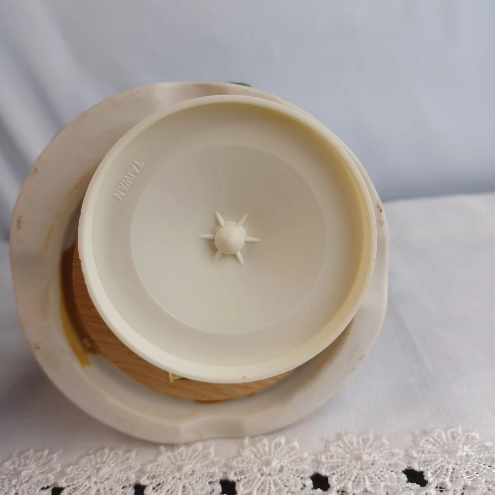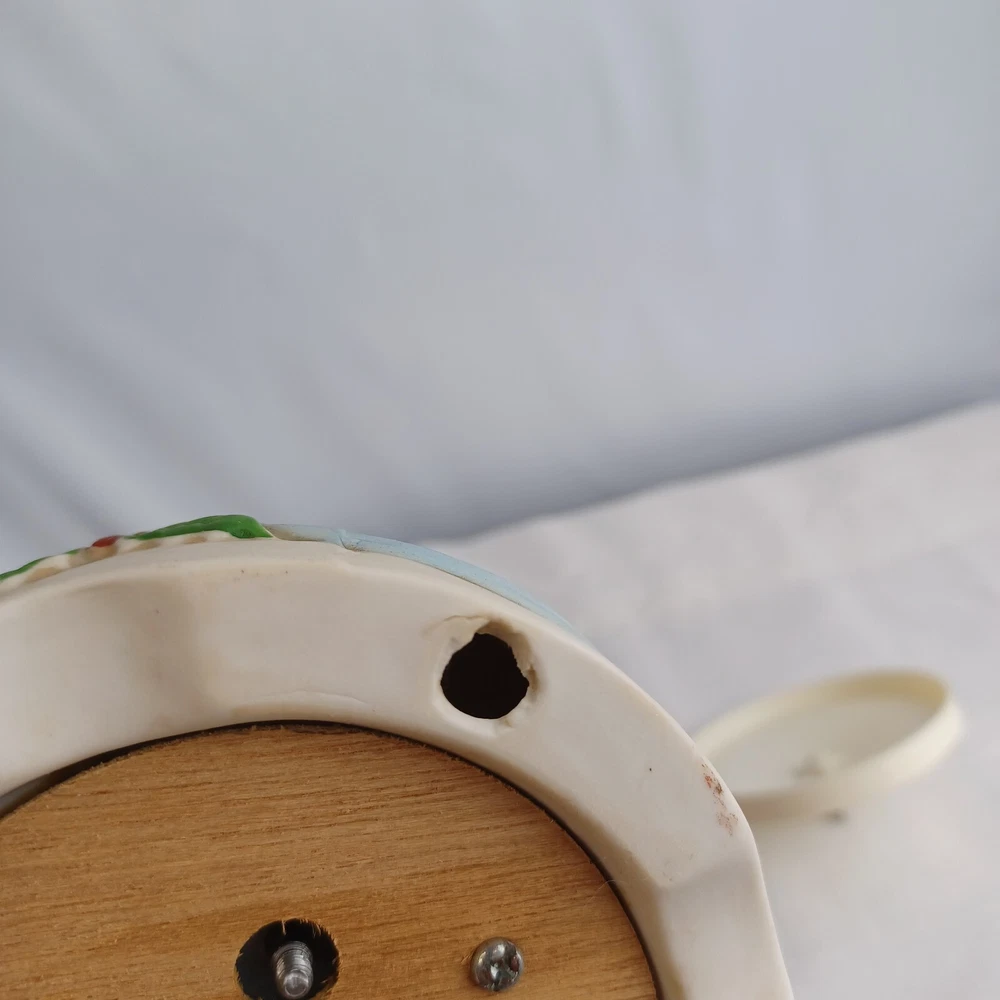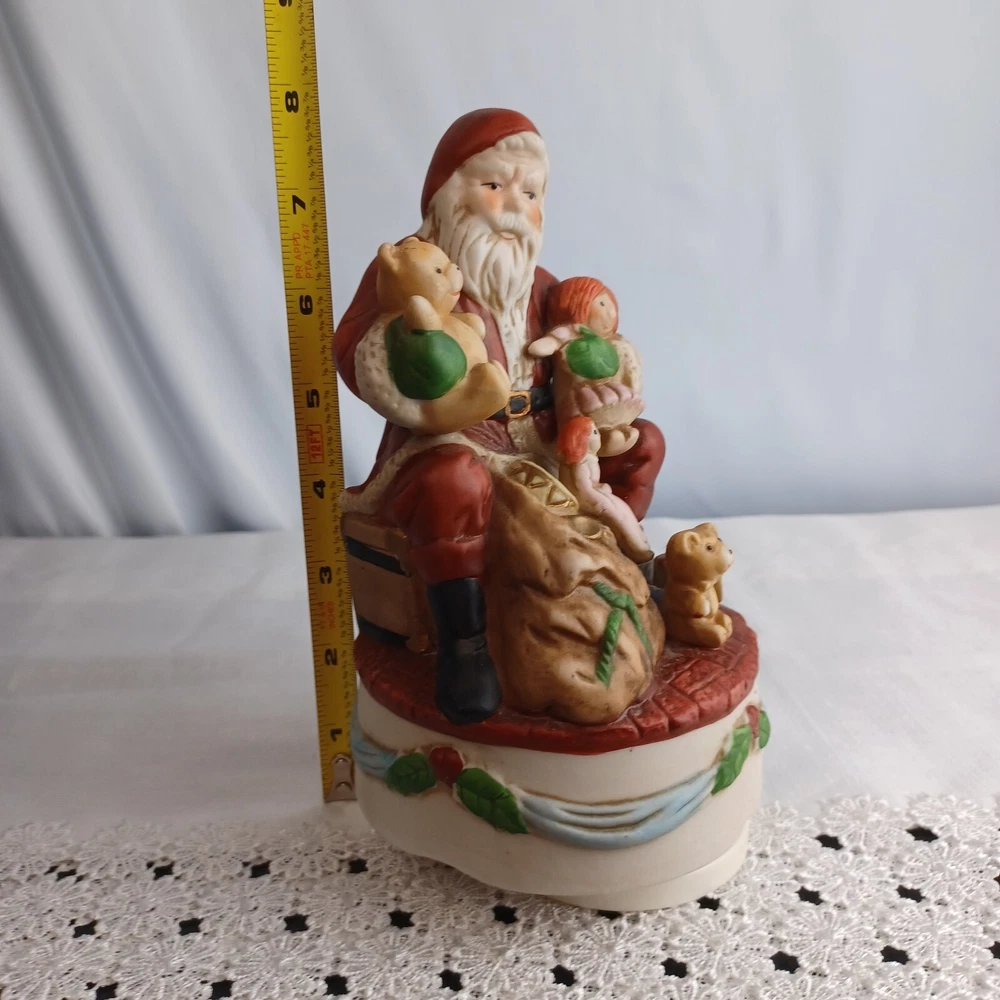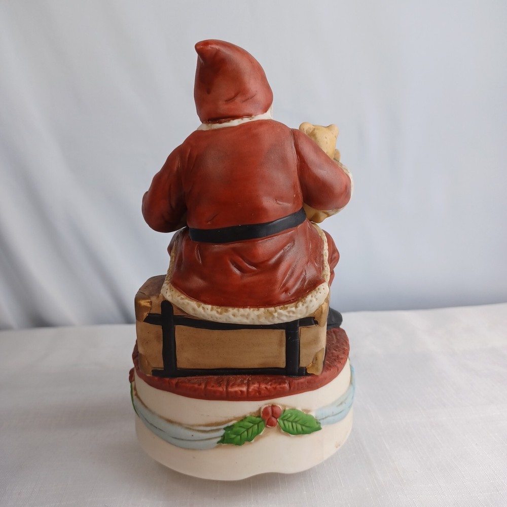 This is in excellent working order with no chips or flea bites. There is a round hole in the bottom but I believe it was made that way...shown in pictures. Plays the tune "White Christmas" while rotating. Please view all pictures carefully for measurements and details.
