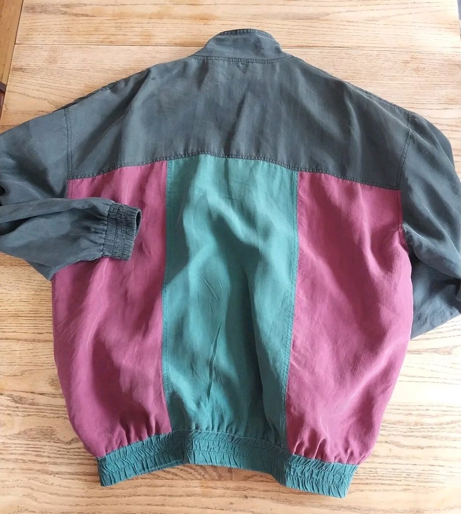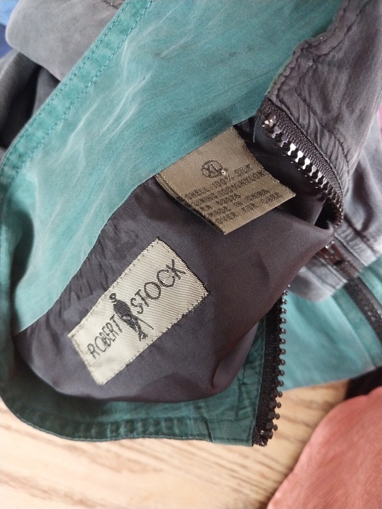 Introducing a limited edition vintage Robert Stock windbreaker jacket from the 90s. This colorful jacket features a geometric pattern and a point collar style. The outer shell is made of soft silk material and the lining is made of nylon. The jacket is equipped with a full zip closure and is wind-resistant, making it perfect for any season. In addition, the jacket has several features such as windproof, lightweight, quick-dry, and breathable. It also comes with pockets for convenience. This jacket is a perfect addition to any retro or vintage clothing collection. Available in size XL, this unisex jacket is suitable for anyone looking for a stylish and comfortable outerwear option.