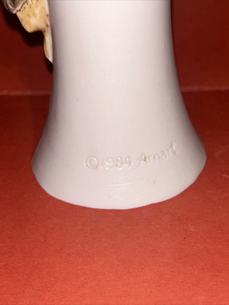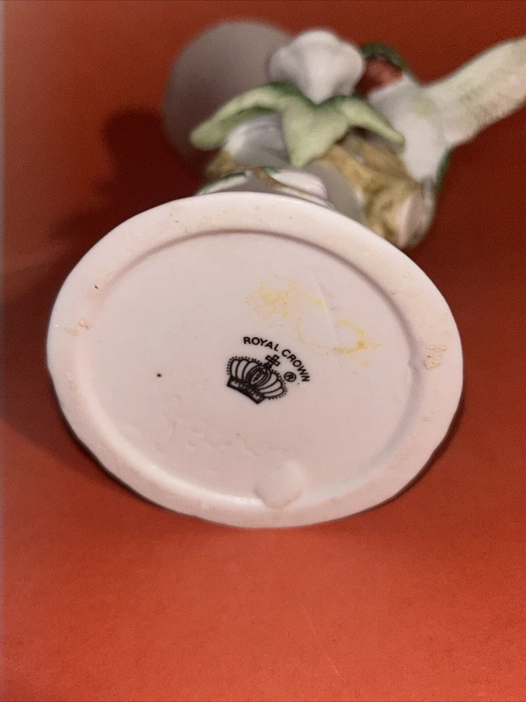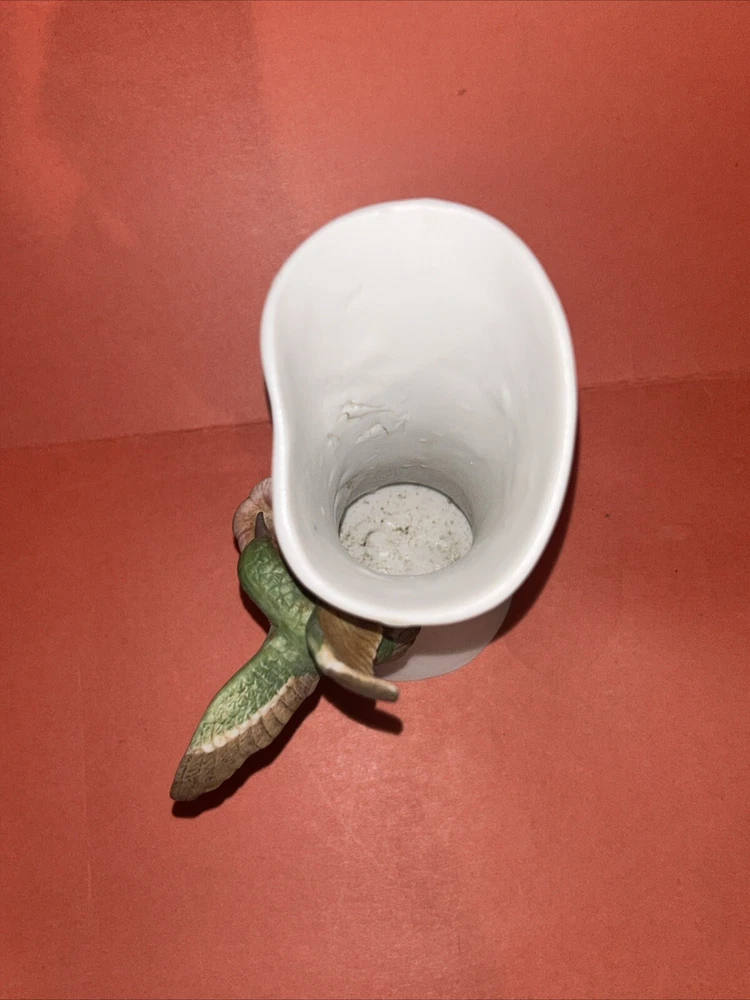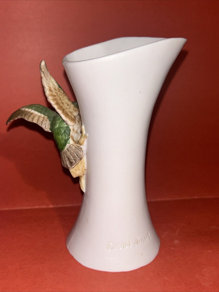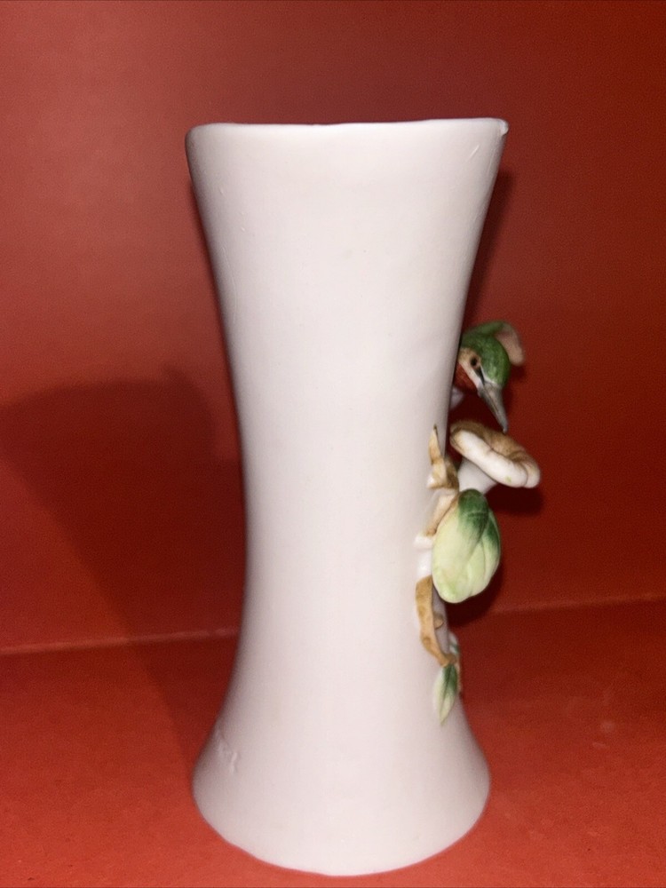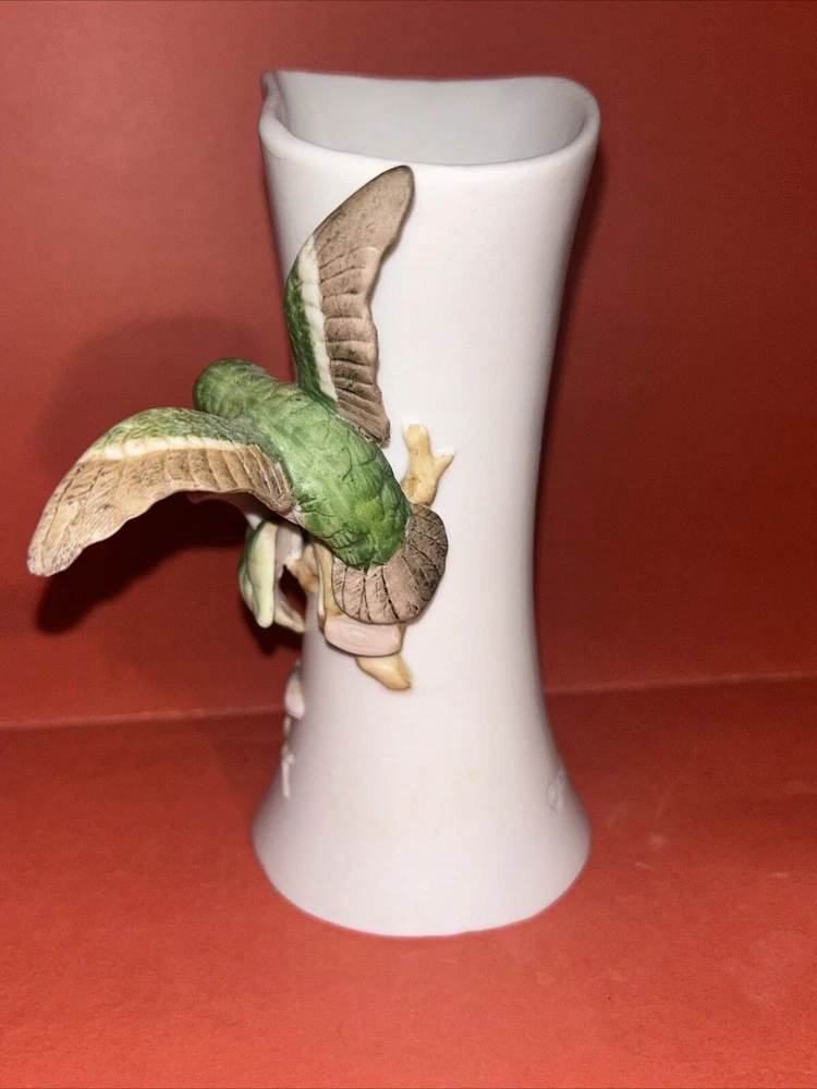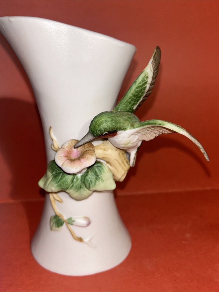 1984 Vintage Royal Crown Arnart Imports Porcelain 3D Hummingbird Vase With Flower. 5.75" Tall. This vase features a green hummingbird with red throat feeding from a pink flower. The hummingbird figurine protrudes about 2.5" from the vase. Condition is Used.