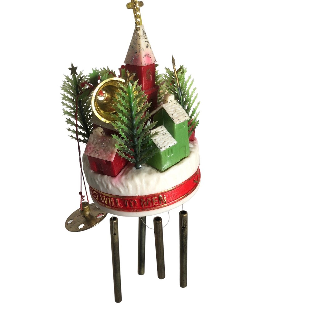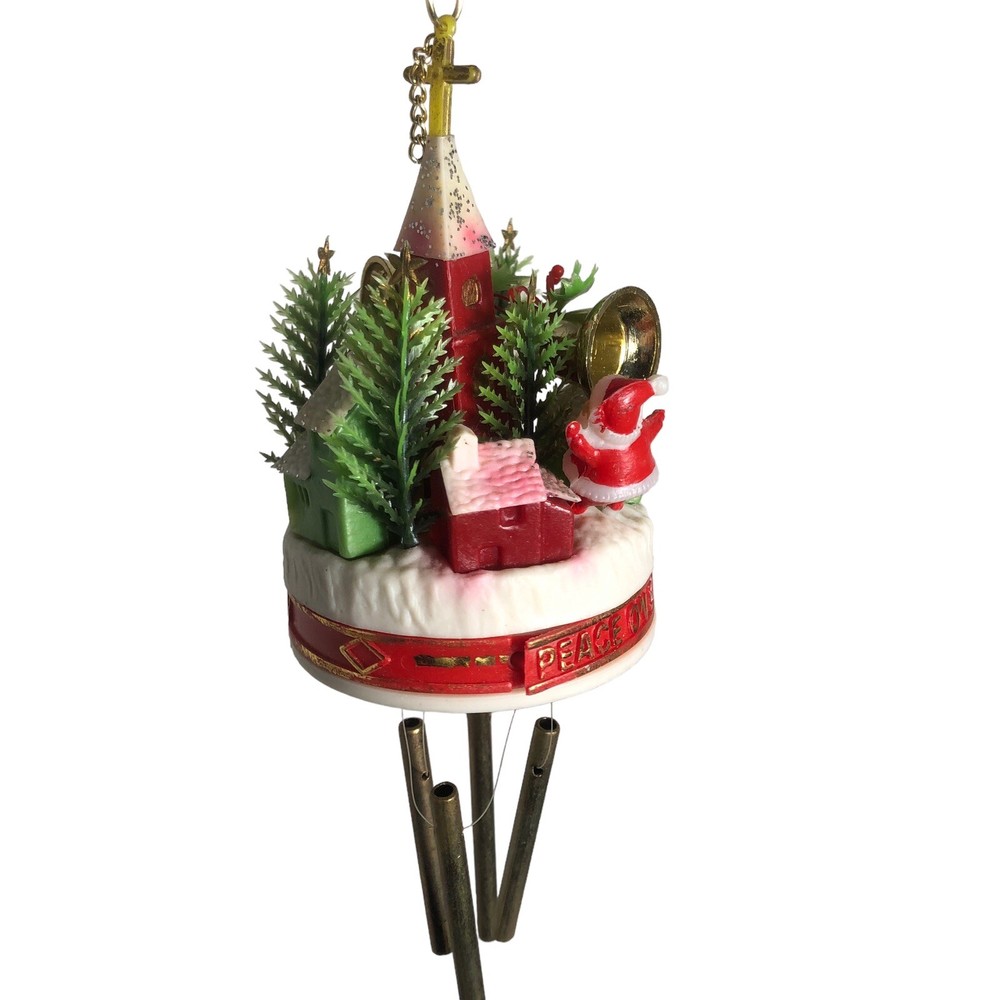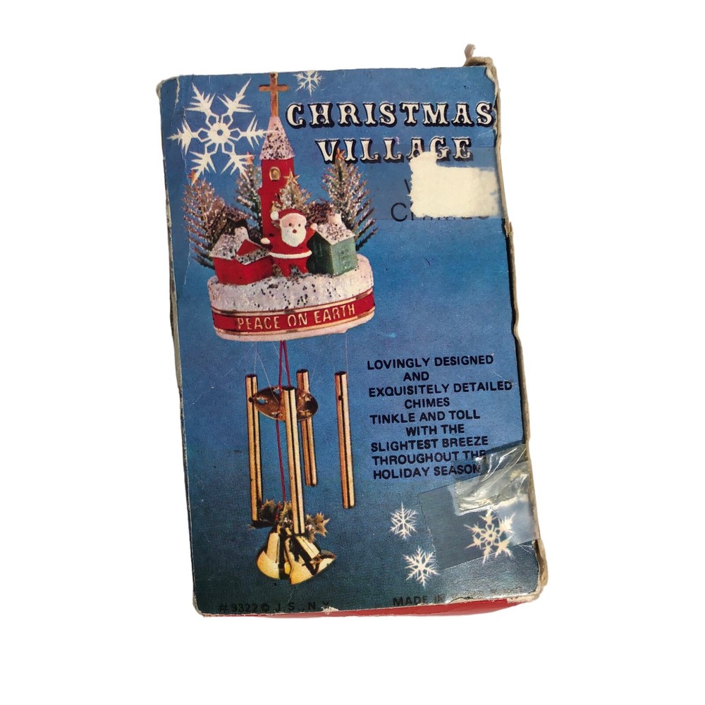 This adorable vintage Santa wind chime is a charming holiday find! The figurine is in great condition with vibrant colors, standing about 10" tall. The peaceful "Peace on Earth" church design adds a nostalgic touch—perfect for festive decor. The box is a bit worn, but the piece itself is lovely and ready to spread Christmas cheer with its gentle chimes.