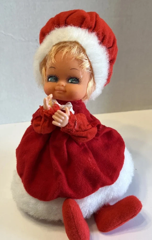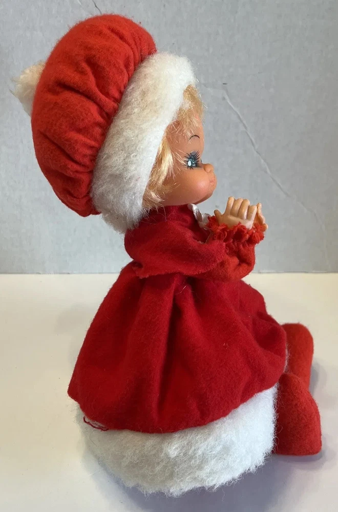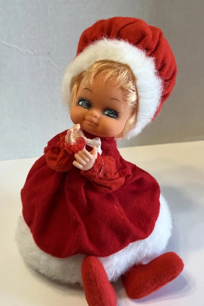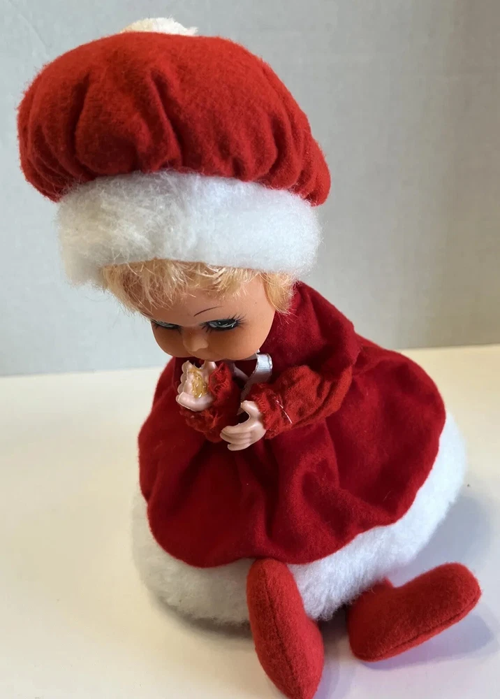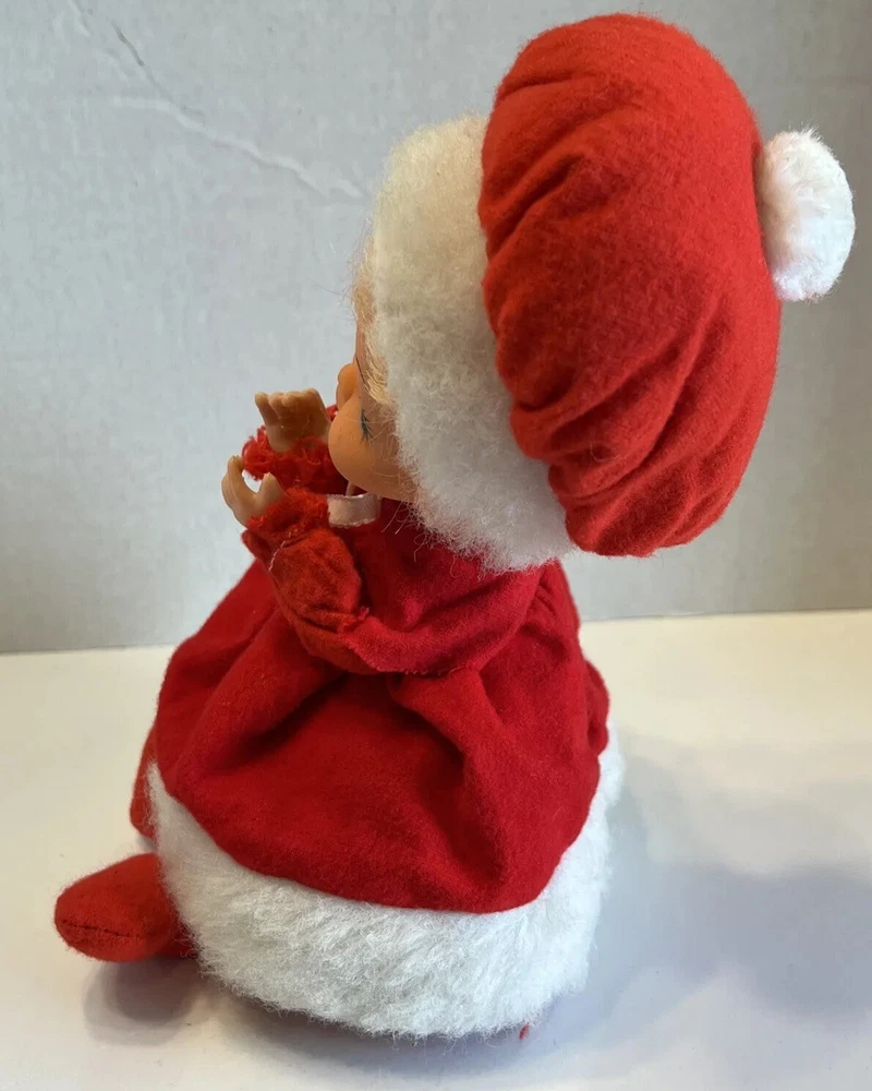 Vintage Christmas Sankyo Wind up Musical Moving Mrs Claus Figure. Plays “Jingle All Way” as the figure moves at the waist area. Sits about 9” in height. Music box works great as does movement of the dolls upper torso. Lower part of doll doesn’t move - designed to sit on edge of shelf or any flat surface. It appears the doll originally held something in its hand because I can see glue residue on its hand. This is a used vintage item with signs of age & use - marks on plastic face, glue residue inside one hand & a stitch has come loose on the back of her dress where it meets the white fur like accent.