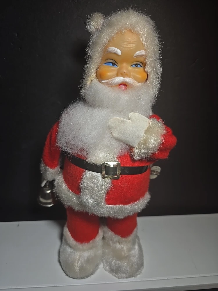 This adorable vintage Santa figurine brings nostalgic holiday cheer! The wind-up mechanism still works perfectly, making Santa ring his little bell with a charming jingle. The pink tin design is so unique and festive—it’s a wonderful conversation starter for my Christmas display. Love the retro 1950s vibe!