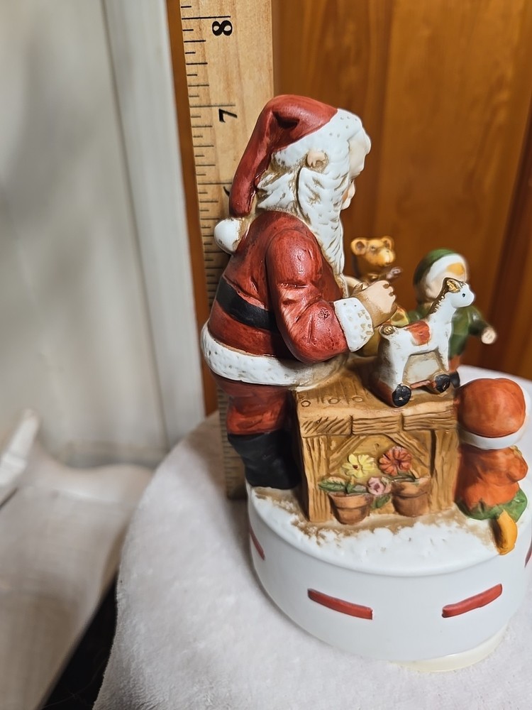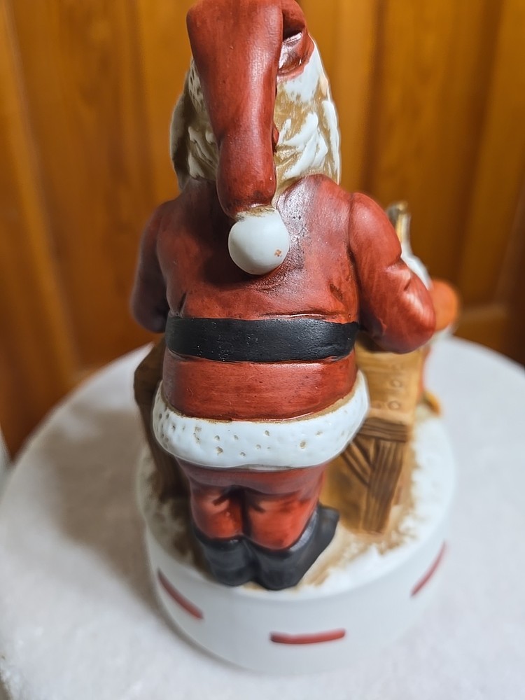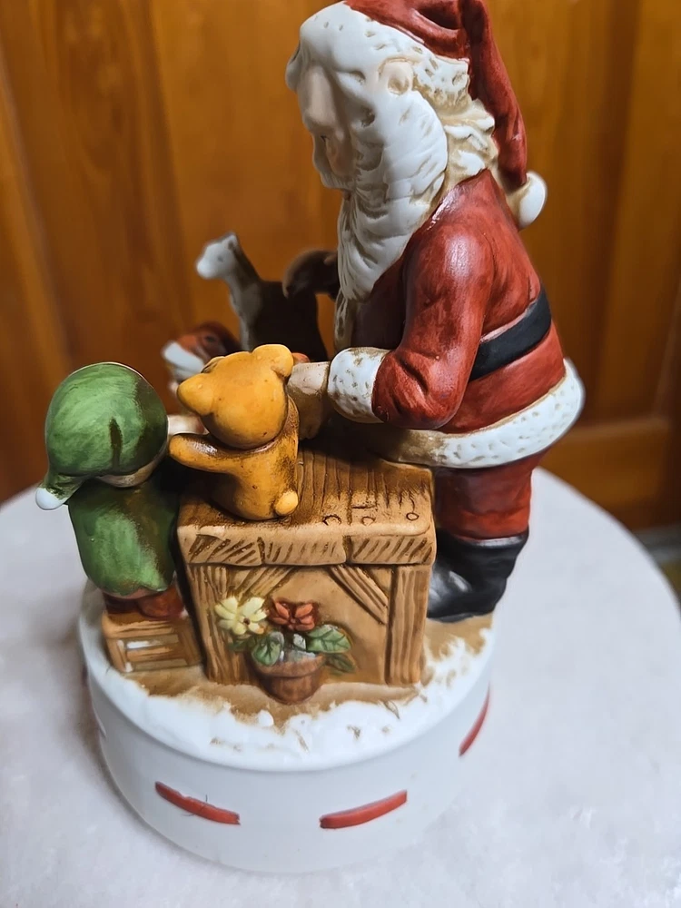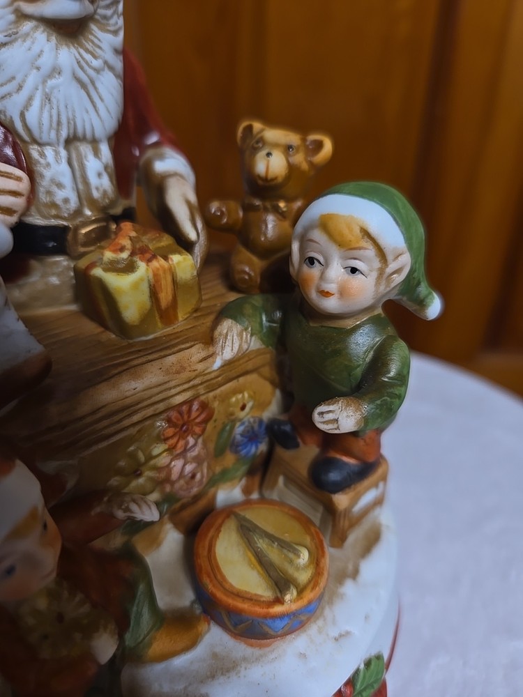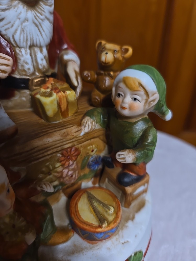 The only wear that I see are some marks on the underside of the porcelian figure in the pics.The Vintage Santa Workshop with Elves Toys is a charming collectible figurine that captures the spirit of Christmas. With a whimsical design featuring Santa and his elves at work in the workshop, this wind-up toy plays a festive tune as it rotates, I cant place the tune Its right on the tip of my tongue but it want come out.adding a playful touch to any holiday display. Perfect for collectors or anyone looking to add a nostalgic touch to their seasonal decor, this Santa figurine is a delightful addition to any holiday celebration.