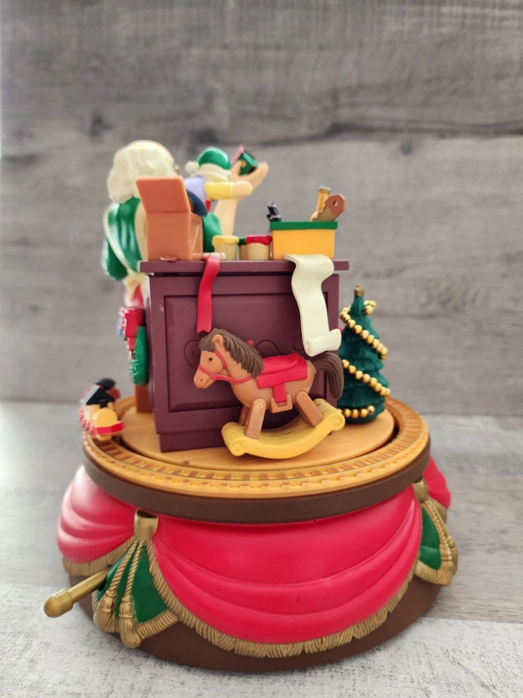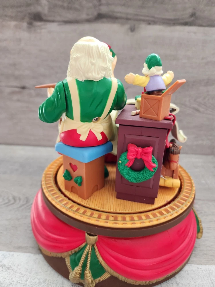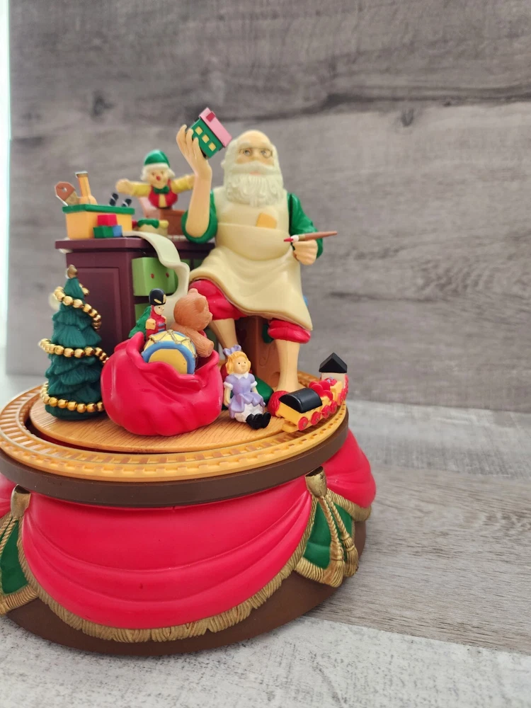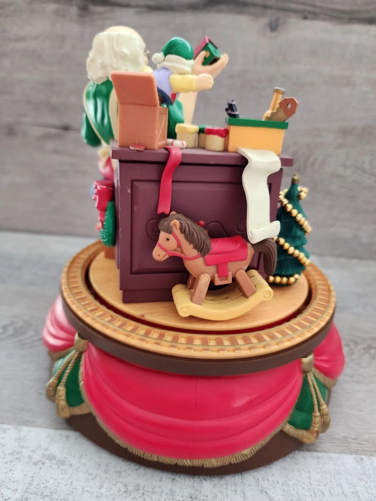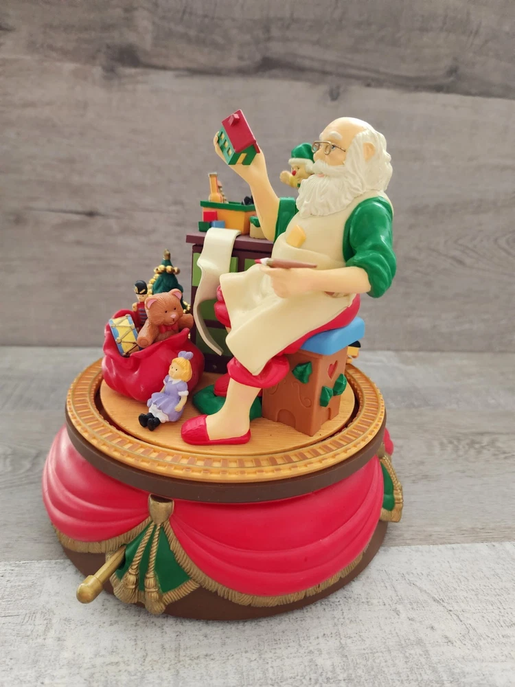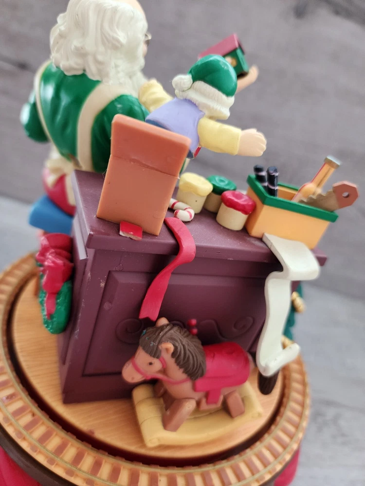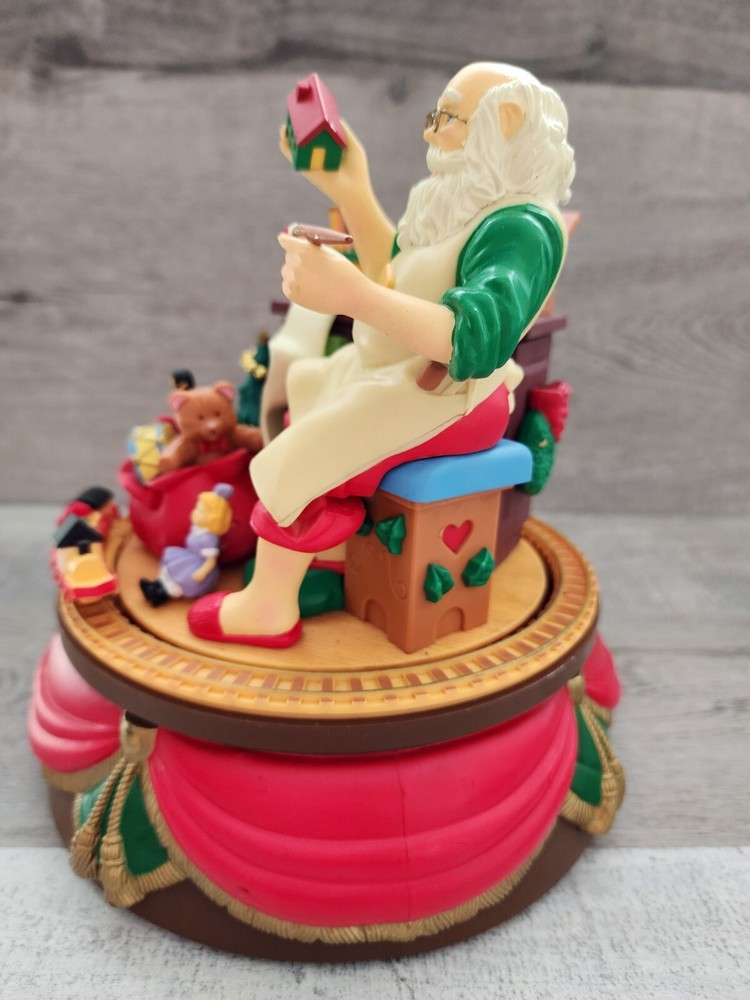 Vintage Santas Best Animated Music Box Christmas Santa Claus Wind Up Decor 1992. For your consideration is this vintage Enesco music box. While the original box is not included, the power supply cord will be (as applicable). I do my very best to identify any flaws but you need to review the photos very carefully to assess condition. These music boxes are very fragile and have many small pieces so it can be easy to miss flaws. One of the ribbons is missing on the back. For most items, I do combine shipping but for the amount of packing materials needed for these and to provide the safest shipment for these items, I cannot. I do have several available and hope you find one you find absolutely delightful!