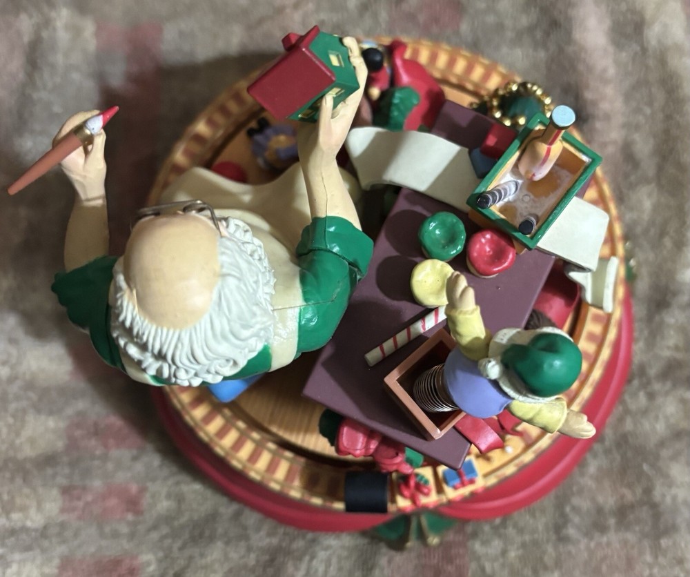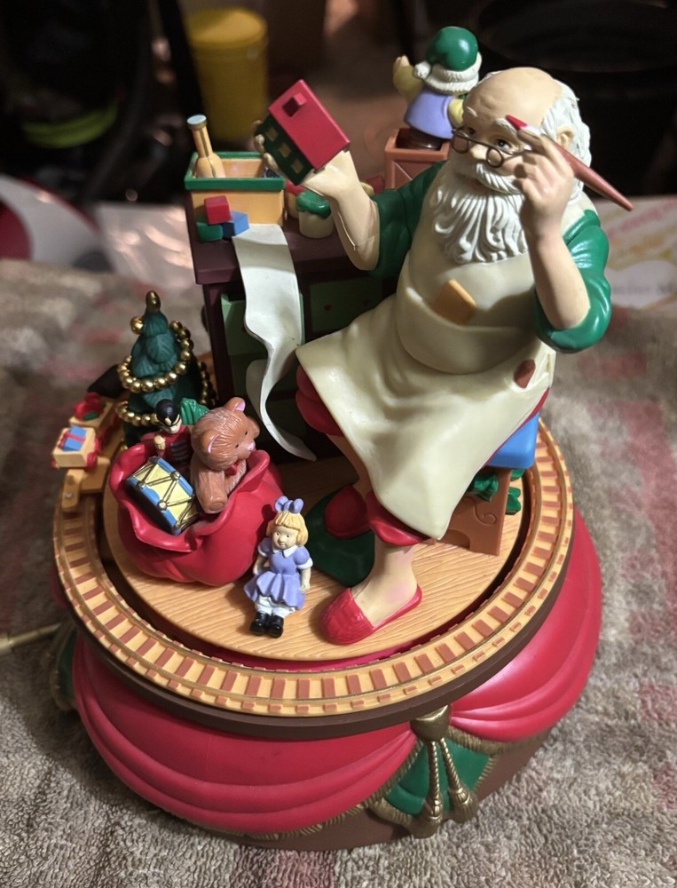 This charming vintage music box brings nostalgic holiday cheer with its playful animated Santa and classic wind-up melody. The detailed design and original packaging make it a delightful collector’s piece or festive decor. Perfect for adding a touch of retro Christmas magic to any home!