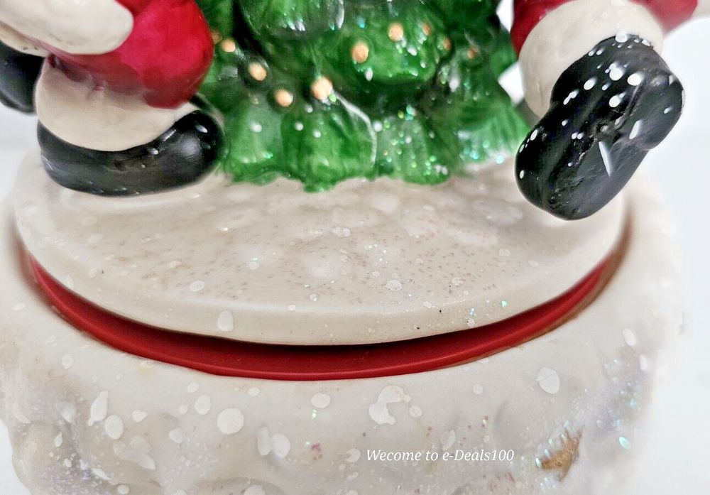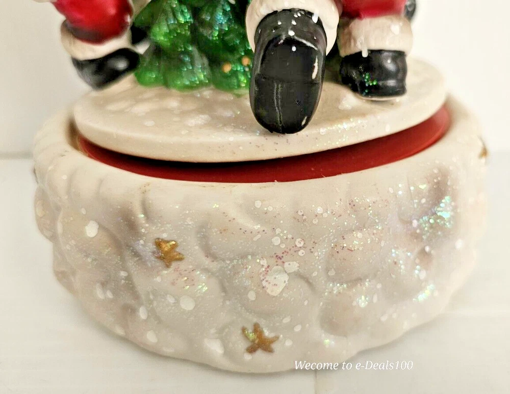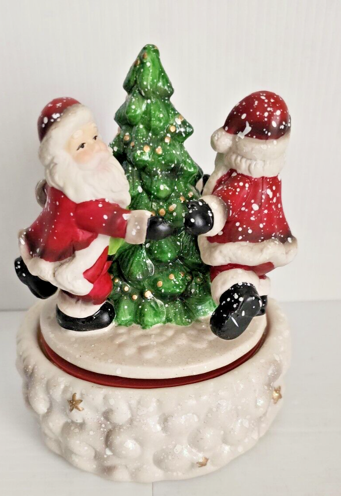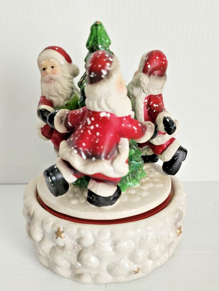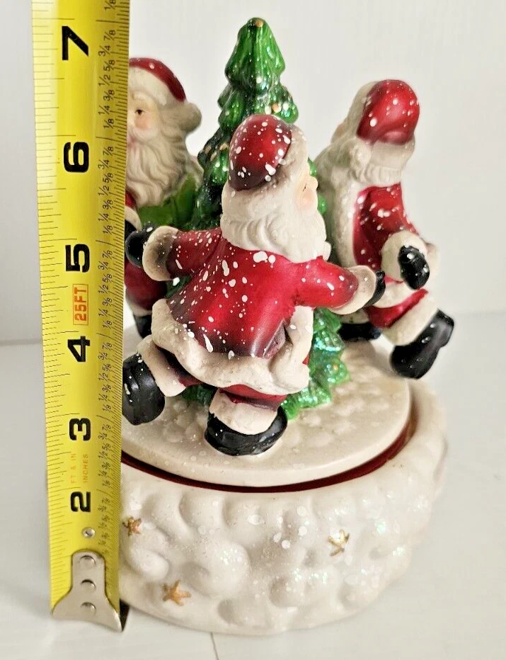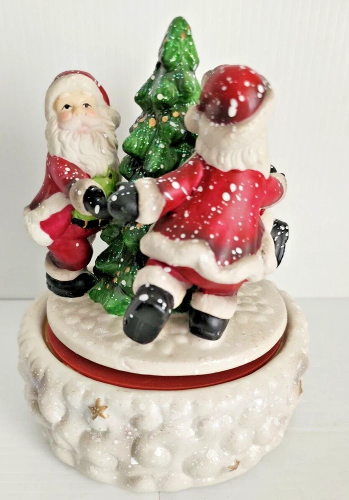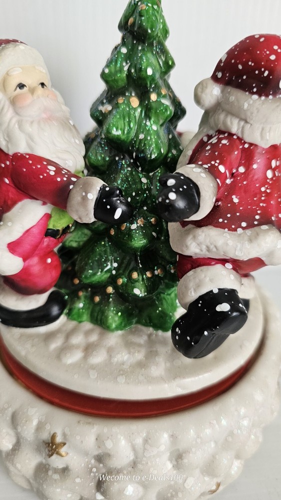 This vintage Santa's Best Animated Music Box features a traditional Santa Claus design with a whimsical twist, as it is asymmetrical in shape and animated. The wind-up music box plays melodies while the Santa figure moves, adding a festive touch to your Christmas decor. Handmade from ceramic and porcelain, this medium-sized figurine from 1992 is a unique collectible item that showcases a multicolor finish and a Boxing theme, making it a charming addition to any holiday display.