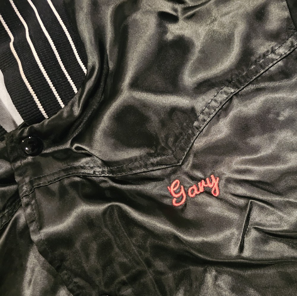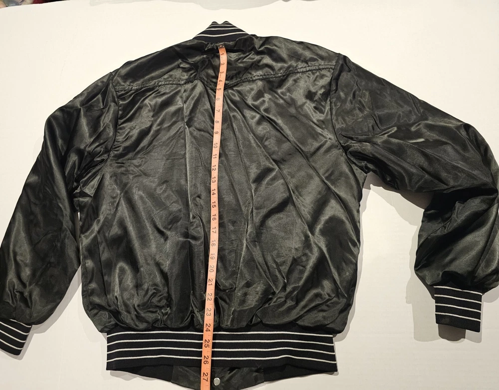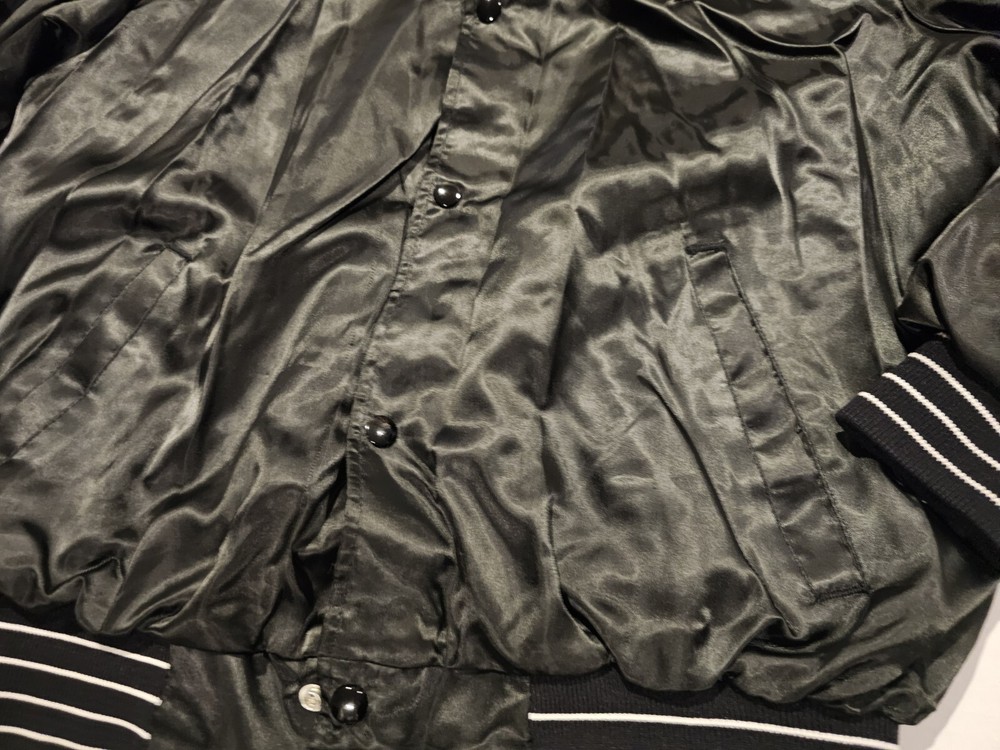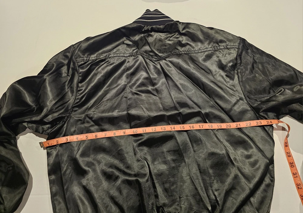 Elevate your streetwear style with this Vintage Satin Bomber Jacket in black. Made by United Sports Apparel, this limited edition coat features snap closure, elastic waist, and pockets. The lightweight wind-resistant design is perfect for all seasons and occasions including travel, parties, and casual outings. Crafted from nylon outer shell material and polyester lining, this jacket is machine washable for easy care. The classic retro style with accents of 80s and 90s Y2K and college sports themes makes it a must-have for any fashion-forward man. The jacket is available in size large and fits regular size type. The chest size can be viewed in the pictures. Get your hands on this vintage varsity bomber blank model and add a touch of streetwear to your wardrobe today!