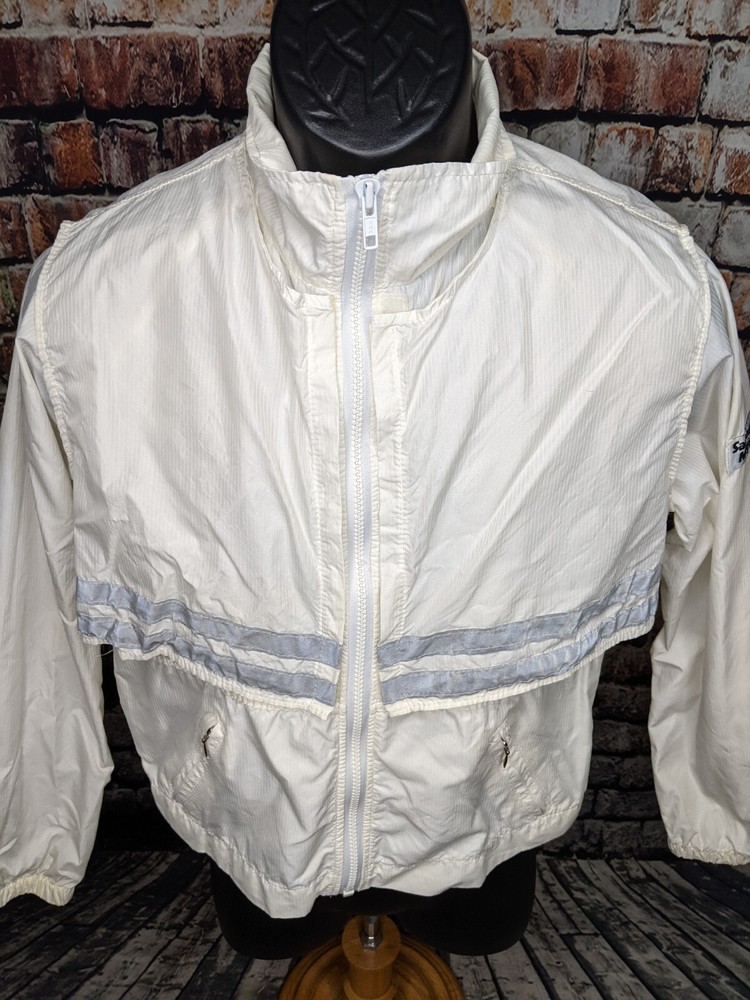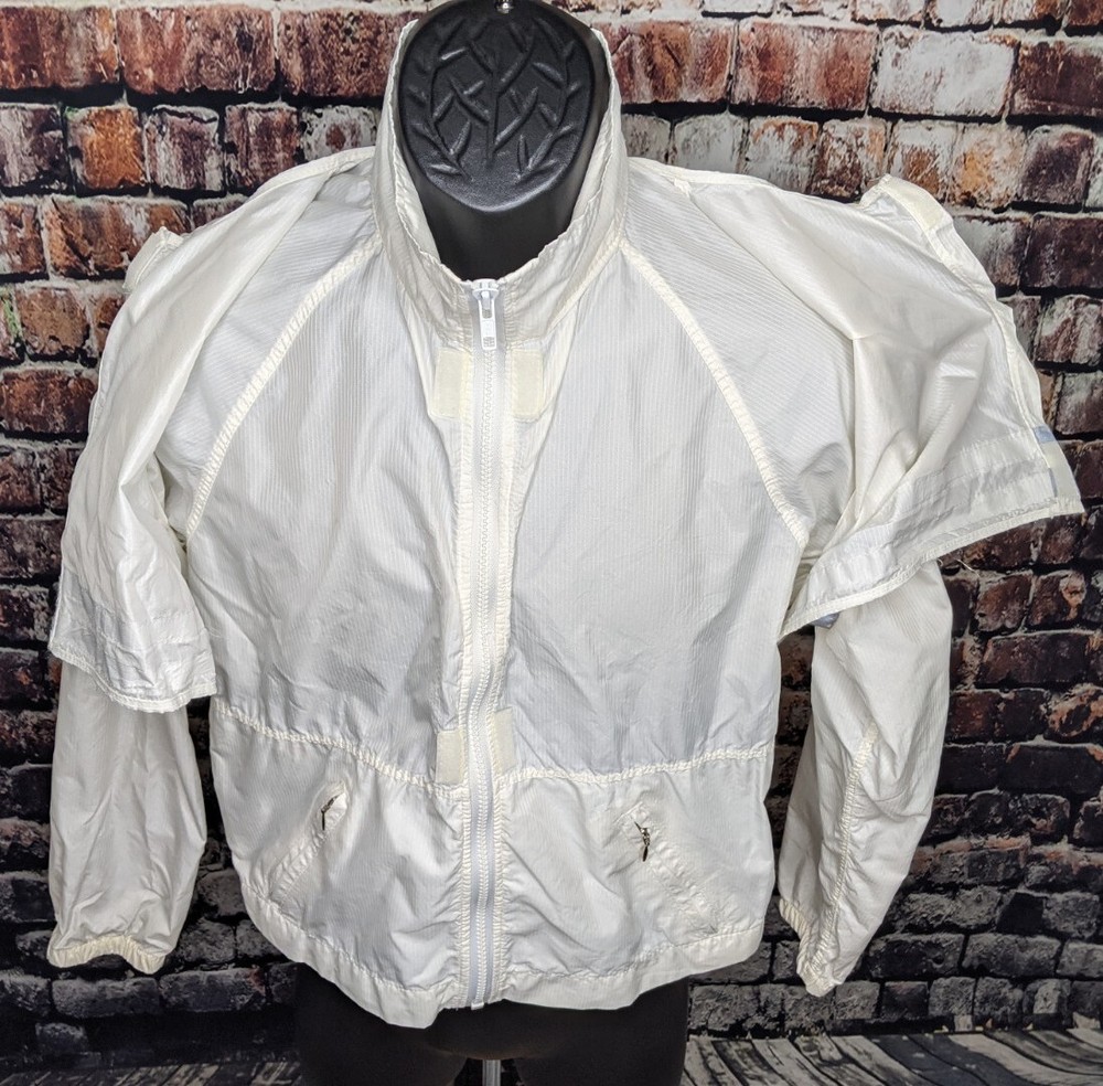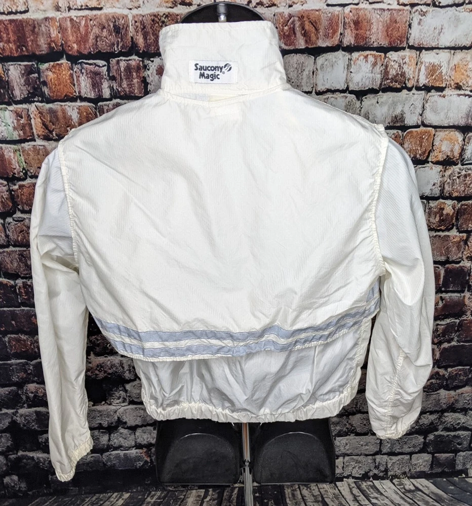 CLASSIC SAUCONY MAGIC - CIRCA 1990'S I BELIEVE - VENTILATED WEATHER RESISTANT JACKET PERFECT FOR CYCLING / RUNNING / TENNIS / OR JUST AT THE GYM! WHITE IN COLOR WITH REMOVABLE REFLECTIVE VEST WITH PIPING ON FRONT AND BACK STYLISH SHORT DESIGN WOMENS SIZE LARGE = 20" ACROSS CHEST LAID FLAT X 22" LENGTH ZIPPERED FRONT POCKETS