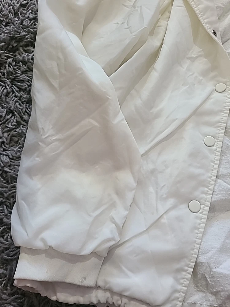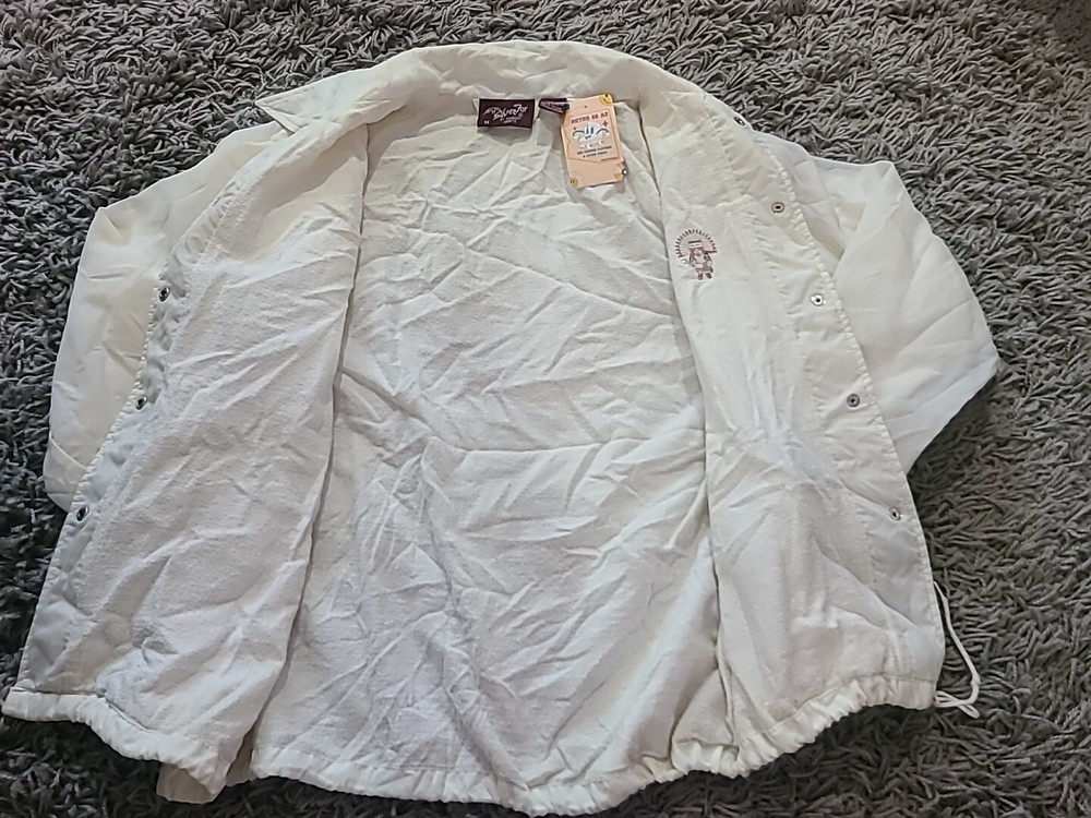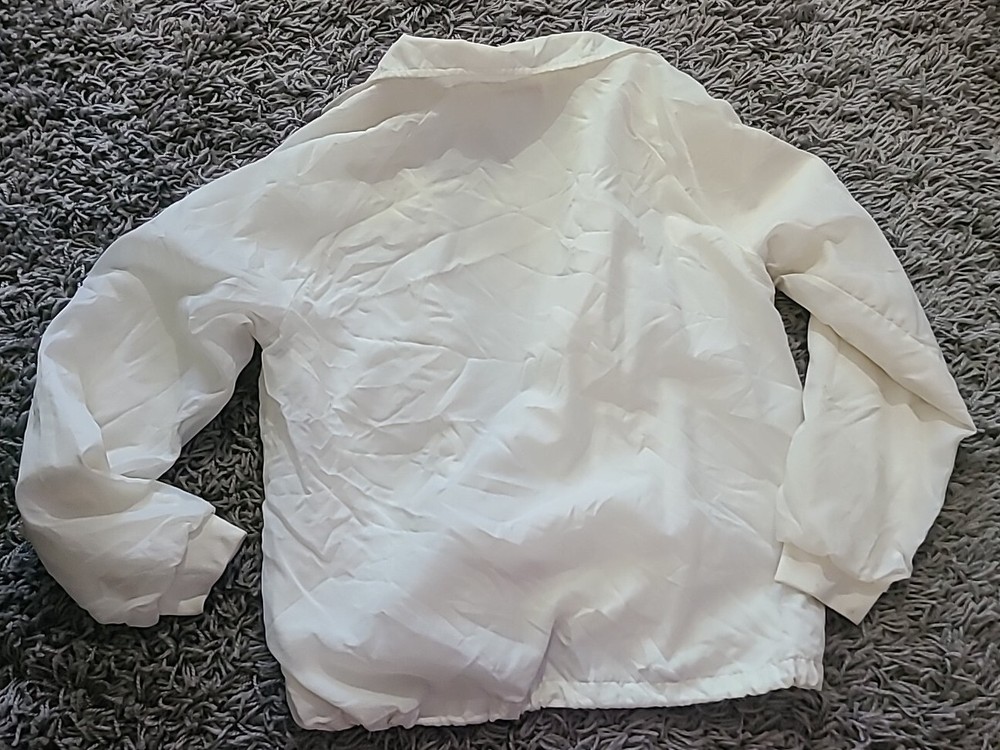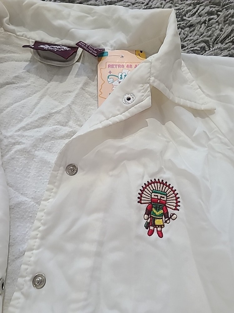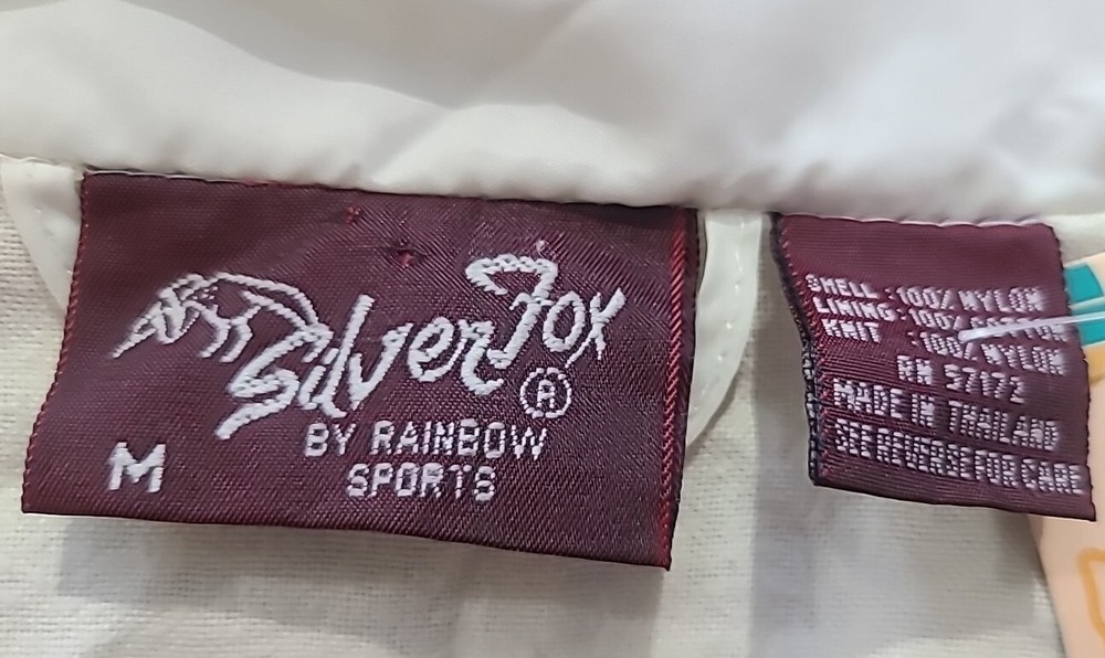 Embrace a vintage look with this Silver Fox by Rainbow Sports windbreaker jacket, perfect for all seasons. The mid-length jacket features a collared neckline and snap closure, making it an ideal choice for walking, cycling, and hiking. The outer shell material is made of 100% nylon with wind-resistant capabilities, while the cotton insulation material ensures warmth and comfort during colder weather. The white jacket comes in size M and has a classic fit, featuring a solid pattern with a subtle Kachina character design. The jacket's unique vintage look adds a touch of charm, making it a desirable item for any activewear collection. This jacket is a perfect addition to your wardrobe, whether you're looking for a casual and comfortable outfit or a stylish and sporty look. *Flaws shown in last photo.