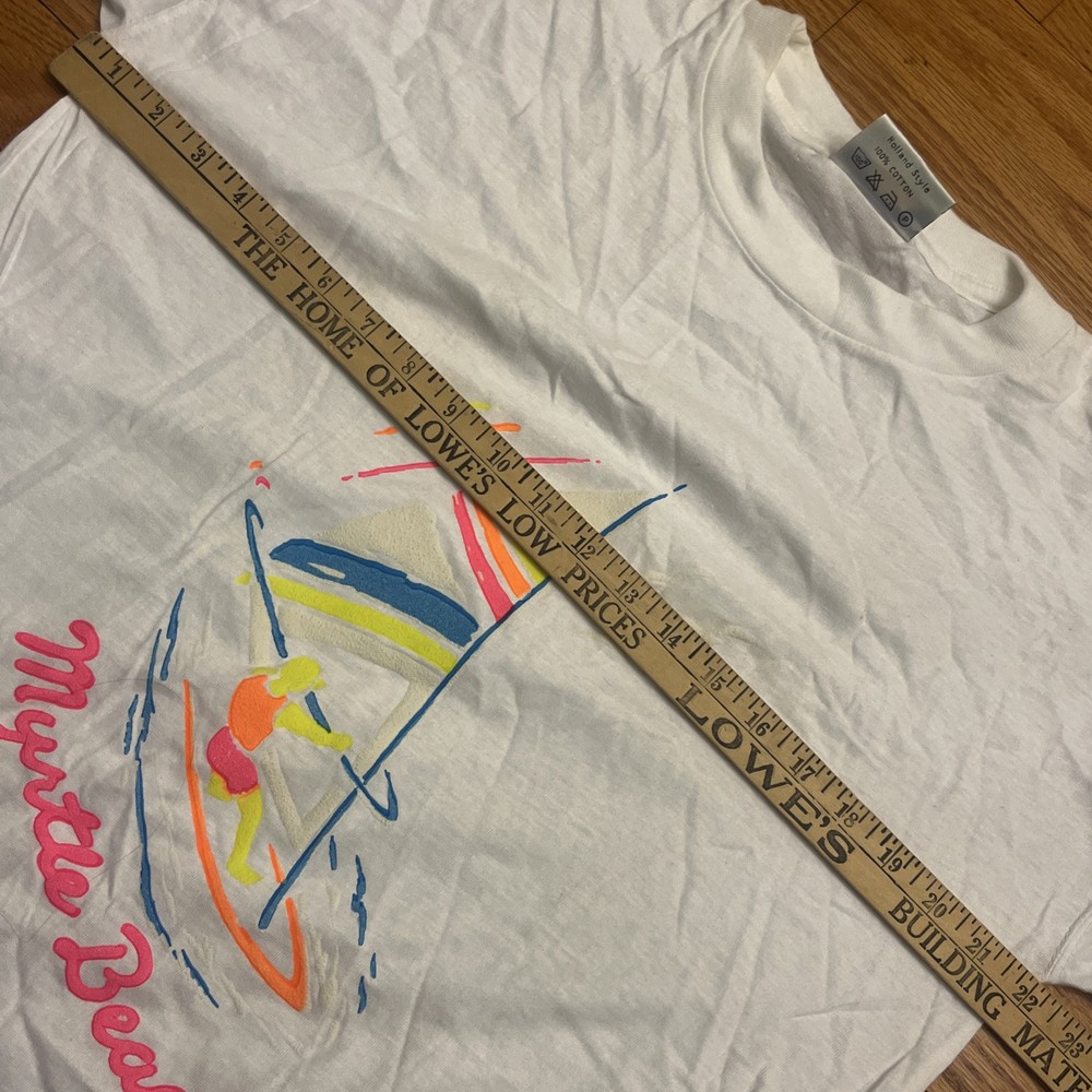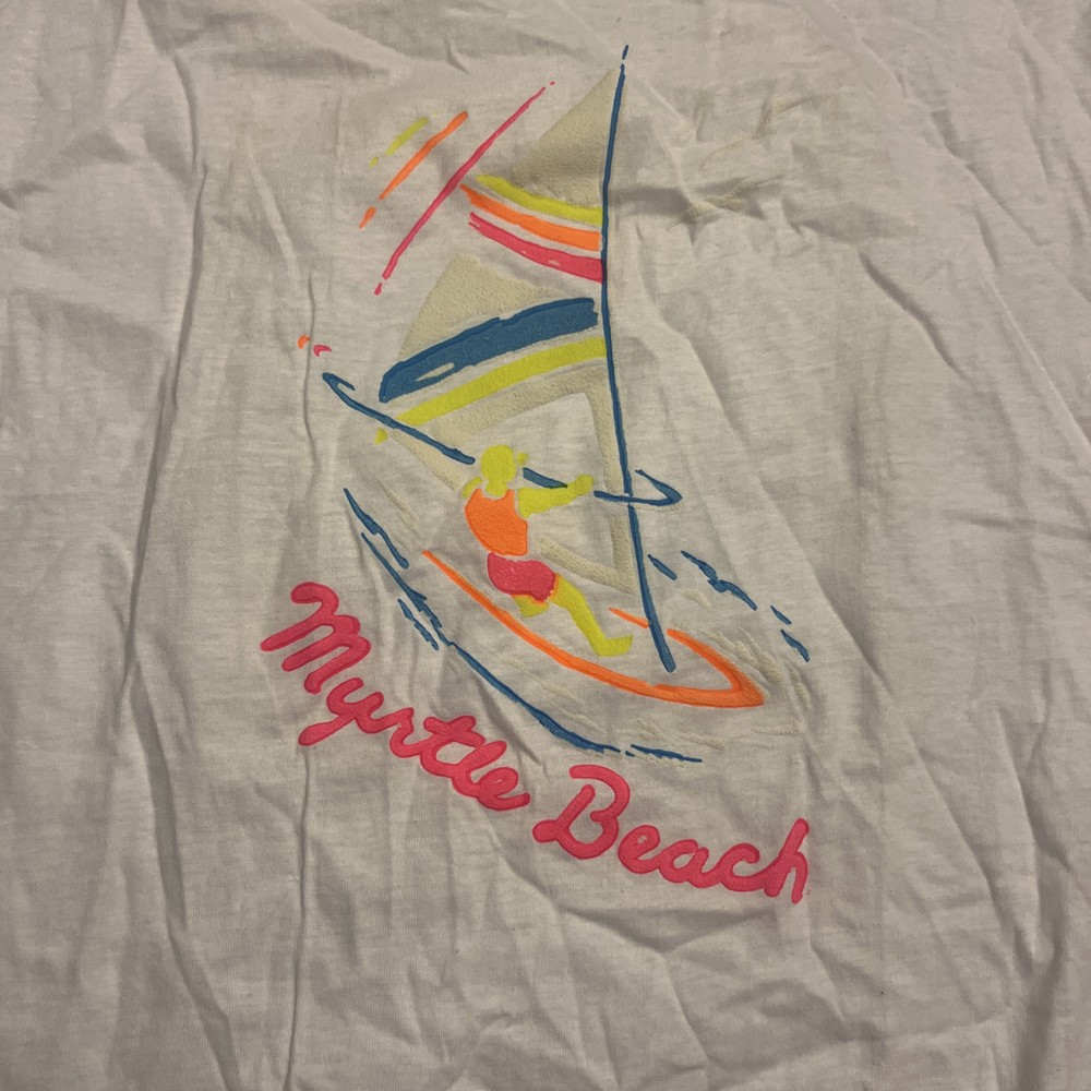 This is a fantastic souvenir neon colored Holland style T-shirt that’s from Myrtle Beach and has a wind surfer with his sail and some seagulls or birds in neon pink, orange yellow blue white. it appears unworn, but I am not the original owner. See the photos for details. Ask any questions AI description This vintage XL T-shirt from Bright Light features a neon 80s style Myrtle Beach wind surf design. It is made of cotton knit fabric with a crew neck and short sleeves, perfect for all seasons. The graphic print showcases a beach theme, ideal for summer wear. Made in the United States, this retro souvenir shirt is a vibrant addition to any collection. Approximate measurements Pit to pit 22” inches. Down the back base of collar to tail 27 1/2” inches.
