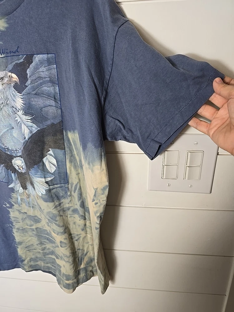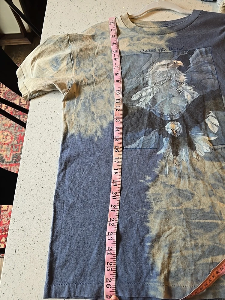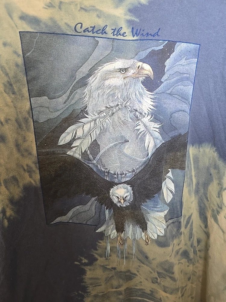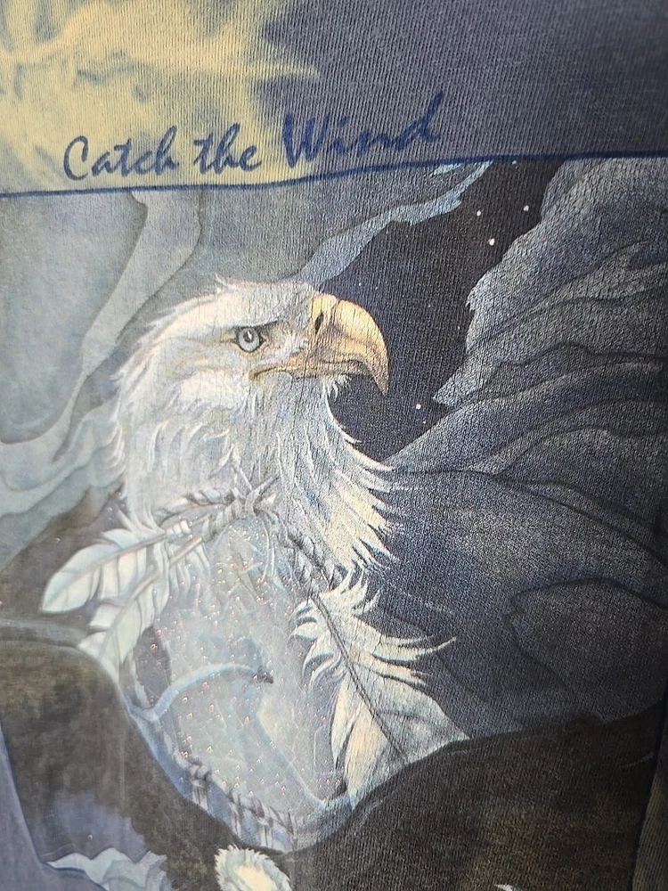 This is a vintage men's t-shirt made by Anvil in the United States. It features a tie-dye pattern in blue with a glittery eagle design and the phrase "Catch The Wind". The shirt has short sleeves, a crew neckline, and a classic fit. It is made of cotton and has a single stitch. The shirt is perfect for those who love 80s and 90s fashion and can be worn in all seasons. Excellent preowned condition