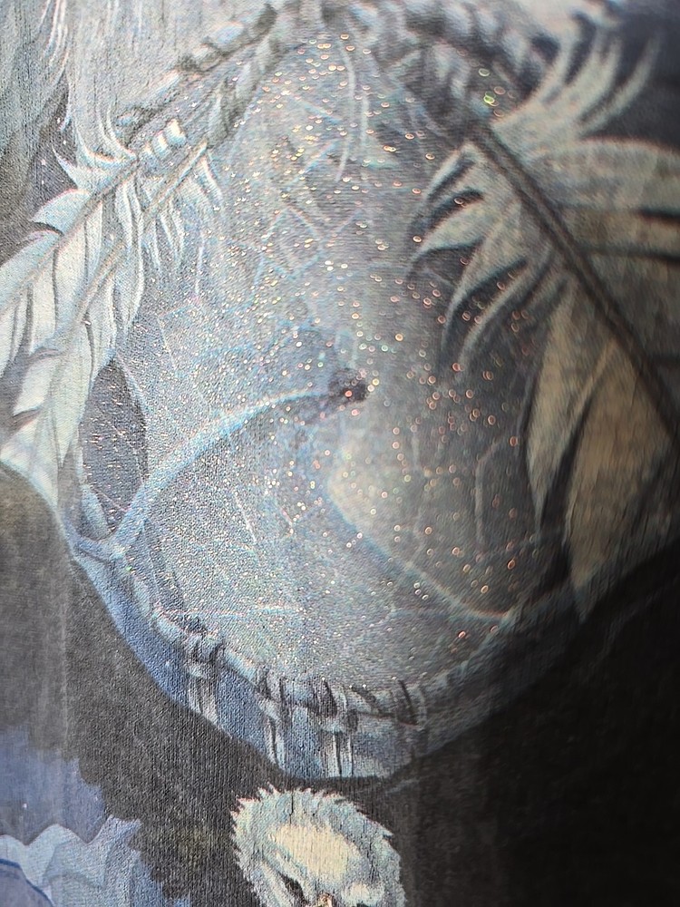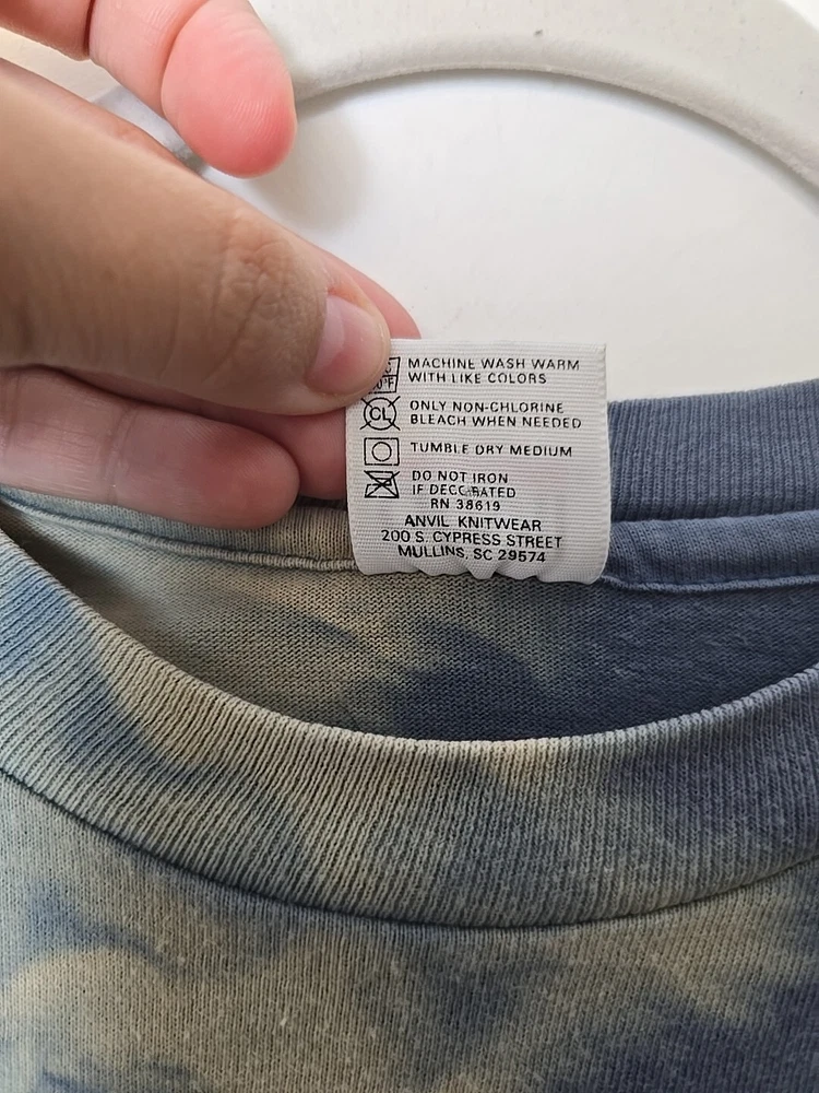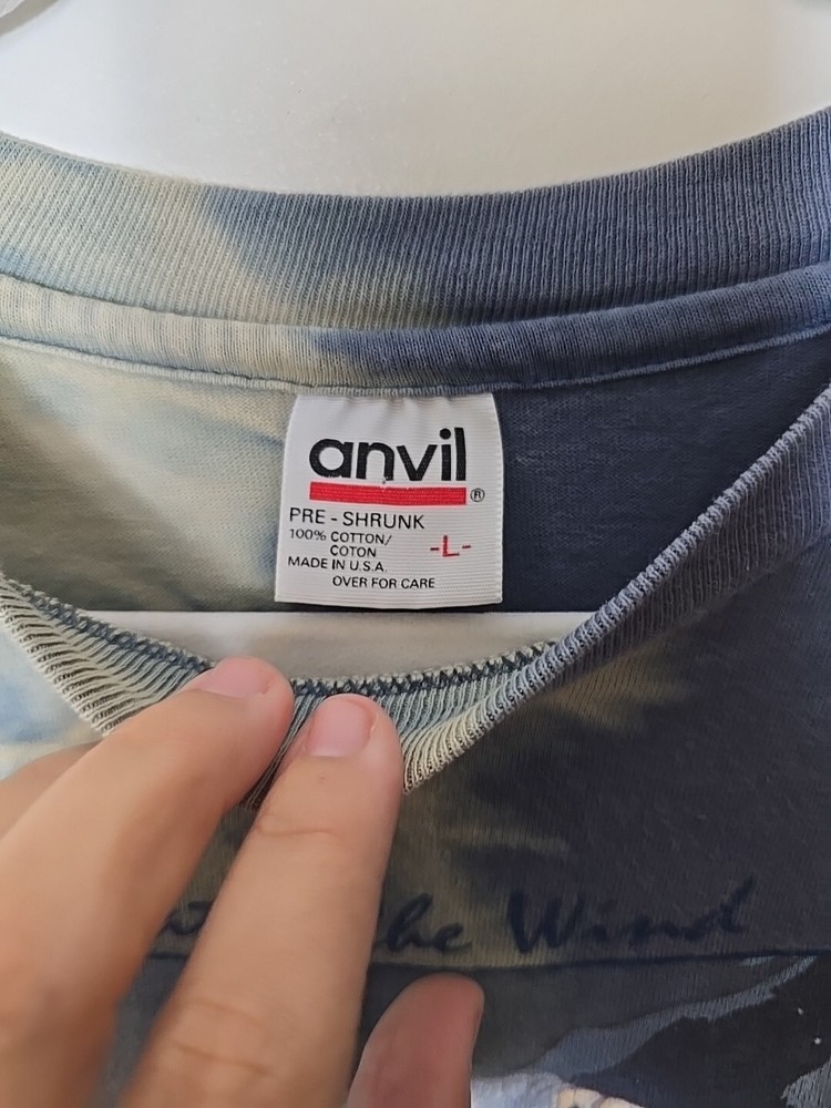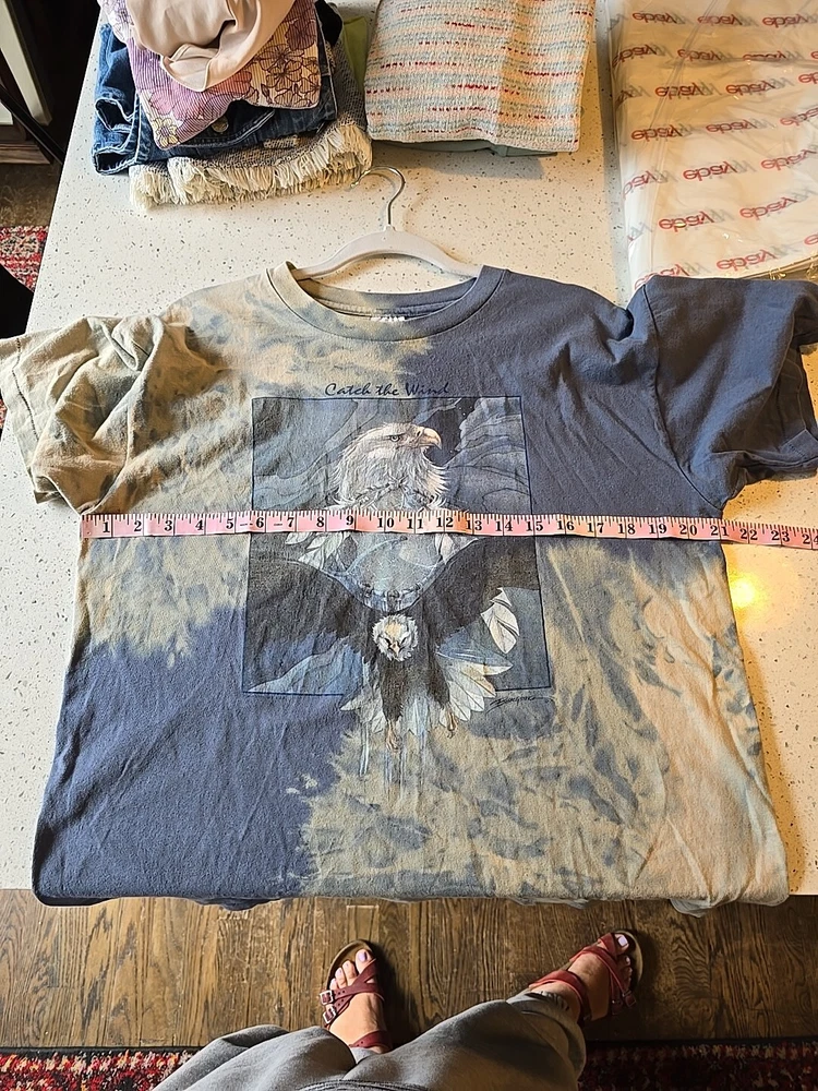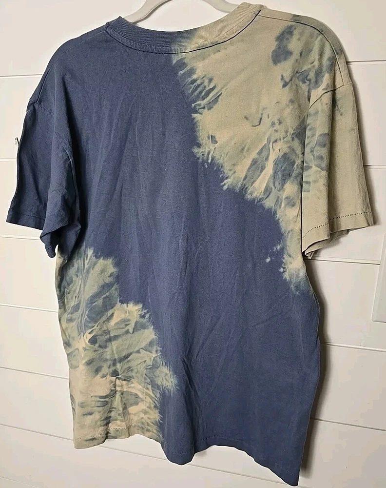 This is a vintage men's t-shirt made by Anvil in the United States. It features a tie-dye pattern in blue with a glittery eagle design and the phrase "Catch The Wind". The shirt has short sleeves, a crew neckline, and a classic fit. It is made of cotton and has a single stitch. The shirt is perfect for those who love 80s and 90s fashion and can be worn in all seasons. Excellent preowned condition