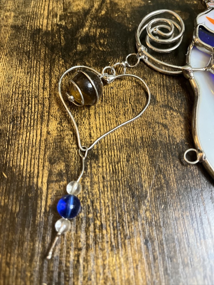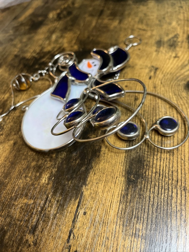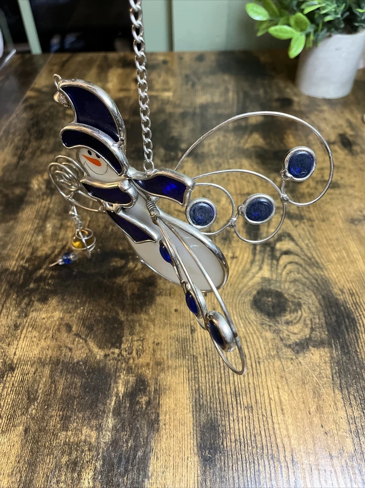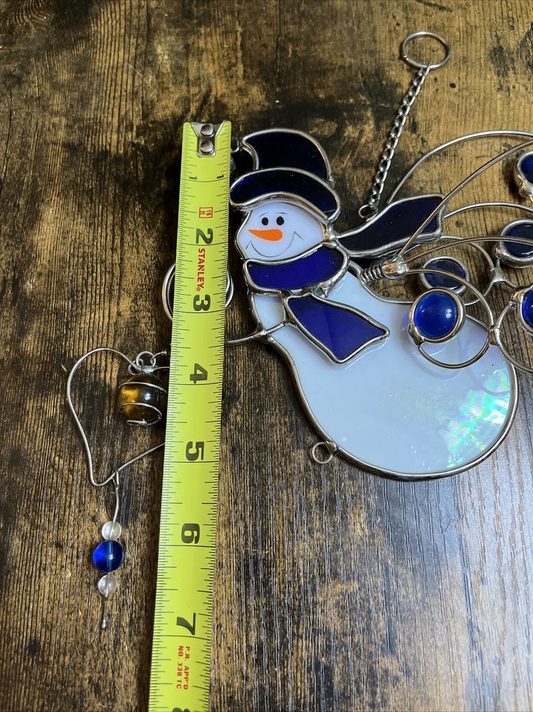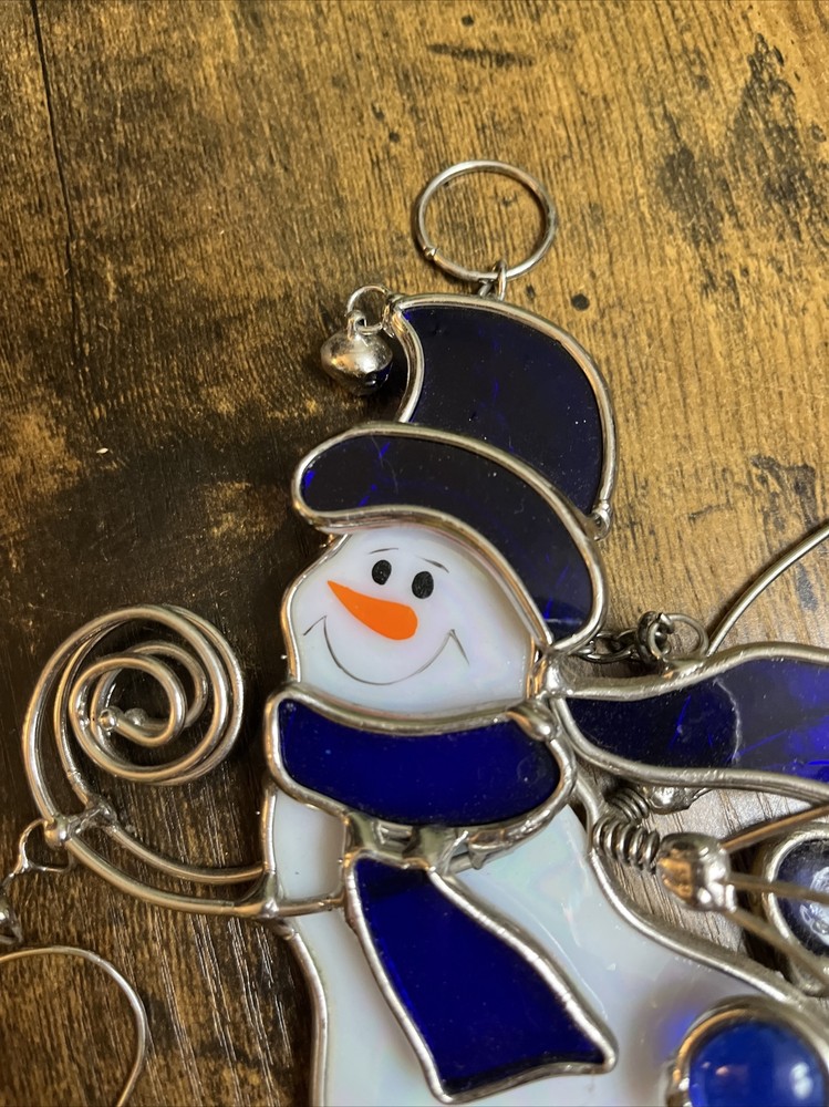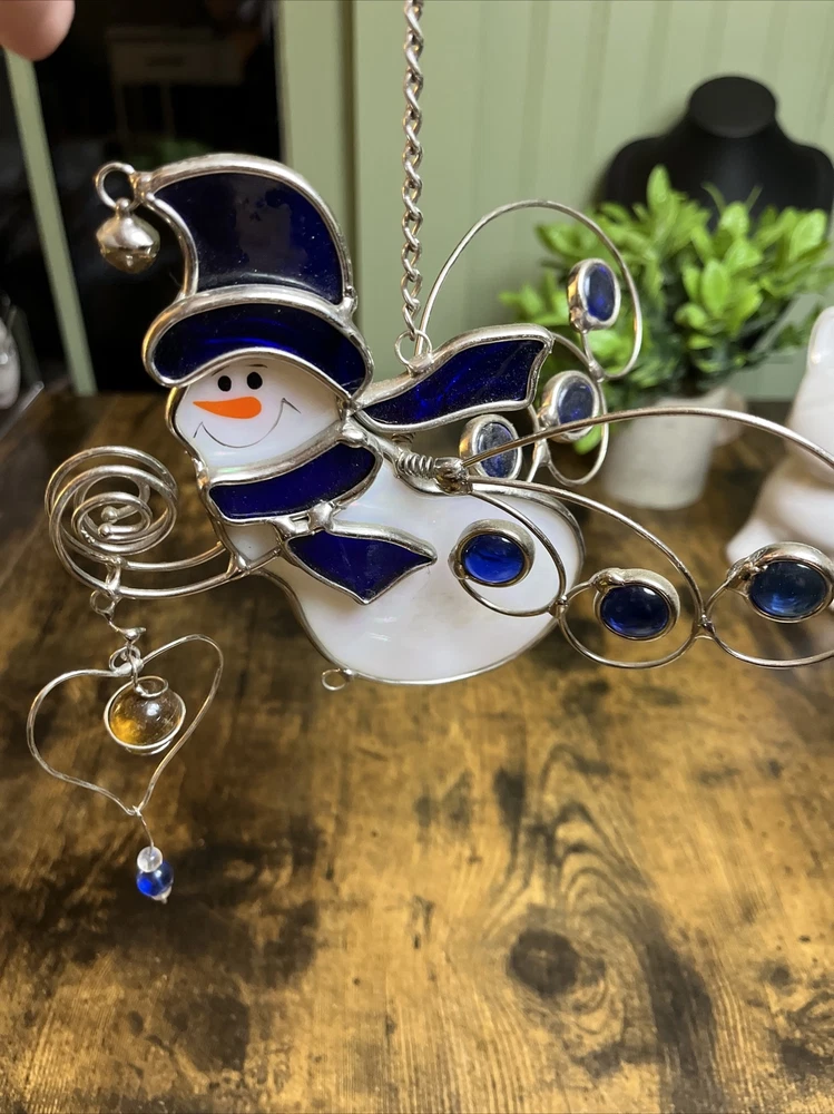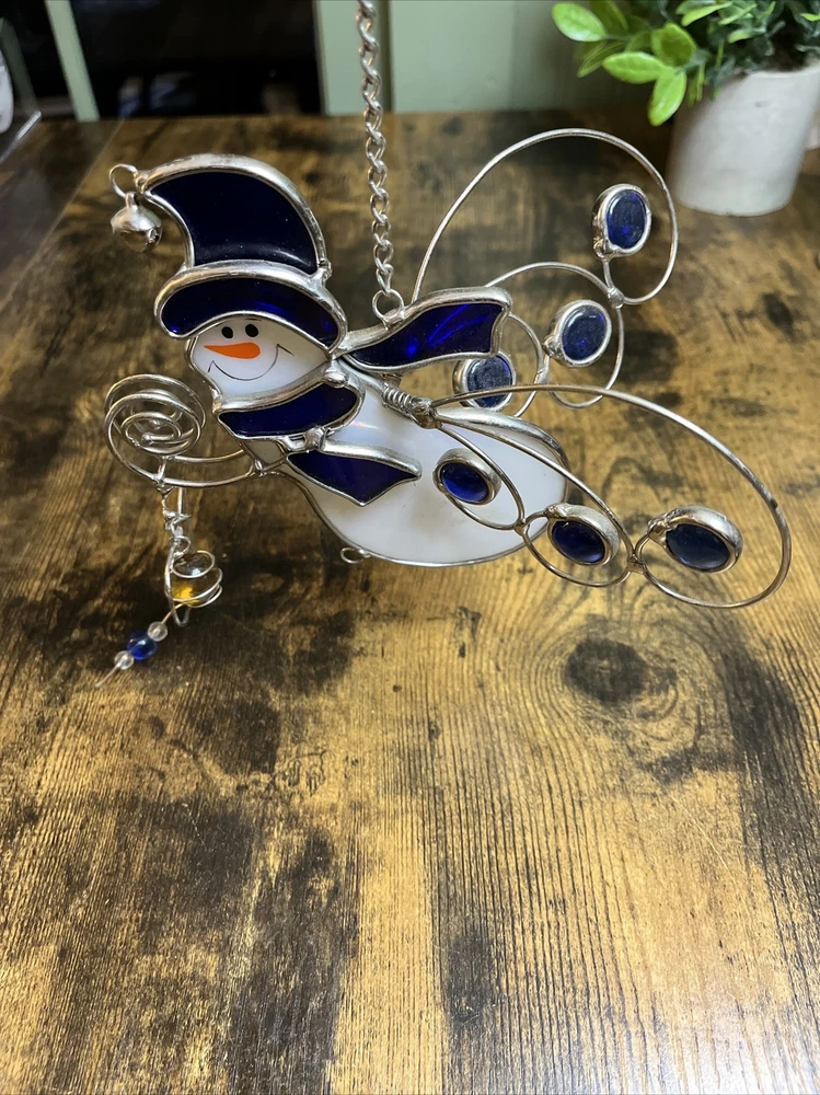Add a touch of holiday magic to your home with this vintage snowman hanging sun catcher. Crafted from stained glass and metal, this medium-sized suncatcher features a colorful design of a snowman in a metallic finish. It is perfect for adults and will make a great addition to your home décor. Please note that the wind chimes are missing from this item. This suncatcher is ideal for those who love to decorate their living space with unique and charming pieces. Hang it in a window or on a wall to add a festive touch to any room. PLEASE NOTE: this may have been a windchime but is missing chimes. Selling as found and as is.