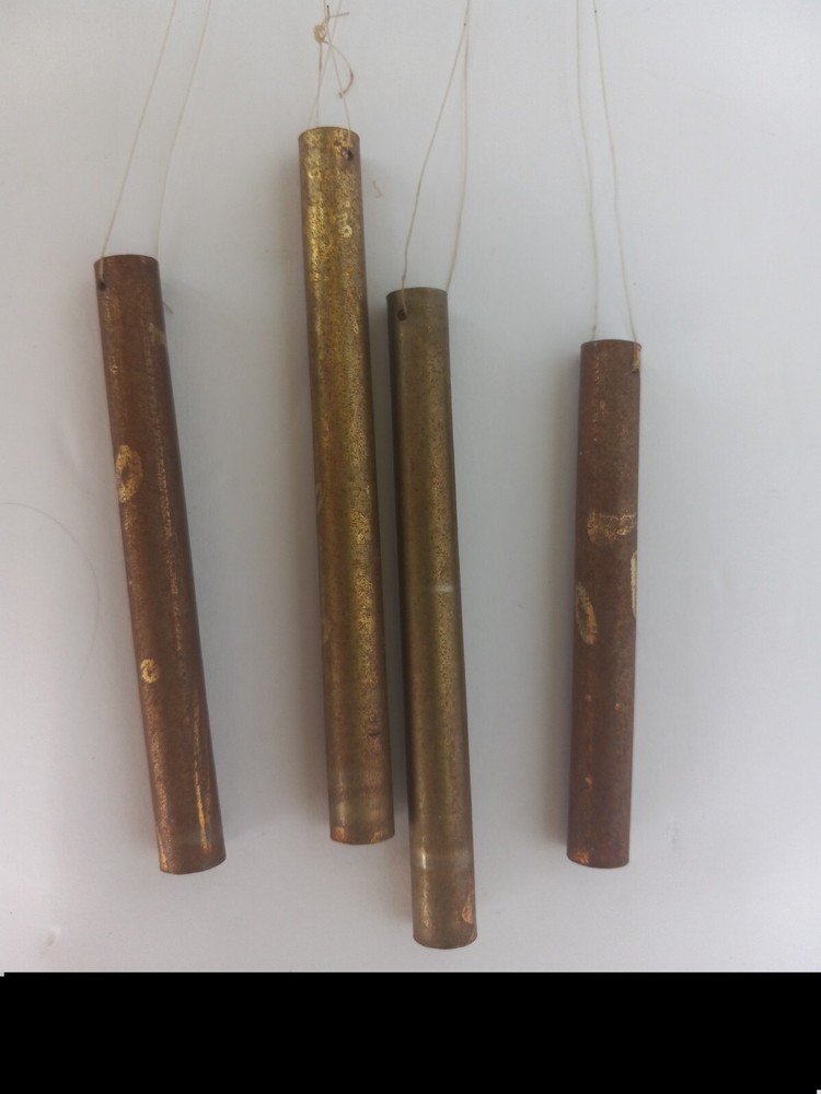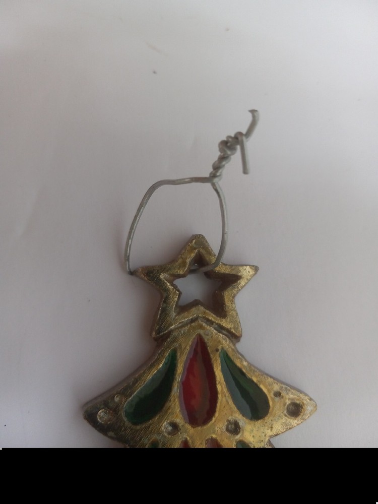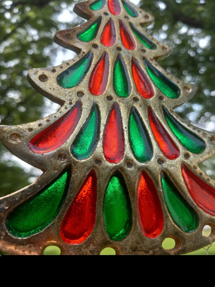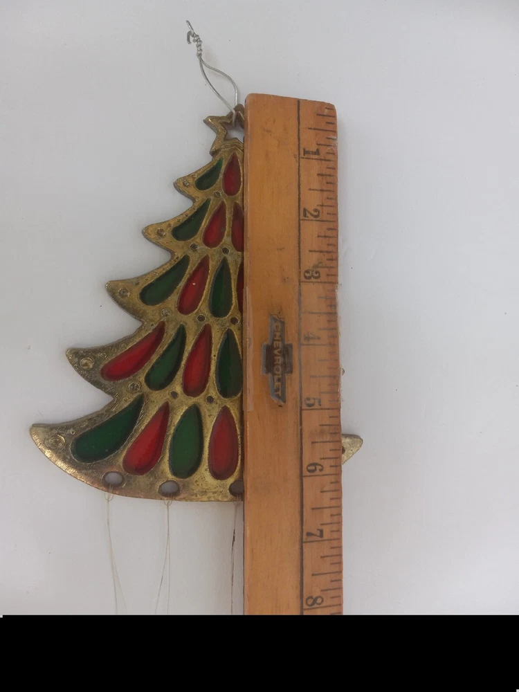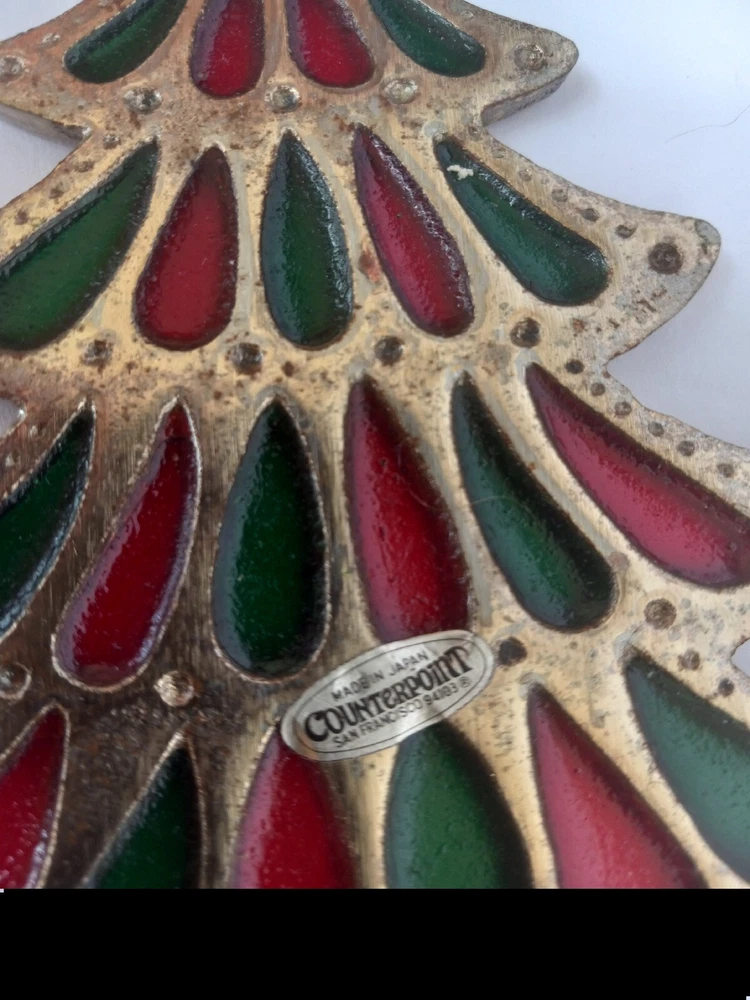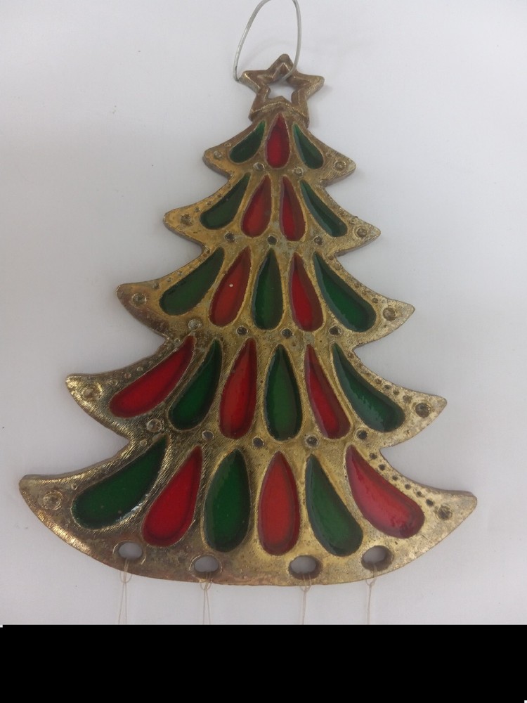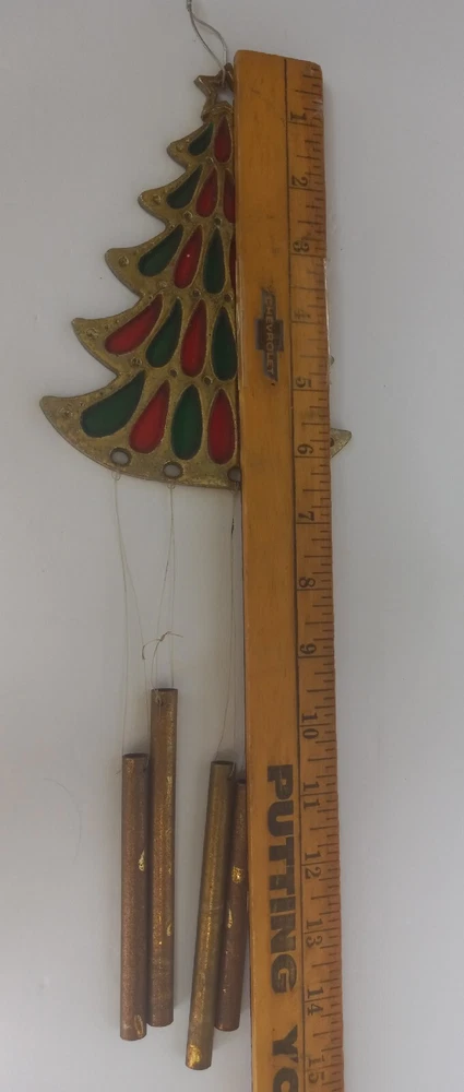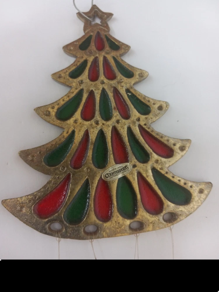 Vintage Stained Glass and Cast Metal Christmas Tree Wind Chime. Made by Counterpoint San Francisco in Japan. Wind chimes seem to be attached with fishing line and there is silver wire at the top in the star to hang. This is in vintage used condition and as such shows signs of wear and use. E4