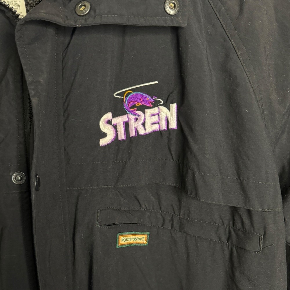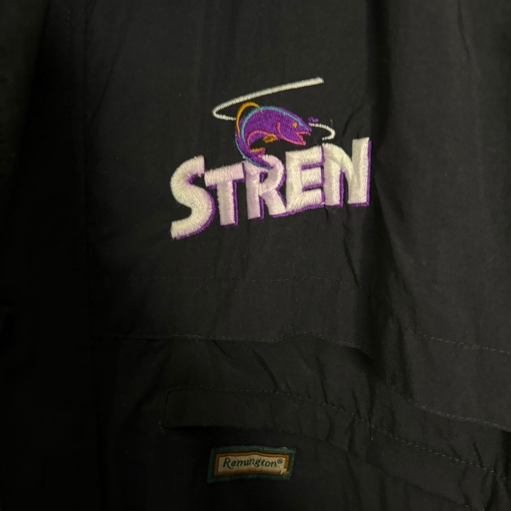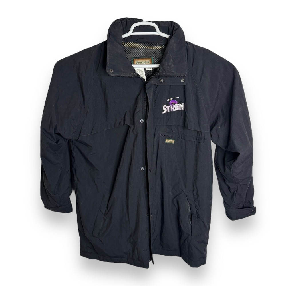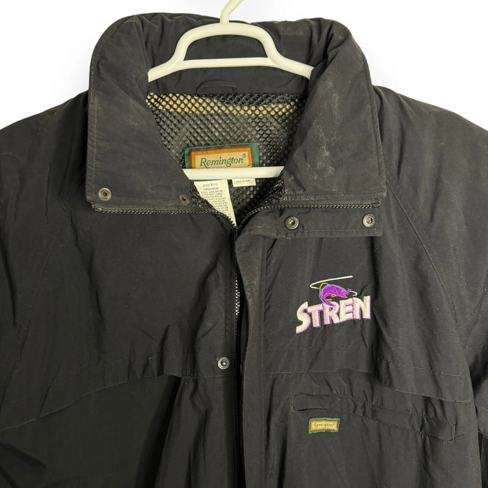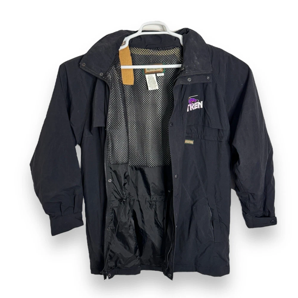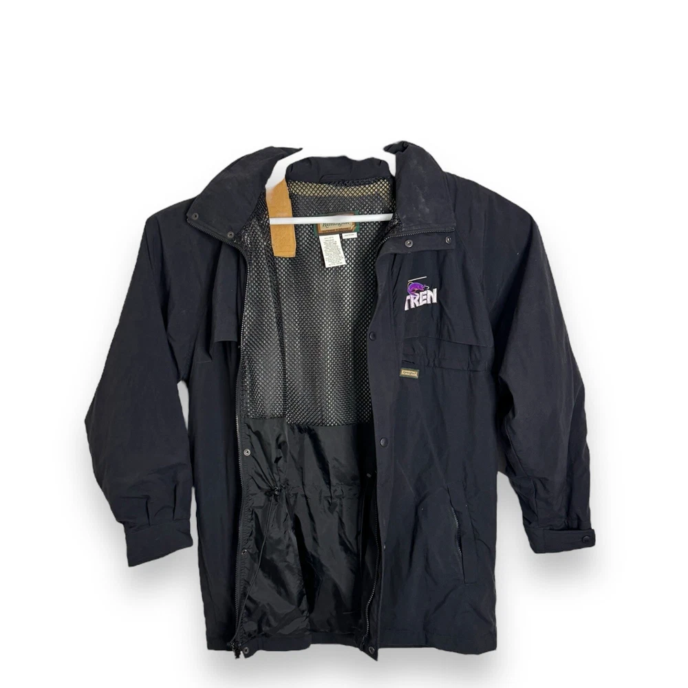 This vintage Remington fishing racing jacket is a limited edition item that will make a statement in any wardrobe. The black jacket features a logo pattern, with a zip and button closure, and is made from nylon outer shell material with a polyester lining. The jacket is available in size L, with a relaxed fit, and is suitable for all seasons including travel, party/cocktail, casual, formal, workwear, and business occasions. The jacket is designed with weathergear, waterproof, removable hood, and wind-resistant features, making it perfect for fishing and racing activities. The limited edition jacket also comes with zipped pockets, quick dry, and hooded design. Get ready to turn heads with this stylish and practical jacket. It says large but measurements are like an XL AWESOME Vintage Jacket!