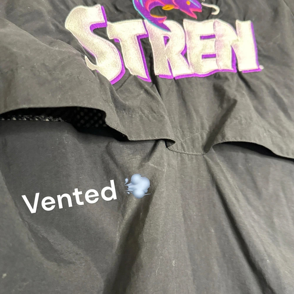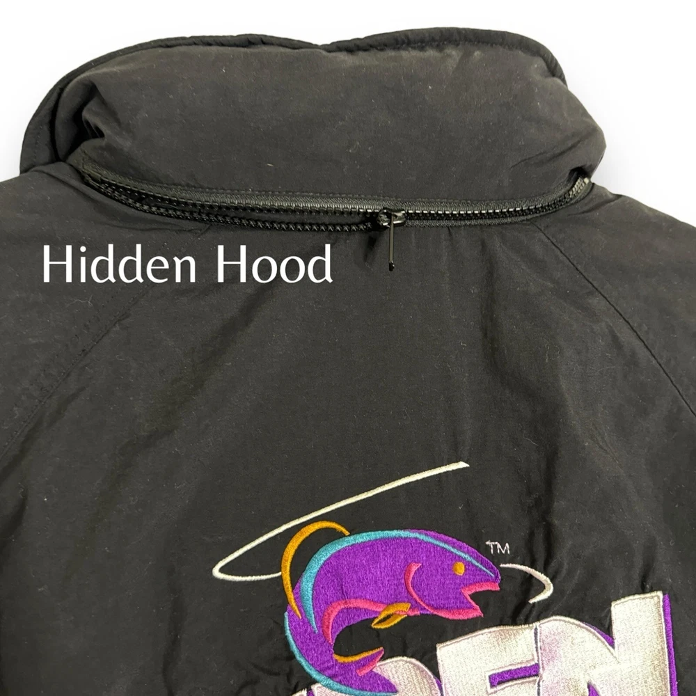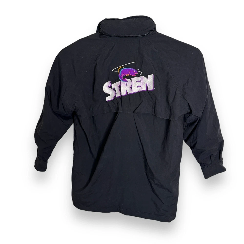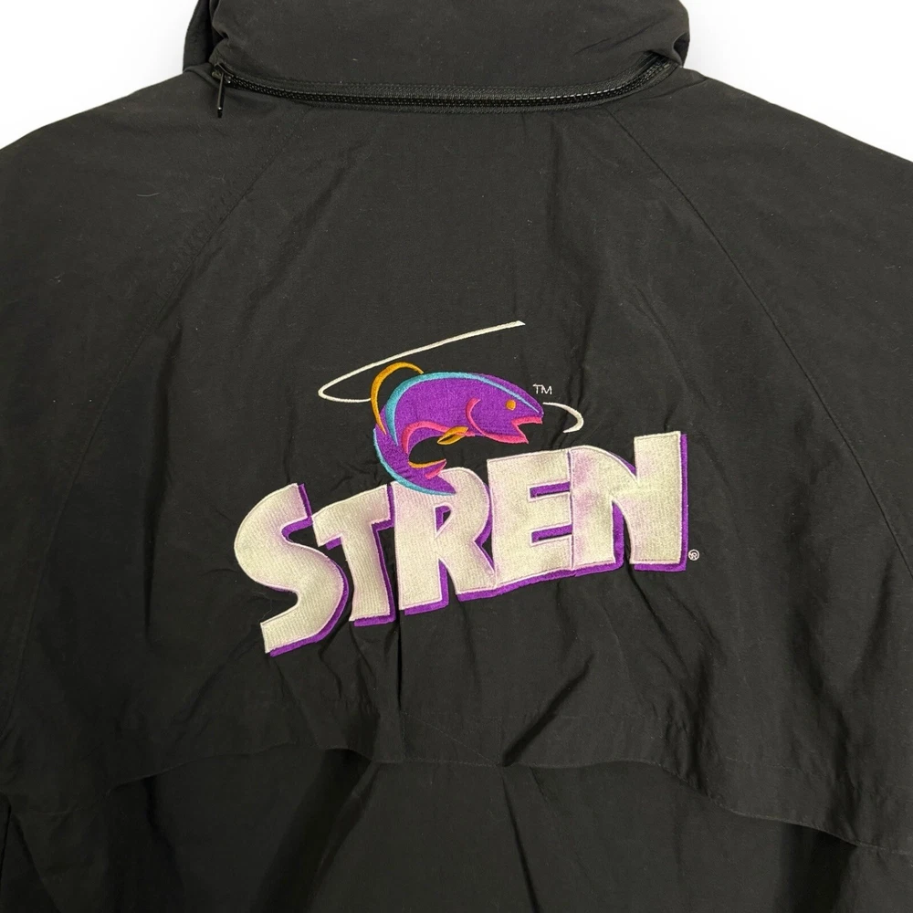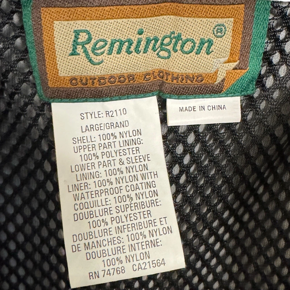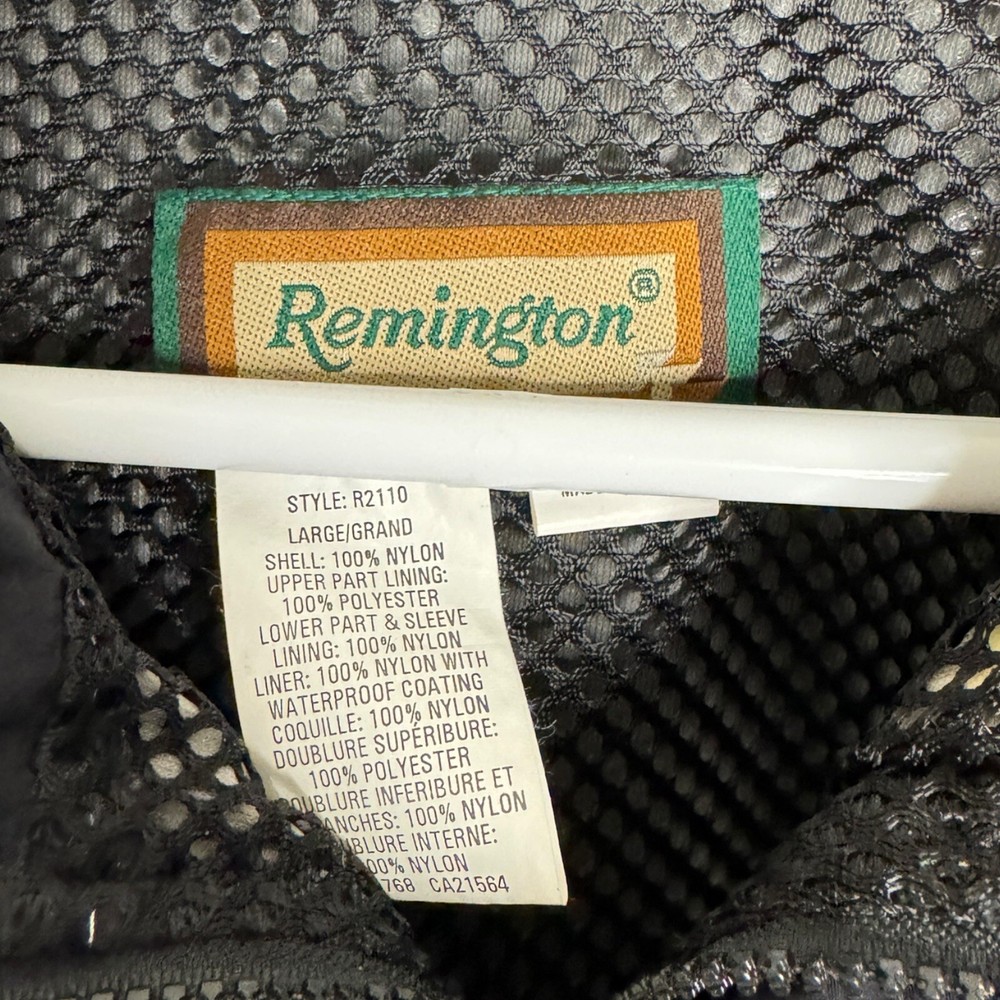 This vintage Remington fishing racing jacket is a limited edition item that will make a statement in any wardrobe. The black jacket features a logo pattern, with a zip and button closure, and is made from nylon outer shell material with a polyester lining. The jacket is available in size L, with a relaxed fit, and is suitable for all seasons including travel, party/cocktail, casual, formal, workwear, and business occasions. The jacket is designed with weathergear, waterproof, removable hood, and wind-resistant features, making it perfect for fishing and racing activities. The limited edition jacket also comes with zipped pockets, quick dry, and hooded design. Get ready to turn heads with this stylish and practical jacket. It says large but measurements are like an XL AWESOME Vintage Jacket!