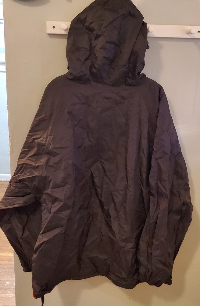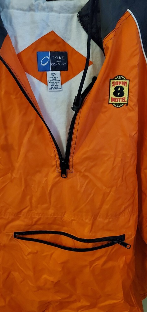 Embrace the retro style with this vintage Super Motel 8 hooded rain jacket. This orange and black jacket features a solid pattern, a zip closure, and a removable hood. It is made of nylon fabric with a cotton lining, making it both water-resistant and wind-resistant. Perfect for travel, parties, workwear, or casual outings, this 2XL jacket has zipped pockets and a 1/4 zip. It's an all-season jacket that is suitable for winter, summer, fall, and spring. The jacket bears the logos of both the manufacturer, Port and Company, and the Super Motel 8. It has a hipster, movie-inspired style, and is ideal for those who love the 80s and 90s.
