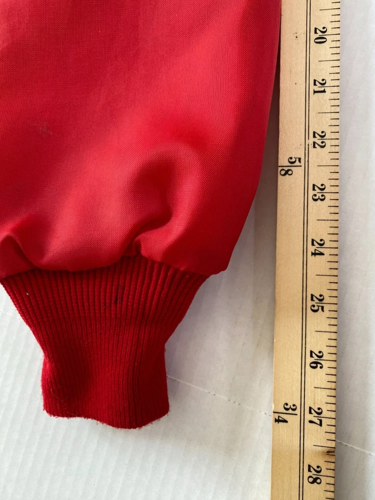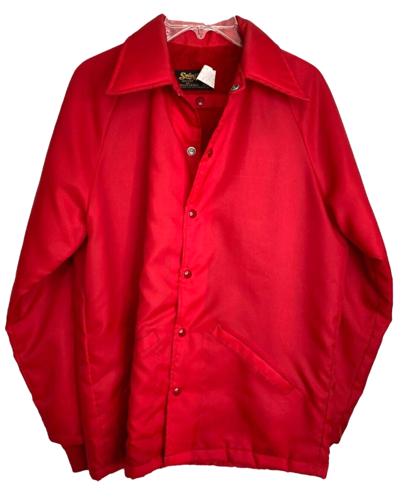 This vintage Swingster windbreaker is perfect for any occasion, whether it's for travel, casual wear, or work. Jacket Body Lining is acrylic and jacket sleeve lining is a quilted acrylic. The drawstring and snap closure add a touch of convenience, while the long sleeves and collared neckline provides extra warmth and protection against the wind and water. Made of soft and durable nylon fabric, this wind-resistant and waterproof jacket is machine washable and easy to care for. Size S Shell: 100% Nylon - Lining: 100% Acrylic Face/100% Polyester Back - Sleeve Lining: 100% Nylon/100% Acrylic Fill - Machine Wash Gently Used with no Flaws noted but does have several small stains at bottom of the jacket. See Photos for closer details. Approx. Measurements: Length 29" Side to Side 21" Hem Circumference 41" Sleeve Length 27" Made in United States Fast Shipper – usually ships same day or next business day. Reasonable offers welcome.