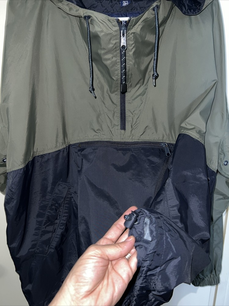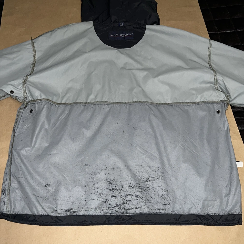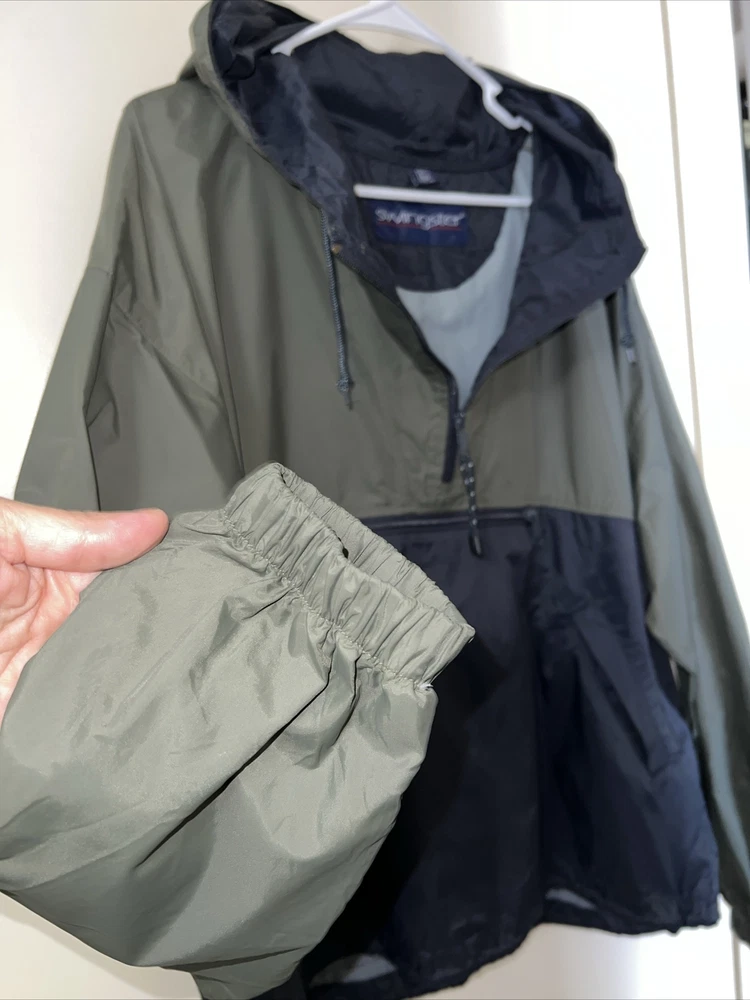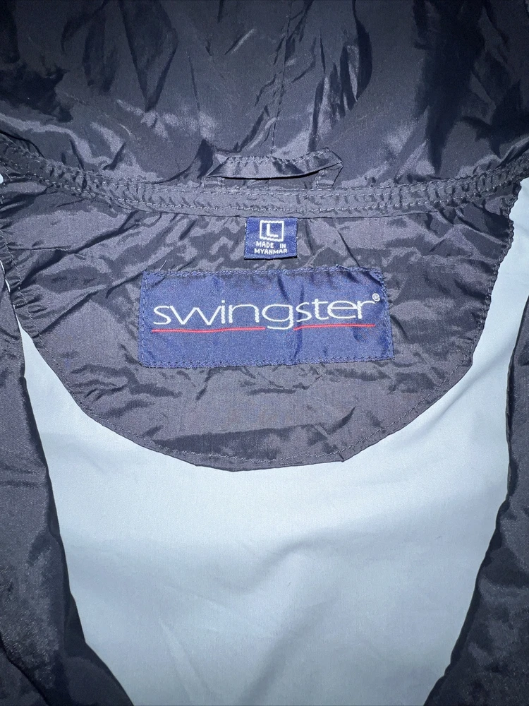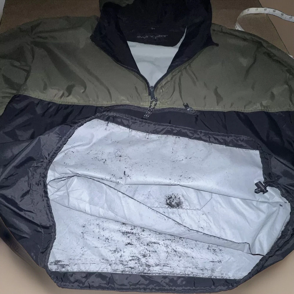 PRE-OWNED. Good used condition. The outside of jacket is in great shape. No snags, stains, rips, tears, peeling or piling on the outside. All drawstrings and zipper closures have been tested and are in good working condition. Care instructions state this item is machine washable and tumble dry low. The inside lining shows signs of possibly being washed and placed in the dryer a bit longer than necessary. It does not affect the outside appearance at all. Please refer to all photos prior to purchasing. This is a beautiful hooded windbreaker! This vintage Swingster pullover jacket is a stylish and versatile addition to any wardrobe. The olive and black color solid pattern make it a perfect choice for any occasion, whether it's casual wear, workwear or travel. The jacket features a mid-length, windproof design with a hood, 1/4 zip and drawstring closures, making it suitable for all seasons. The jacket is made of nylon and has a breathable, wind-resistant fabric type. It also includes various accents such as drawstrings, air holes, zipper and pockets. The jacket is unlined and has a regular size type, suitable for men. The Swingster brand is known for its quality and durability, making this jacket a great investment for any outdoor activity, whether it's hiking, walking or gym and training.