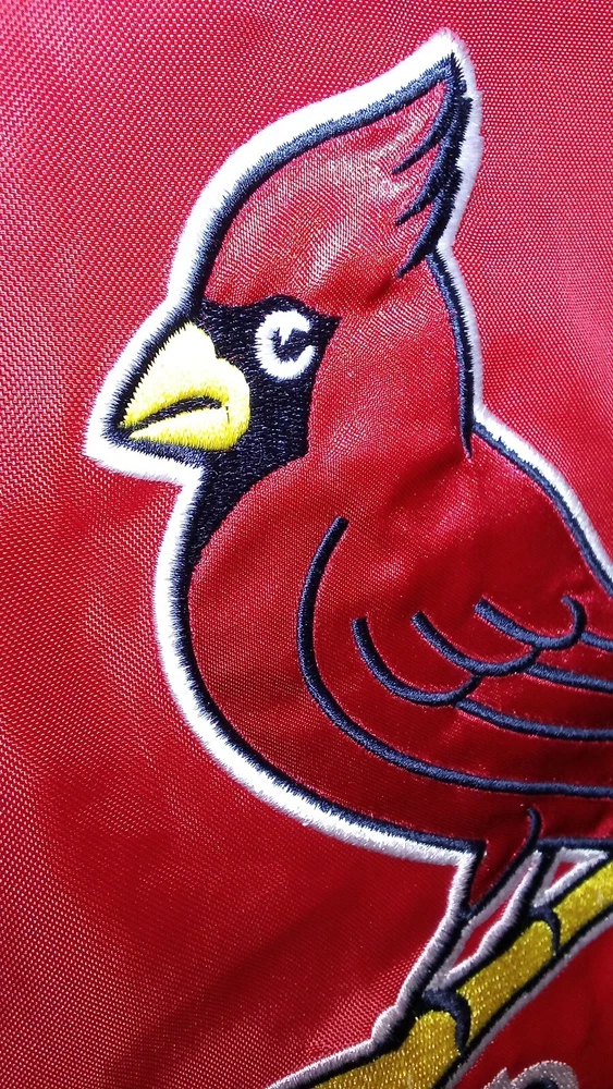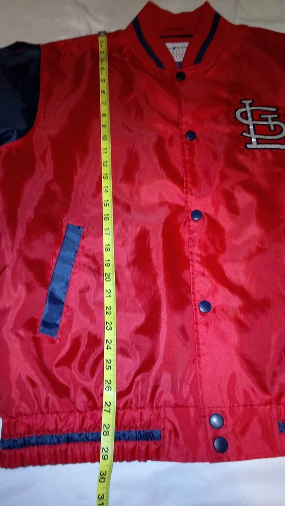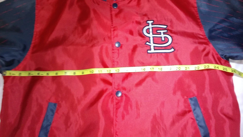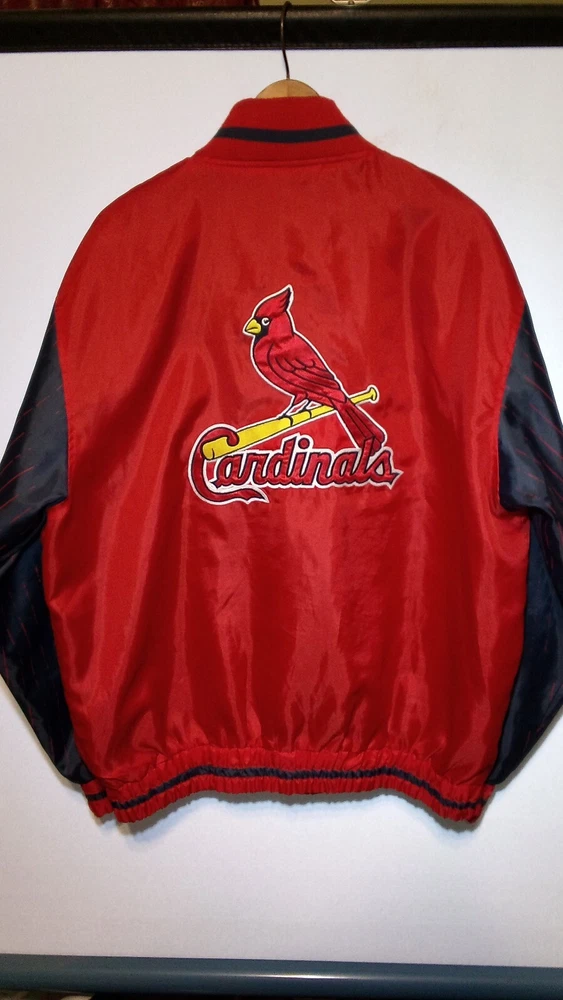 Vintage Sz Lg St. Louis Cardinals Snap Close Windbreaker Genuine Merchandise MLB. Clean with no stains or tears or any visible defects that I can see. Normal signs of wash and wear only. Big cardinal embroidery on the back. See pictures for details and condition and dimensions before purchasing. Money back if you aint happy