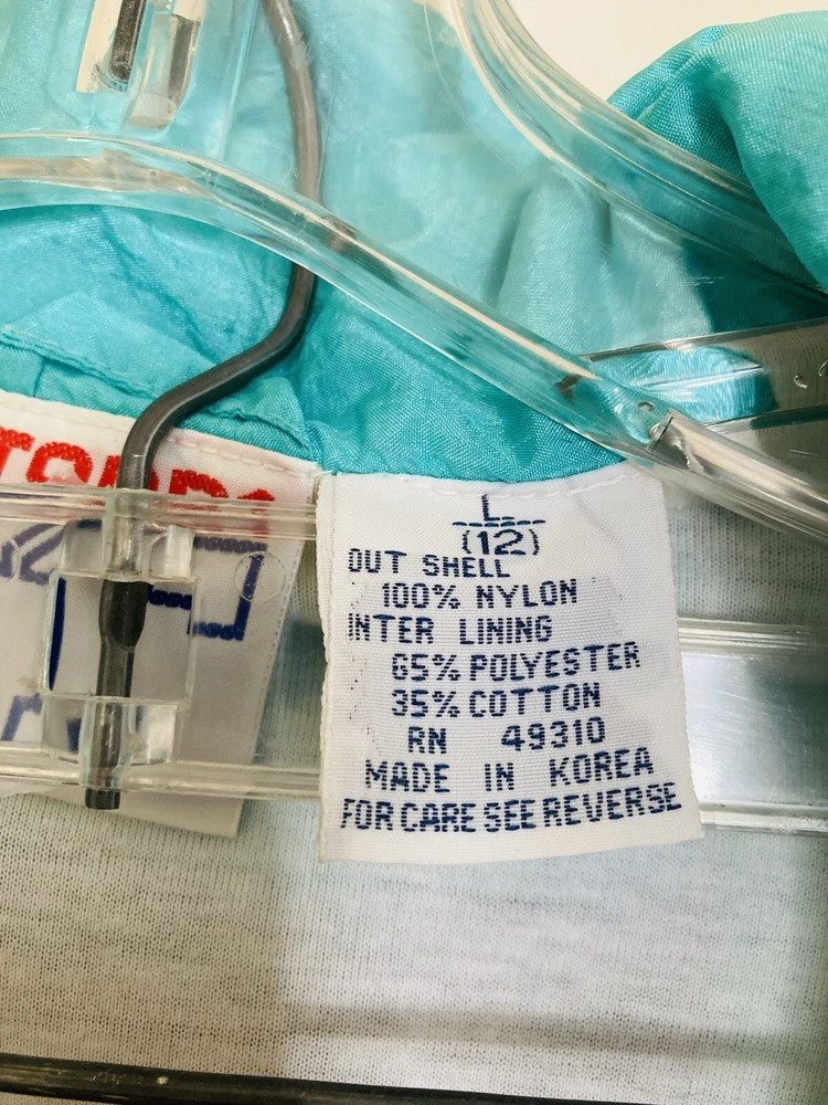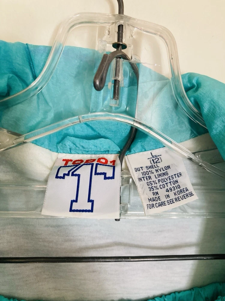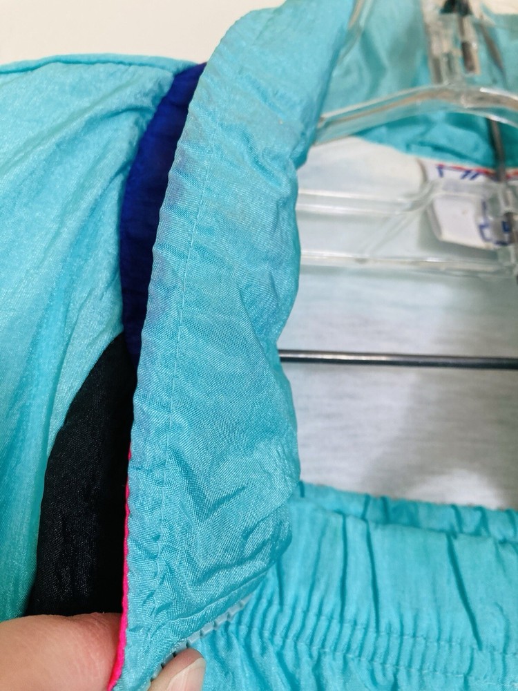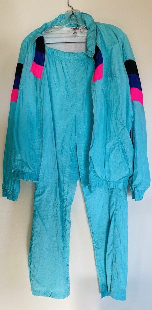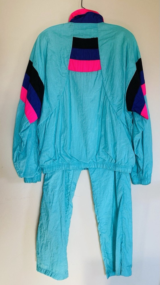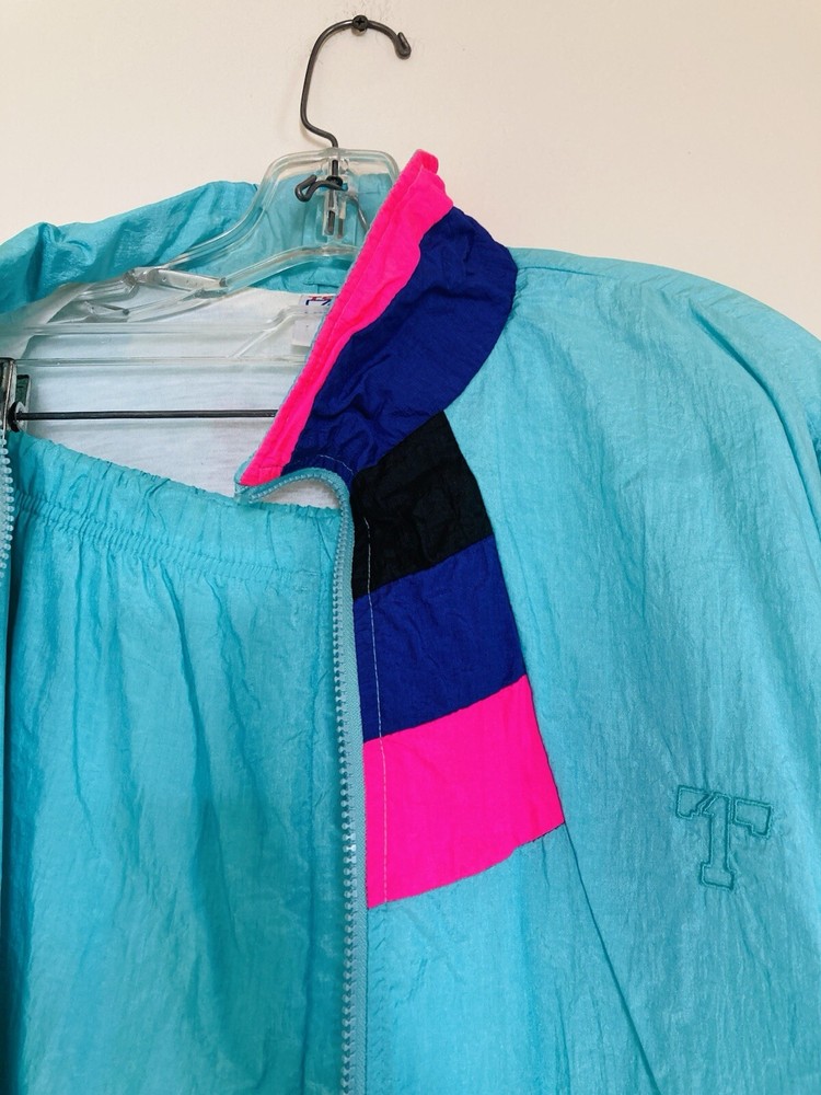 Awesome vintage 1980s - 1990s nylon tracksuit in a bright turquoise blue with hot pink, dark purple, and black details. This tracksuit is comfortably lined. Mind color bleeding on the color where the pink meets the blue. The jacket has two pockets, while the pants have two side pockets and one rear pocket. Feel free to message with any questions!