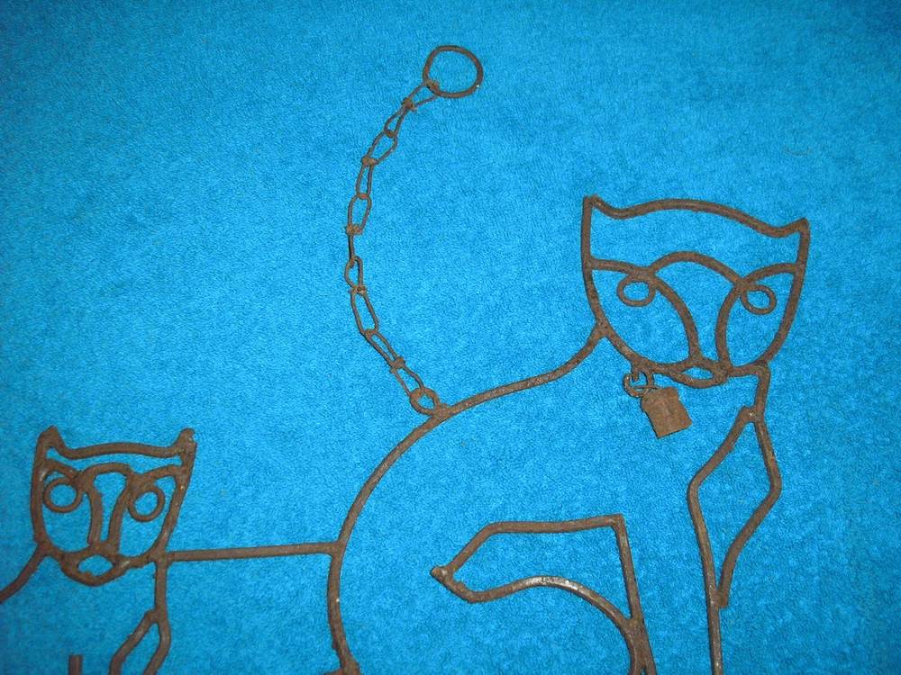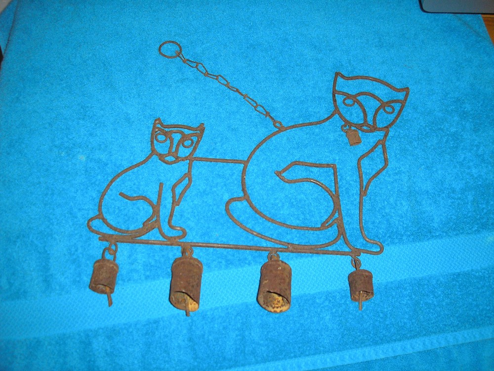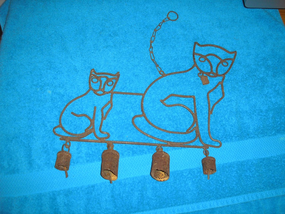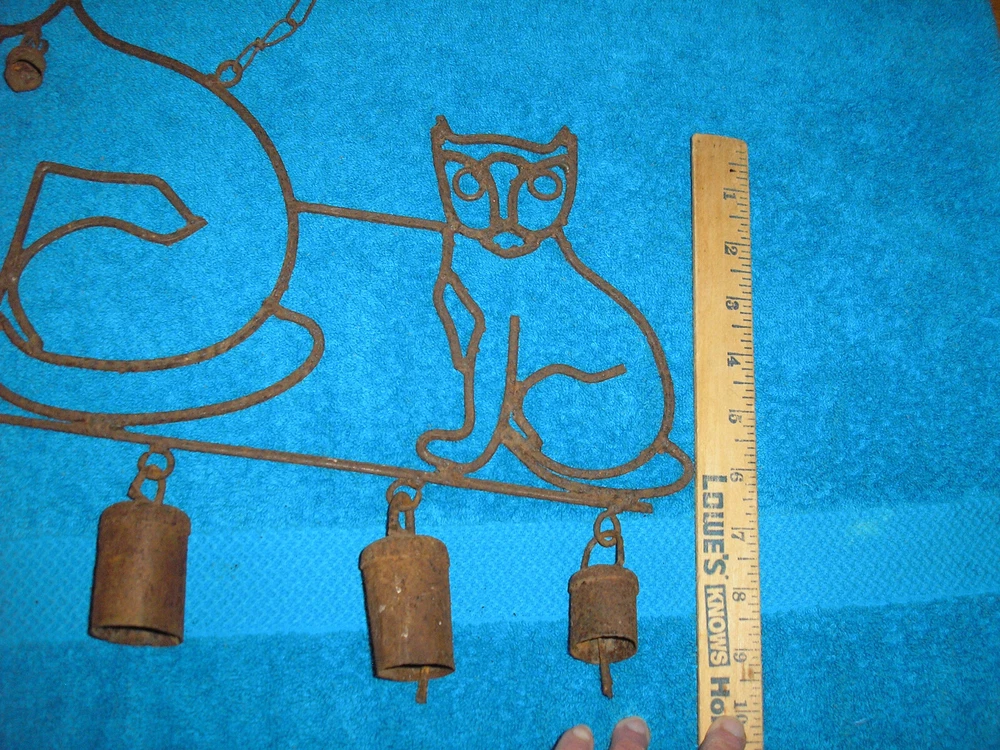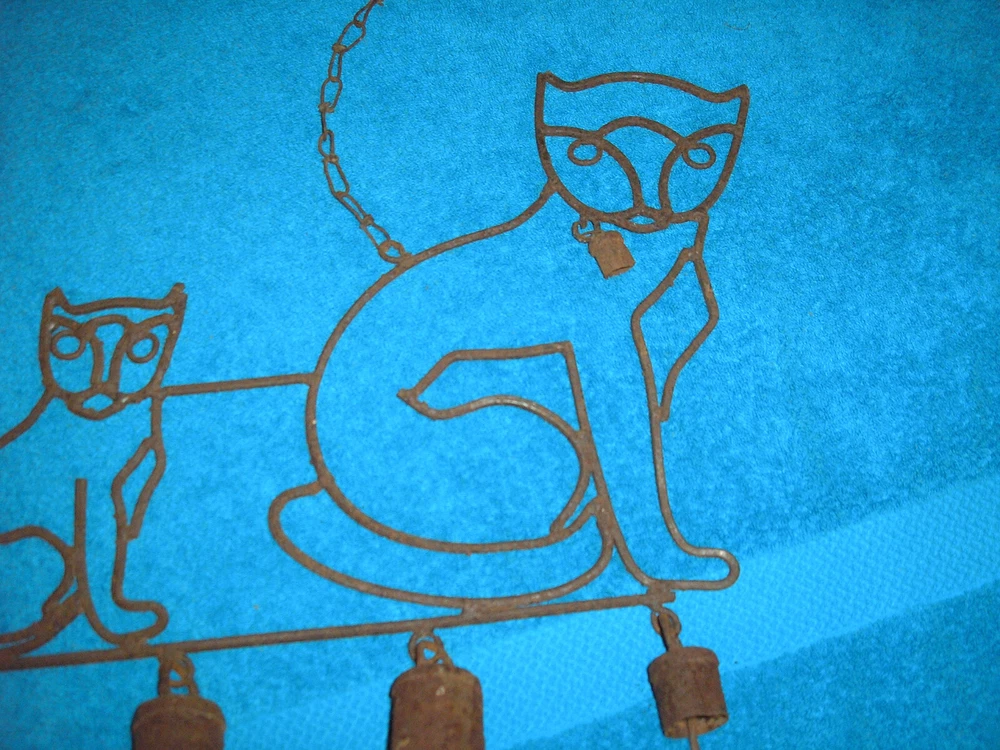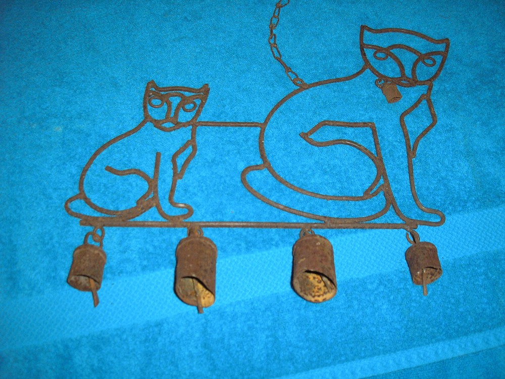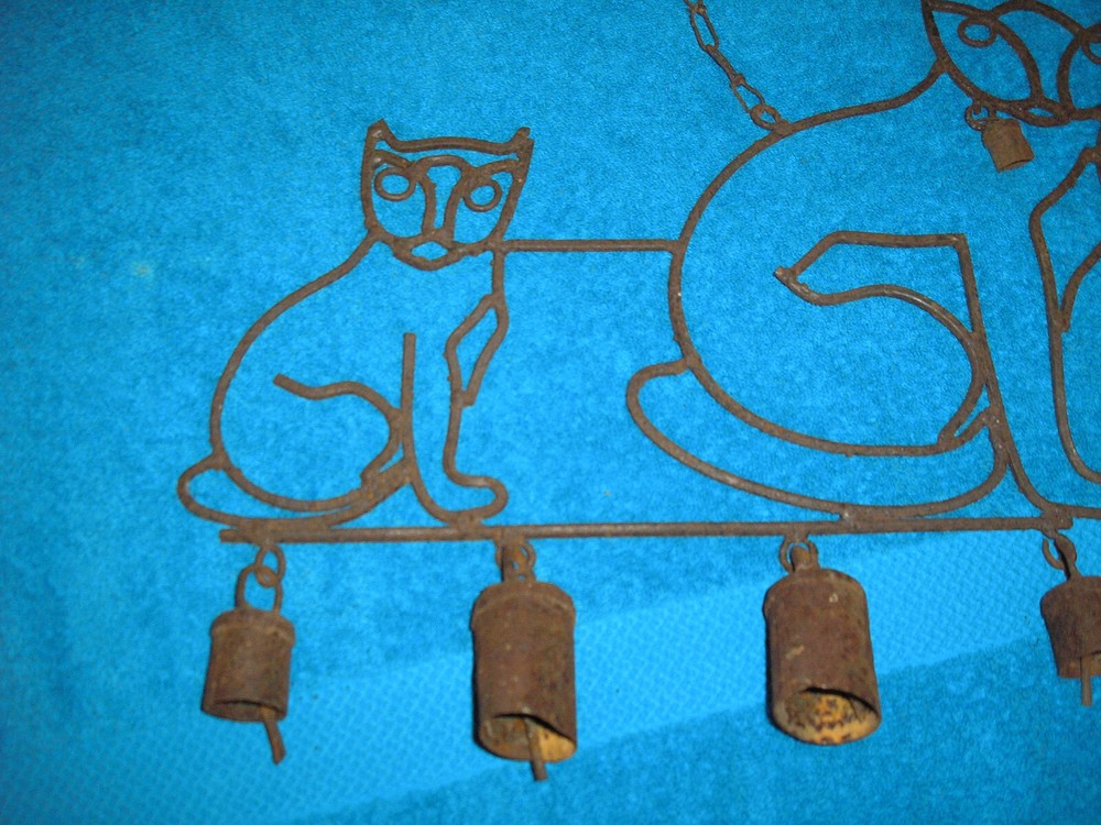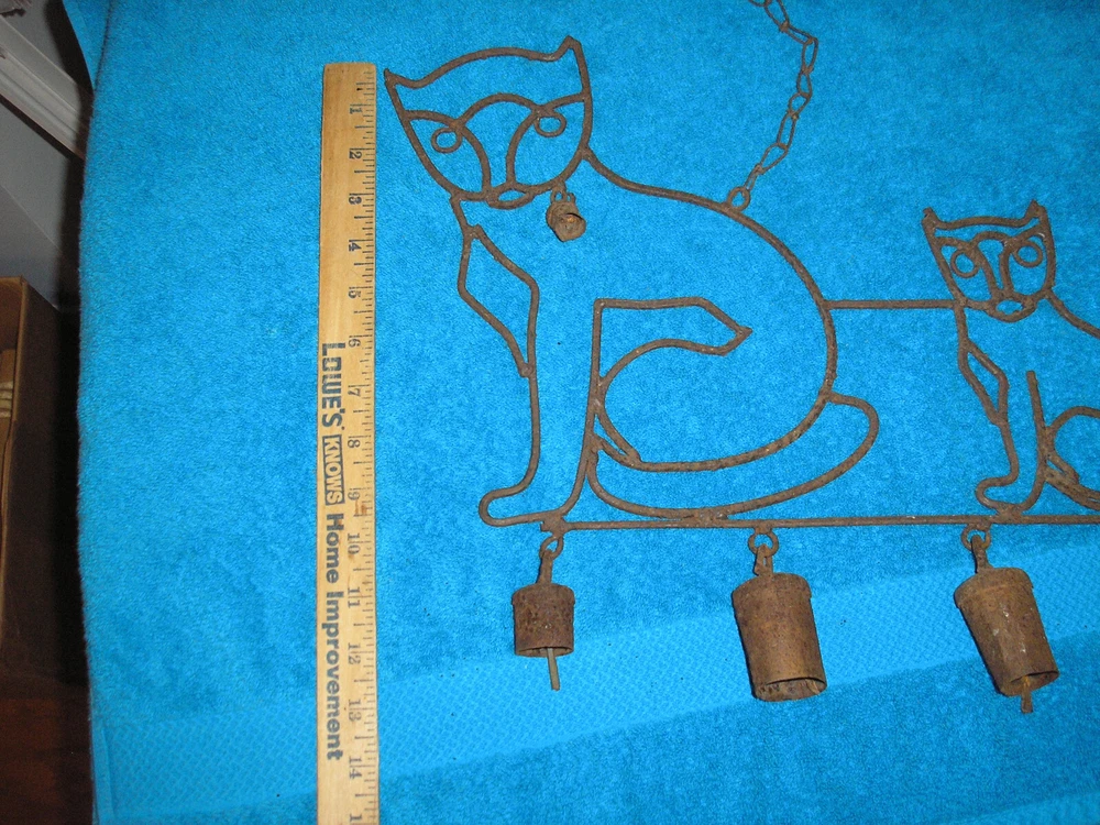 Vintage TWO CAT WIND CHIME Rusty Metal Iron Primitive Bells Clappers Art Retro Rare wind chime of primitive Mama cat and baby Kitten with bells and clappers. Mama cat has a small bell, while it has a clapper inside, it is not freely moving so it makes no chime sound. Also appears to be not as long as it should be. May be able to have a new one welded inside. The four larger bells at the bottom all have clappers and do make chime noise. Entire piece is approximately 15" long, not counting bells, mama cat measures approximately 9.5" high, while baby kitty measures 6.5" high. Has light chain and ring for hanging. Entire wind chime is nicely patina'd (rusted) from years of outdoor display on the side of family barn. All original, unusual and neat. Nice design and seems rare as I haven't seen another. Sturdy, no cracks. Please view all pictures. Ships USPS ground advantage.