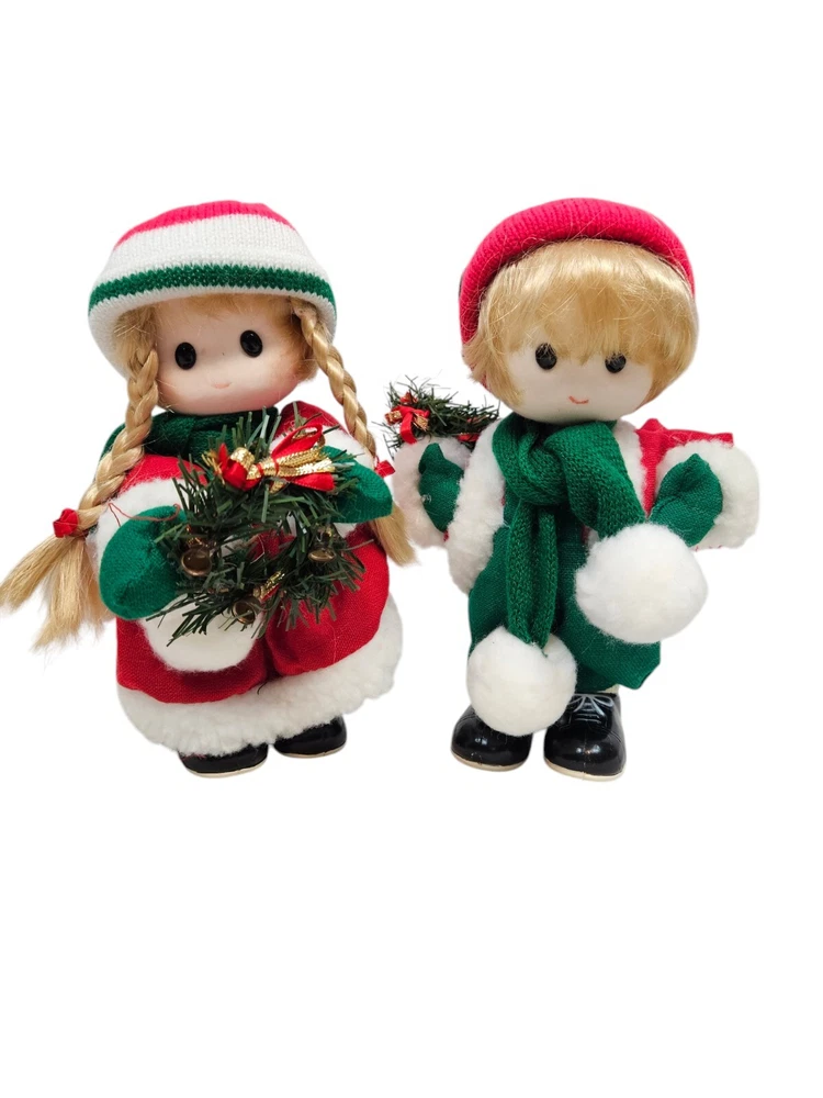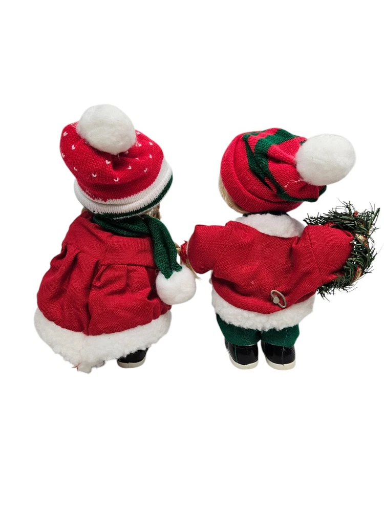 Absolutely charming vintage set! The wind-up mechanism works perfectly, playing a sweet jingle bells tune while the dolls' heads move. Their festive outfits and wreaths add such a nostalgic holiday touch—great condition for a pre-loved item. Perfect for a Christmas display!