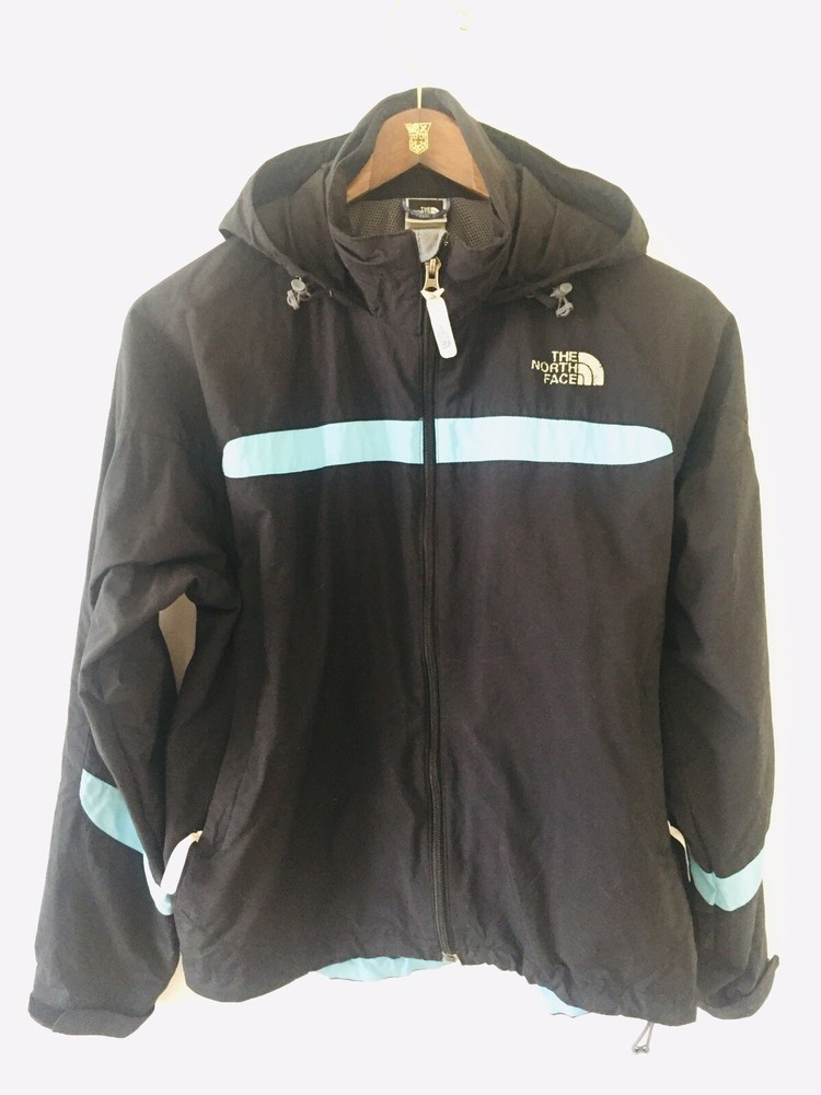 Vintage The North Face Rain Wind Jacket Women's Size S/P Stripe. Condition is Pre-owned. Shipped with USPS Priority Mail. Color is black/navy with a cute baby blue stripe along the back and sleeves an...